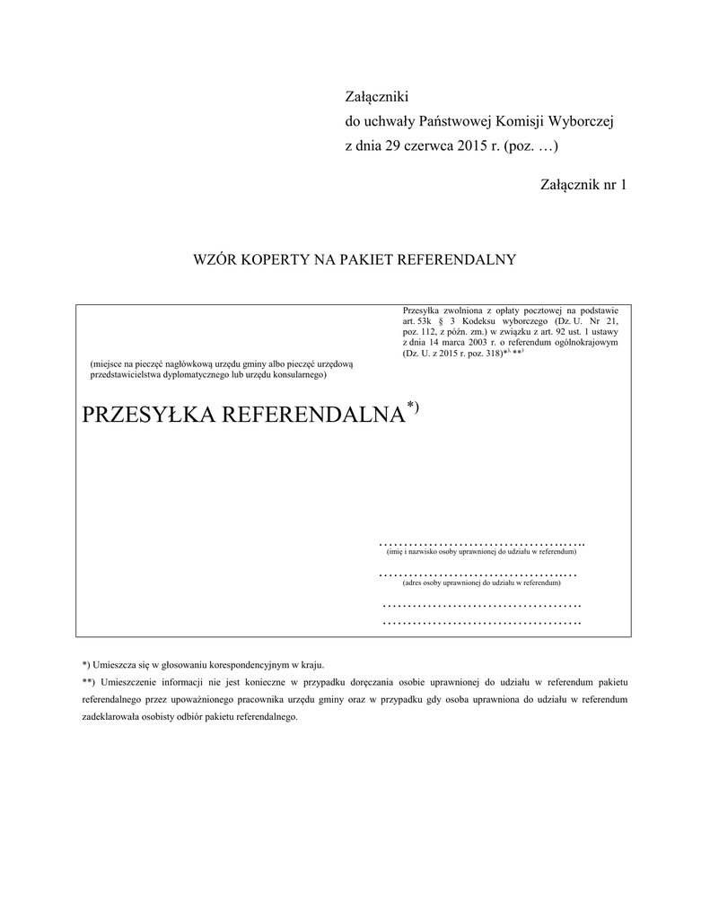 Załączniki do uchwały Państwowej Komisji Wyborczej z dnia 29 czerwca 2015 r. (poz. …) Załącznik nr 1 WZÓR KOPERTY NA PAKIET REFERENDALNY Przesyłka zwolniona z opłaty pocztowej na podstawie art. 53k § 3 Kodeksu wyborczego (Dz. U. Nr 21, poz. 112, z późn. zm.) w związku z art. 92 ust. 1 ustawy z dnia 14 marca 2003 r. o referendum ogólnokrajowym (Dz. U. z 2015 r. poz. 318)*), **) (miejsce na pieczęć nagłówkową urzędu gminy albo pieczęć urzędową przedstawicielstwa dyplomatycznego lub urzędu konsularnego) PRZESYŁKA REFERENDALNA*) ……………………………….….. (imię i nazwisko osoby uprawnionej do udziału w referendum) ……………………………….… (adres osoby uprawnionej do udziału w referendum) …………………………………. …………………………………. *) Umieszcza się w głosowaniu korespondencyjnym w kraju. **) Umieszczenie informacji nie jest konieczne w przypadku doręczania osobie uprawnionej do udziału w referendum pakietu referendalnego przez upoważnionego pracownika urzędu gminy oraz w przypadku gdy osoba uprawniona do udziału w referendum zadeklarowała osobisty odbiór pakietu referendalnego. Załącznik nr 2 WZÓR KOPERTY ZWROTNEJ Przesyłka zwolniona z opłaty pocztowej na podstawie art. 53k § 3 Kodeksu wyborczego (Dz. U. Nr 21, poz. 112, z późn. zm.) w związku z art. 92 ust. 1 ustawy z dnia 14 marca 2003 r. o referendum ogólnokrajowym (Dz. U. z 2015 r. poz. 318)*) PRZESYŁKA REFERENDALNA*) Obwodowa Komisja do spraw Referendum Nr ……..…….… w ………………………………………. …………………………….……...……. (adres obwodowej komisji do spraw referendum) …………………………….……...…. *) ……………………………….……….. (adres konsula) ……………………………….……….. ……………………………….……….. (przesyłka dla Obwodowej Komisji do spraw Referendum Nr …)**) *) Umieszcza się w głosowaniu korespondencyjnym w kraju. **) Umieszcza się w głosowaniu korespondencyjnym za granicą. Załącznik nr 3 WZÓR KOPERTY NA KARTĘ DO GŁOSOWANIA Koperta na kartę do głosowania Załącznik nr 4 WZÓR OŚWIADCZENIA O OSOBISTYM I TAJNYM ODDANIU GŁOSU Oświadczenie o osobistym i tajnym oddaniu głosu Ja, ……………………………...…………………..,*) (imię-imiona i nazwisko osoby uprawnionej do udziału w referendum) numer ewidencyjny PESEL*) oświadczam, że osobiście i w sposób tajny oddałem(-am) głos w referendum ogólnokrajowym zarządzonym na dzień …………………………………*). (data referendum) …………………………………**) (miejscowość, data) ……………………………..…..**) (podpis osoby uprawnionej do udziału w referendum) *) Wypełnia urząd gminy lub konsul. **) Jeżeli osoba uprawniona do udziału w referendum nie może lub nie umie złożyć podpisu, oświadczenie podpisuje za nią inna osoba przez nią upoważniona, czyniąc o tym wzmiankę obok podpisu; w takim przypadku osoba upoważniona wpisuje również nazwę miejscowości i datę sporządzenia oświadczenia. Załącznik nr 5 WZÓR INSTRUKCJI GŁOSOWANIA KORESPONDENCYJNEGO W KRAJU W REFERENDUM OGÓLNOKRAJOWYM Instrukcja głosowania korespondencyjnego w kraju 1. Osoba uprawniona do udziału w referendum otrzymuje pakiet referendalny zawierający: 1) zaadresowaną kopertę zwrotną; 2) kartę do głosowania; 3) kopertę na kartę do głosowania; 4) oświadczenie o osobistym i tajnym oddaniu głosu; 5) niniejszą instrukcję. Pakiet referendalny, na żądanie osoby uprawnionej do udziału w referendum, może zawierać również nakładkę na kartę do głosowania sporządzoną w alfabecie Braille’a. 2. Na karcie do głosowania osoba uprawniona do udziału w referendum oddaje głos, w sposób określony w informacji znajdującej się w dolnej części karty do głosowania. Należy pamiętać, że znakiem „x” są dwie linie przecinające się w obrębie kratki przeznaczonej na oddanie głosu. 3. Po oddaniu głosu należy kartę do głosowania umieścić w kopercie oznaczonej „Koperta na kartę do głosowania” i kopertę tę zakleić. Niezaklejenie koperty na kartę do głosowania spowoduje, że karta do głosowania w niej się znajdująca nie będzie uwzględniona przy ustalaniu wyników głosowania. Do koperty na kartę do głosowania nie wkłada się oświadczenia o osobistym i tajnym oddaniu głosu. 4. Zaklejoną kopertę na kartę do głosowania należy włożyć do koperty zwrotnej zaadresowanej na adres obwodowej komisji do spraw referendum. 5. Do koperty zwrotnej należy także włożyć oświadczenie o osobistym i tajnym oddaniu głosu. Przed włożeniem oświadczenia do koperty należy wpisać na nim miejscowość i datę jego sporządzenia oraz własnoręcznie je podpisać. Jeżeli osoba uprawniona do udziału w referendum nie może lub nie umie złożyć podpisu, oświadczenie podpisuje za nią inna osoba przez nią upoważniona, czyniąc o tym wzmiankę obok podpisu; w takim przypadku osoba upoważniona wpisuje również nazwę miejscowości i datę sporządzenia oświadczenia. Niewłożenie oświadczenia do koperty zwrotnej lub niepodpisanie go spowoduje, że karta do głosowania nie będzie uwzględniona przy ustalaniu wyników głosowania. 6. Kopertę zwrotną należy zakleić i osobiście, okazując dokument tożsamości, nadać w placówce Poczty Polskiej na adres obwodowej komisji do spraw referendum najpóźniej: 1) w przedostatnim dniu roboczym poprzedzającym dzień, na który zarządzono referendum, tj. dnia … .*) – w placówce Poczty Polskiej usytuowanej na obszarze gminy, w której osoba uprawniona do udziału w referendum ujęta jest w rejestrze wyborców; 2) w trzecim dniu roboczym poprzedzającym dzień, na który zarządzono referendum, tj. dnia … .*) – w dowolnej placówce pocztowej Poczty Polskiej. W przypadku gdy niepełnospr