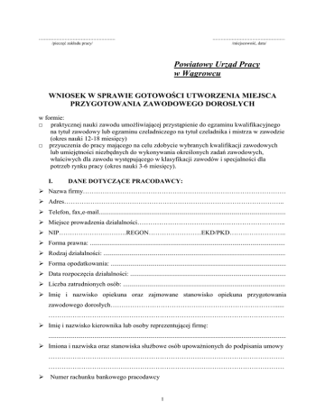 ........................................................ ..................................................... /pieczęć zakładu pracy/ /miejscowość, data/ Powiatowy Urząd Pracy w Wągrowcu WNIOSEK W SPRAWIE GOTOWOŚCI UTWORZENIA MIEJSCA PRZYGOTOWANIA ZAWODOWEGO DOROSŁYCH w formie: □ praktycznej nauki zawodu umożliwiającej przystąpienie do egzaminu kwalifikacyjnego na tytuł zawodowy lub egzaminu czeladniczego na tytuł czeladnika i mistrza w zawodzie (okres nauki 12-18 miesięcy) □ przyuczenia do pracy mającego na celu zdobycie wybranych kwalifikacji zawodowych lub umiejętności niezbędnych do wykonywania określonych zadań zawodowych, właściwych dla zawodu występującego w klasyfikacji zawodów i specjalności dla potrzeb rynku pracy (okres nauki 3-6 miesięcy). I. DANE DOTYCZĄCE PRACODAWCY: Nazwa firmy………………………………………………………………………………… Adres……………………………………………………………………………………….. Telefon, fax,e-mail.................................................................................................................. Miejsce prowadzenia działalności………………………………………………………….. NIP………………………….REGON……………………EKD/PKD…………………….. Forma prawna: ....................................................................................................................... Rodzaj działalności: ............................................................................................................... Forma opodatkowania: ........................................................................................................... Data rozpoczęcia działalności: ............................................................................................... Liczba zatrudnionych osób: ................................................................................................... Imię i nazwisko opiekuna oraz zajmowane stanowisko opiekuna przygotowania zawodowego dorosłych…………………………………………………………………...... ……………………………………………………………………………………………… Imię i nazwisko kierownika lub osoby reprezentującej firmę: ................................................................................................................................................. Imiona i nazwiska oraz stanowiska służbowe osób upoważnionych do podpisania umowy ……………………………………………………………………………………………… ……………………………………………………………………………………………… Numer rachunku bankowego pracodawcy 1 ……………………………………………………………………………………………... II. DANE DOTYCZĄCE ORGANIZACJI MIEJSCA PRZYGOTOWANIA ZAWODOWEGO DOROŁYCH: 1. Forma, nazwa i kod zawodu, ilość osób, wykształcenie oraz predyspozycje psychofizyczne i zdrowotne, czas trwania. Forma przygotowania Nazwa i kod zawodu wg zawodowego klasyfikacji zawodów Ilość Wykształcenie oraz dorosłych: szkolnictwa zawodowego osób predyspozycje a)praktyczna lub wg klasyfikacji psychofizyczne i nauka zawodu, zawodowej i specjalności zdrowotne b)przyuczenie do dla potrzeb rynku pracy pracy Czas trwania Wykaz zadań zawodowych przewidzianych do realizacji u pracodawcy: ……………………………………………………………………………………………… ……………………………………………………………………………………………… Wykaz nabywanych kwalifikacji zawodowych lub umiejętności: ……………………………………………………………………………………………… ……………………………………………………………………………………………… Opiekun osoby na przygotowaniu zawodowym dorosłych: - Imię i nazwisko: .................................................................................................................. - Stanowisko: ....................................................................................................................... 2 - Wykształcenie: .................................................................................................................... - Staż pracy w zawodzie obejmującym zadania zawodowe………………………………. -Doświadczenie w sprawowaniu nadzoru nad pracownikami, stażystami, praktykantami………………………………………………………..…………………… …………………………………………………………………………….…………….. - Telefon, e-mail……………………………………………………………………………. Miejsce odbywania przygotowania zawodowego dorosłych (adres) ………………………………………………………………………………………………. Sposób uzyskania przez uczestników wiedzy teoretycznej przewidzianej programem przygotowania zawodowego dorosłych niezbędnej do realizacji zadań zawodowych (jeśli za pośrednictwem instytucji szkoleniowej prosimy również o wskazanie okresu, w jakim będzie się to odbywało) ……………………………………………………………………………………………… ……………………………………………………………………………………………… Instytucje egzaminujące, w których może być przeprowadzony egzamin kwalifikacyjny, czeladniczy lub sprawdzający ……………………………………………………………………………………………… ……………………………………………………………………………………………… Wy
