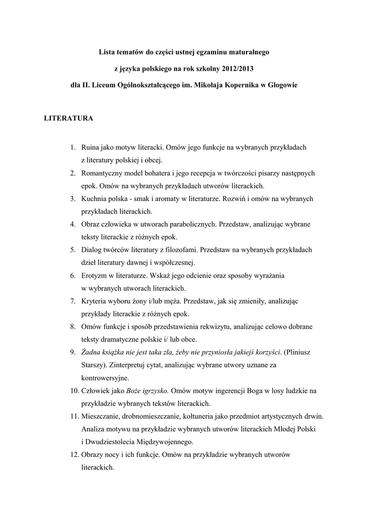 Lista tematów do części ustnej egzaminu maturalnego z języka polskiego na rok szkolny 2012/2013 dla II. Liceum Ogólnokształcącego im. Mikołaja Kopernika w Głogowie LITERATURA 1. Ruina jako motyw literacki. Omów jego funkcje na wybranych przykładach z literatury polskiej i obcej. 2. Romantyczny model bohatera i jego recepcja w twórczości pisarzy następnych epok. Omów na wybranych przykładach utworów literackich. 3. Kuchnia polska - smak i aromaty w literaturze. Rozwiń i omów na wybranych przykładach literackich. 4. Obraz człowieka w utworach parabolicznych. Przedstaw, analizując wybrane teksty literackie z różnych epok. 5. Dialog twórców literatury z filozofami. Przedstaw na wybranych przykładach dzieł literatury dawnej i współczesnej. 6. Erotyzm w literaturze. Wskaż jego odcienie oraz sposoby wyrażania w wybranych utworach literackich. 7. Kryteria wyboru żony i/lub męża. Przedstaw, jak się zmieniły, analizując przykłady literackie z różnych epok. 8. Omów funkcje i sposób przedstawienia rekwizytu, analizując celowo dobrane teksty dramatyczne polskie i/ lub obce. 9. Żadna książka nie jest taka zła, żeby nie przyniosła jakiejś korzyści. (Pliniusz Starszy). Zinterpretuj cytat, analizując wybrane utwory uznane za kontrowersyjne. 10. Człowiek jako Boże igrzysko. Omów motyw ingerencji Boga w losy ludzkie na przykładzie wybranych tekstów literackich. 11. Mieszczanie, drobnomieszczanie, kołtuneria jako przedmiot artystycznych drwin. Analiza motywu na przykładzie wybranych utworów literackich Młodej Polski i Dwudziestolecia Międzywojennego. 12. Obrazy nocy i ich funkcje. Omów na przykładzie wybranych utworów literackich. 13. Analizując wybrane przykłady literackie przedstaw, jaką rolę pełni sen i co mówi o śniącym go bohaterze. 14. Zinterpretuj motyw samotności z wyboru na przykładzie wybranych utworów literackich. 15. Zinterpretuj motyw teatrum mundi na wybranych przykładach literackich z różnych epok. 16. Literatura jako podręcznik savoir-vivre`u. Zanalizuj i zinterpretuj celowo dobrane utwory literackie. 17. Analizując wybrane utwory literackie, przedstaw relacje między rodzicami a dziećmi. 18. Omów wizje zaświatów w wybranych tekstach literackich różnych epok. 19. Na wybranych przykładach literackich różnych epok, omów role światła i ciemności. 20. Młodzi kontra starzy. Omów na wybranych przykładach literackich spory pokoleniowe. 21. Peerelowska przeszłość w literaturze najnowszej. Rozwiń zagadnienie, analizując celowo dobrane utwory literackie. 22. Kamienica a dom z betonu - takie same, czy różne toposy literackie? Rozważ na podstawie celowo dobranych utworów literackich. 23. Przy polskim stole. Przedstaw sposoby i funkcje prezentacji tradycji i sztuki kulinarnej w wybranych utworach literackich. 24. Motyw pieniądza w literaturze. Porównaj sposoby ich ujęcia w wybranych utworach literackich różnych epok. 25. Pisarka, artystka, kobieta w poszukiwaniu swego miejsca w świecie sztuki. Omów, analizując utwory z różnych epok. 26. Miejsca magiczne w życiu i twórczości polskich pisarzy. Omów, analizując biografie i wybrane utwory literackie. 27. Legenda poetów przeklętych. Przedstaw zjawisko w literaturze, analizując utwory wybranych artystów. 28. Różne obrazy prowincji w wybranych utworach literackich XIX i XX w. Przedstaw i porównaj ich funkcje. 29. Rola młodzieńczych doświadczeń w biografii bohaterów literackich. Ukaż różne ujęcia. 30. Symbolika kolorów w tekstach literackich. Omów na przykładzie wybranych utworów. 31. Tragizm, drwina, ironia w polskiej prozie XX wieku. Przedstaw sposoby kreowania świata w wybranych utworach literackich. 32. Obrazy kwiatów w literaturze. Przedstaw sposoby ich wykorzystania i funkcje w wybranych utworach. 33. Heroizacja i deheroizacja bohaterów w literaturze XX wieku. Omów sposoby i ich funkcje na wybranych utworach. 34. Przedstaw sposoby kreowania czasu i przestrzeni w literaturze XX wieku. Omów na przykładzie wybranych utworów. 35. Różne prezentacje sylwetek nauczycieli i uczniów w literaturze - różne sposoby pisania o szkole. Przedstaw, analizując wybrane utwory. 36. Analizując wybrane utwory literackie, przedstaw funkcje konwencji onirycznej w kreowaniu świata przedstawionego. 37. Krajobraz jako motyw literacki. Omów różne ujęcia i funkcje w wybranych utworach. 38. Analizując odpowiednie przykłady literackie, omów różne funkcje sakralizacji wybranych miejsc i krajobrazów. 39. Człowiek wobec presji kultury/tradycji/konwencji. Omów zagadnienie, analizując kreacje wybranych bohaterów literackich. 40. Różny stosunek do polskości wyrażony w dziełach literackich. Na podstawie wybranych utworów opisz typy postaw wobec Polski i Polaków. 41. Krytyka i uświęcenie codzienności w literaturze wybranej epoki. Porównaj różne przedstawienia w wybranych utworach. 42. „Swój” i „obcy”. Porównaj przedstawienie opozycyjnych wobec siebie typów bohatera literackiego z różnych epok. 43. Wizerunki artysty w utworach literackich. Zestaw i porównaj przykłady z różnych epok. 44. Obrazy strachu w literaturze i sposoby jego wywoływania. Opracuj i omów typologię na podstawie utworów literackich z różnych epok. 45. Literackie portrety kurtyzany. Porównaj przedstawienia zawarte w utworach należących do różnych rodzajów literackich. 46. Groteska jako sposób widzenia świata. Analiza wybranych przykładów literatury polskiej i obecnej. 47. Kreacyjna moc człowieka. Poeta wobec własnej twórczości. Omów zagadnienie na wybranych przykładach utworów autotematycznych. 48. Motyw alter ego w literaturze. Omów na wybranych przykładach literackich. 49. Postmodernizm w literaturze. Omów zjawisko na wybranych przykładach. 50. Saga jako gatunek literacki. Omów na wybranych przykładach z różnych epok. 51. Sposoby funkcjonowania mitu w literaturze. Omów na wybranych przykładach dzi