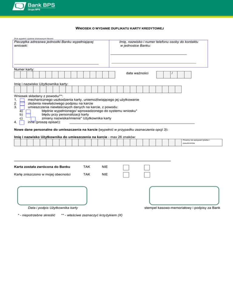 WNIOSEK O WYDANIE DUPLIKATU KARTY KREDYTOWEJ Druk wypełnić czytelnie drukowanymi literami Pieczątka adresowa jednostki Banku wypełniającej wniosek: Imię, nazwisko i numer telefonu osoby do kontaktu w jednostce Banku: _______________________________________ Numer karty: data ważności / Imię i nazwisko Użytkownika karty: Wniosek składany z powodu/**: 1. mechanicznego uszkodzenia karty, uniemożliwiającego jej użytkowanie 2. złożenia niewłaściwego podpisu na karcie 3. umieszczenia niewłaściwych danych na karcie, z powodu: a) błędnie wypełnionego/ wprowadzonego do systemu wniosku* b) błędu przy personalizacji karty c) zmiany nazwiska/imienia* Użytkownika karty 4. inne (proszę opisać): ________________________________________________________________ Nowe dane personalne do umieszczenia na karcie (wypełnić w przypadku zaznaczenia opcji 3): Imię i nazwisko Użytkownika do umieszczenia na karcie - max 26 znaków: Prosimy nie wpisywać tytułów i pseudonimów ________________________________________________________________________________ Karta została zwrócona do Banku TAK NIE Kartę zniszczono w mojej obecności TAK NIE Data i podpis Użytkownika karty * - niepotrzebne skreślić ** - właściwe zaznaczyć krzyżykiem (X) stempel kasowo-memoriałowy i podpisy za Bank