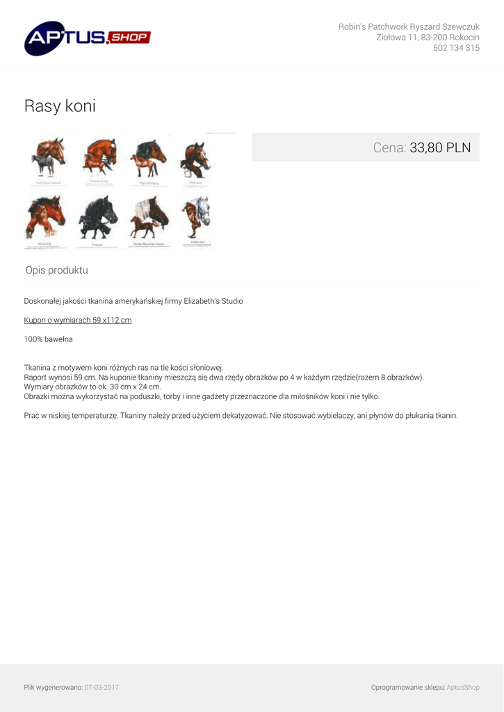 Robin's Patchwork Ryszard Szewczuk Ziołowa 11, 83-200 Rokocin 502 134 315 Rasy koni Cena: 33,80 PLN Opis produktu Doskonałej jakości tkanina amerykańskiej firmy Elizabeth's Studio Kupon o wymiarach 59 x112 cm 100% bawełna Tkanina z motywem koni różnych ras na tle kości słoniowej. Raport wynosi 59 cm. Na kuponie tkaniny mieszczą się dwa rzędy obrazków po 4 w każdym rzędzie(razem 8 obrazków). Wymiary obrazków to ok. 30 cm x 24 cm. Obrazki można wykorzystać na poduszki, torby i inne gadżety przeznaczone dla miłośników koni i nie tylko. Prać w niskiej temperaturze. Tkaniny należy przed użyciem dekatyzować. Nie stosować wybielaczy, ani płynów do płukania tkanin. Plik wygenerowano: 07-03-2017 Oprogramowanie sklepu: AptusShop Robin's Patchwork Ryszard Szewczuk Ziołowa 11, 83-200 Rokocin 502 134 315 Galeria Plik wygenerowano: 07-03-2017 Powered by TCPDF (www.tcpdf.org) Oprogramowanie sklepu: AptusShop