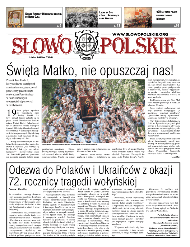 s. 405 lat temu polska Lachy za Bug i San... Krwawiąca rana Wołynia Ksiądz Ambroży Mickiewicz odszedł do Domu Ojca 5 s. husaria zdobyła Moskwę 13 s.19 Lipiec 2015 nr 7 (36) Święta Matko, nie opuszczaj nas! Pomnik Jana Pawła II, który niedawno stanął przed sanktuarium maryjnym, został poświęcony przez biskupa seniora Jana Purwińskiego w trakcie lipcowych uroczystości odpustowych w Berdyczowie. 19 – Kiedy odwiedziłem po raz kolejny Stolicę Apostolską, papież Jan Paweł II zapytał: „Jak rozwija się Berdyczów? Jak żyją tam wierni Kościoła?” – mówił biskup senior Jan Purwiński podczas poświęcenia pomnika papieża Polaka przed Fot. Olena Kaczurowska lipca tysiące pątników ze wszystkich stron Ukrainy, Polski, Litwy i innych krajów zebrało się na placu przed Narodowym Sanktuarium Matki Bożej Szkaplerznej, by w obecności ośmiu biskupów i ponad 50 księży, i braci zakonnych uczestniczyć w corocznych uroczystościach odpustowych. Najmłodszy z pątników miał zaledwie 13 miesięcy, najstarszy – 82 lata. Wierni witają kopię słynącego łaskami obrazu Matki Bożej Berdyczowskiej sanktuarium maryjnym. – Ojciec Święty poświęcił korony do ponownej koronacji obrazu Matki Bożej Berdyczowskiej. Modlił się przed nim w czasie swej pielgrzymki na Ukrainę w 2001 roku. Centralna msza święta rozpoczęła się o godz. 11. Celebrował ją arcybiskup Rygi Zbigniew Stankiewicz. Podczas homilii wierni wysłuchali fragmentu Ewangelii św. Jana „Oto Matka twoja”. Arcybi- skup zachęcał ich, by pamiętali, że są dziećmi Bożymi i że są stworzeni na Jego obraz i podobieństwo. Kazanie, przyjęte przez pielgrzymów z zachwytem, zostało wygłoszone po polsku i ukraińsku. Modlitwę wiernych czytano także w wielu innych językach. Pod koniec mszy abp Piotr Malczuk odebrał gratulacje z okazji jubileuszu 50-lecia. Sens podjętej pielgrzymki pątnicy ujmowali następująco: „to możliwość wspólnej modlitwy”, „sprawdzian naszej wytrwałości”, „okazja do modlitwy o Ukrainę”. Trzy dni wcześniej do katedry św. Zofii w Żytomierzu przybyli pielgrzymi z Korostyszewa, aby nazajutrz razem z najstarszą pielgrzymką na Ukrainie – z Żytomierza do Berdyczowa, kontynuować modlitewne wędrowanie. Przed świątynią zebrali się liczni wierni żytomierskiej parafii katedralnej. W korostyszewskiej grupie pod przewodnictwem ojców salezjanów szli także pielgrzymi z Brusiłowa, Peremyślan, Radomyśla, a nawet z Polski – z Oświęcimia. Leon Mały Odezwa do Polaków i Ukraińców z okazji 72. rocznicy tragedii wołyńskiej Polacy i Ukraińcy! Ze smutkiem i trwogą obserwujemy coroczne nasilenie konfliktu polsko-ukraińskiego, związanego z tragicznymi wydarzeniami, które miały miejsce na Wołyniu i w Galicji Wschodniej w latach II wojny światowej. Niepokoi nas fakt, że ta straszna tragedia, która zabrała życie rzeszom niewinnych ludzi – Polaków i Ukraińców, wykorzystywana jest, by nadal siać ziarna nienawiści między naszymi narodami, z czego korzysta dziś putinowska maszyna propagandowa. Apelujemy do wszystkich, aby nie ulegali jakimkolwiek próbom podsycania wro- gości między naszymi narodami. Nie dajmy się znowu skłócić! Każdego roku w lipcu modlimy się szczególnie w intencji niewinnie zamordowanych naszych Rodaków, ale także Ukraińców, którzy zginęli w bezsensownym i krwawym konflikcie na tle etnicznym. Ich śmierć odbija się głuchym echem w naszych sercach. Niech będzie lekcją dla naszego i następnych pokoleń. Musimy nauczyć się przebaczać w duchu chrześcijańskiej miłości bliźniego! Mamy nadzieję, że nigdy więcej podobna tragedia się nie powtórzy. Chcemy przypomnieć słowa papieża Franciszka, który w lipcu 2013 roku, w 70. rocznicę wołyń- skiej tragedii, podczas modlitwy Anioł Pański w Castel Gandolfo powiedział: „Łączę się w modlitwie z biskupami i wiernymi Kościoła na Ukrainie, zgromadzonymi w katedrze w Łucku na mszy św. żałobnej z okazji 70. rocznicy tragedii na Wołyniu. Akty te wywołane ideologią nacjonalistyczną w czasie II wojny światowej, spowodowały dziesiątki, a nawet setki tysięcy ofiar śmiertelnych i zadały ranę braterstwu dwóch narodów, polskiego i ukraińskiego. Wraz z pasterzami Kościoła na Ukrainie i w Polsce powierzam Bożemu miłosierdziu dusze tych ofiar, a dla obydwóch narodów proszę o łaskę głębokiego pojednania i pokojowej przyszłości w nadziei szczerej współpracy na rzecz wspólnego budowania jednego Królestwa Bożego”. Przeszłość, nawet najbardziej dramatyczna, nie powinna nas dzielić. Tylko dzięki współpracy i wspólnemu badaniu wszystkich okoliczności tej strasznej zbrodni, możemy liczyć na dalszy rozwój dobrosąsiedzkich stosunków obydwu narodów. Uważamy, że racją stanu naszych państw i narodów jest współpraca i wspólna europejska droga. Wzajemne oskarżanie się, burzenie pomników i inne wrogie działania, to droga wiodąca donikąd. Wierzymy, że możliwe jest prawdziwe porozumienie między naszymi narodami oparte na prawdzie, wartościach chrześcijańskich i europejskich. Wieczny odpoczynek racz dać Panie wszystkim Polakom i Ukraińcom, którzy zginęli na Wołyniu i w Galicji Wschodniej. Partia Polaków Ukrainy, Zarząd Główny Związku Polaków na Ukrainie, Kolegium Redakcyjne pisma „Dziennik Kijowski”, Redakcja pisma „Słowo Polskie”, Redakcja „Kuriera Galicyjskiego”, Redakcja pisma„Monitor Wołyński”, Redakcja kwartalnika „Głos Polonii”, Serfując po ukraińskim Internecie Ukraina radzi sobie bez rosyjskiego gazu Dzięki własnemu wydobyciu oraz importowi gazu ze Słowacji Ukraina od pierwszych dni lipca nie pobiera gazu z rurociągu rosyjskiego. – Rosja nadal w dużych ilościach pompuje gaz przez nasze terytorium, ale my w obecnej chwili dajemy sobie radę bez niego. Nasze podziemne zbiorniki codziennie przyjmują około 30 milionów metrów sze