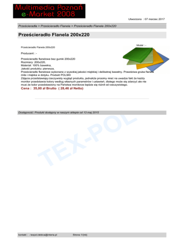 Utworzono : 07 marzec 2017 Prześcieradła > Prześcieradło Flanela > Prześcieradło Flanela 200x220 Prześcieradło Flanela 200x220 Model : - Prześcieradło Flanela 200x220 Producent : Prześcieradło flanelowe bez gumki 200x220 Rozmiary: 200x220, Materiał: 100% bawełna, Jakość produktu: pierwsza, Prześcieradło flanelowe wykonane z wysokiej jakości miękkiej i delikatnej bawełny. Prawdziwa gruba flanela miła i miękka w dotyku. Produkt POLSKI Zdjęcia przedstawiają rzeczywisty wygląd produktu, jednakże prosimy mieć na uwadze fakt że każdy monitor przedstawia kolory według własnych parametrów i ustawień, dlatego może się zdarzyć ale nie musi że kolor przedstawiony na Państwa monitorze będzie się różnił od rzeczywistego. Cena : 35,00 zł Brutto ( 28,46 zł Netto) L O Dostępność: Produkt dostępny w naszym sklepie od 13 maj 2015 E T kontakt : - [email protected] P X Strona 1/{nb}