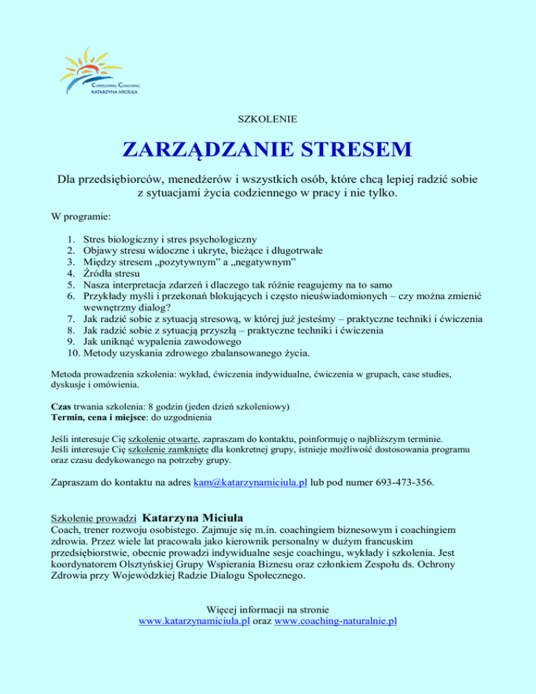 SZKOLENIE ZARZĄDZANIE STRESEM Dla przedsiębiorców, menedżerów i wszystkich osób, które chcą lepiej radzić sobie z sytuacjami życia codziennego w pracy i nie tylko. W programie: 1. 2. 3. 4. 5. 6. Stres biologiczny i stres psychologiczny Objawy stresu widoczne i ukryte, bieżące i długotrwałe Między stresem „pozytywnym” a „negatywnym” Źródła stresu Nasza interpretacja zdarzeń i dlaczego tak różnie reagujemy na to samo Przykłady myśli i przekonań blokujących i często nieuświadomionych – czy można zmienić wewnętrzny dialog? 7. Jak radzić sobie z sytuacją stresową, w której już jesteśmy – praktyczne techniki i ćwiczenia 8. Jak radzić sobie z sytuacją przyszłą – praktyczne techniki i ćwiczenia 9. Jak uniknąć wypalenia zawodowego 10. Metody uzyskania zdrowego zbalansowanego życia. Metoda prowadzenia szkolenia: wykład, ćwiczenia indywidualne, ćwiczenia w grupach, case studies, dyskusje i omówienia. Czas trwania szkolenia: 8 godzin (jeden dzień szkoleniowy) Termin, cena i miejsce: do uzgodnienia Jeśli interesuje Cię szkolenie otwarte, zapraszam do kontaktu, poinformuję o najbliższym terminie. Jeśli interesuje Cię szkolenie zamknięte dla konkretnej grupy, istnieje możliwość dostosowania programu oraz czasu dedykowanego na potrzeby grupy. Zapraszam do kontaktu na adres [email protected] lub pod numer 693-473-356. Szkolenie prowadzi Katarzyna Miciuła Coach, trener rozwoju osobistego. Zajmuje się m.in. coachingiem biznesowym i coachingiem zdrowia. Przez wiele lat pracowała jako kierownik personalny w dużym francuskim przedsiębiorstwie, obecnie prowadzi indywidualne sesje coachingu, wykłady i szkolenia. Jest koordynatorem Olsztyńskiej Grupy Wspierania Biznesu oraz członkiem Zespołu ds. Ochrony Zdrowia przy Wojewódzkiej Radzie Dialogu Społecznego. Więcej informacji na stronie www.katarzynamiciula.pl oraz www.coaching-naturalnie.pl