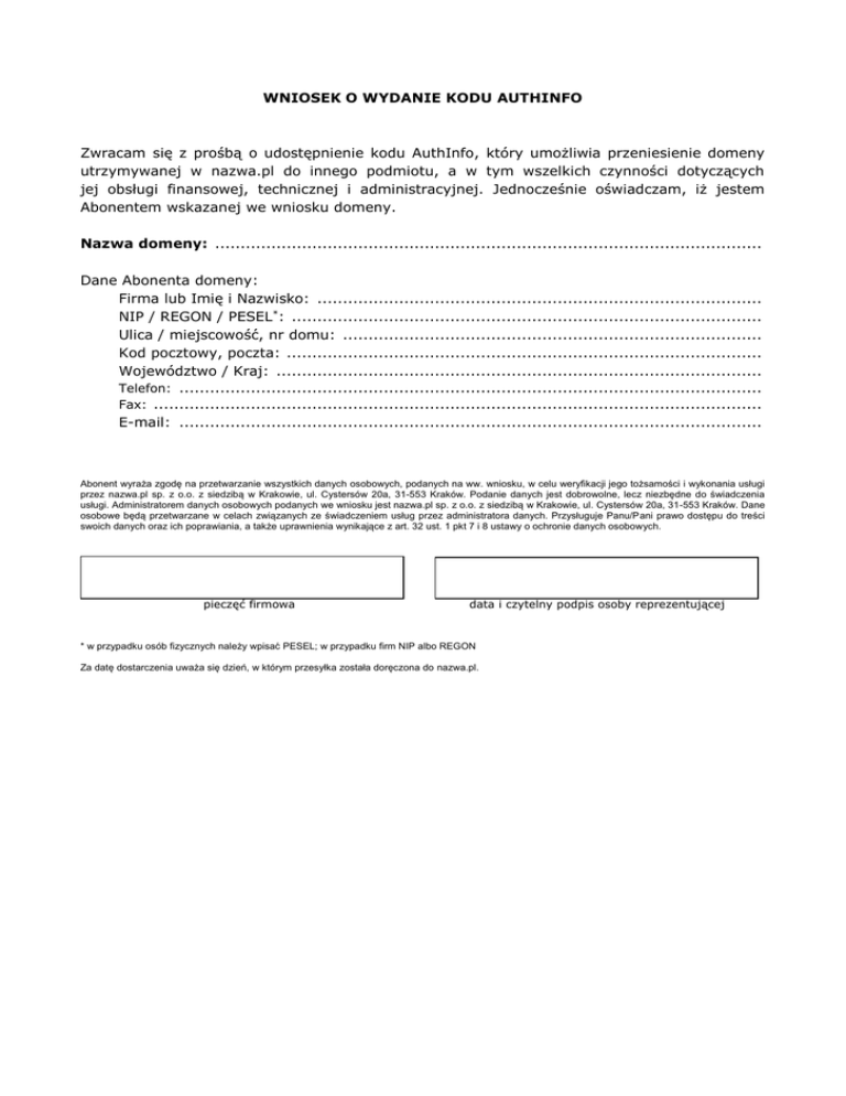 WNIOSEK O WYDANIE KODU AUTHINFO Zwracam się z prośbą o udostępnienie kodu AuthInfo, który umożliwia przeniesienie domeny utrzymywanej w nazwa.pl do innego podmiotu, a w tym wszelkich czynności dotyczących jej obsługi finansowej, technicznej i administracyjnej. Jednocześnie oświadczam, iż jestem Abonentem wskazanej we wniosku domeny. Nazwa domeny: ........................................................................................................... Dane Abonenta domeny: Firma lub Imię i Nazwisko: ....................................................................................... NIP / REGON / PESEL*: ............................................................................................ Ulica / miejscowość, nr domu: .................................................................................. Kod pocztowy, poczta: ............................................................................................. Województwo / Kraj: ............................................................................................... Telefon: .................................................................................................................. Fax: ....................................................................................................................... E-mail: .................................................................................................................. Abonent wyraża zgodę na przetwarzanie wszystkich danych osobowych, podanych na ww. wniosku, w celu weryfikacji jego tożsamości i wykonania usługi przez nazwa.pl sp. z o.o. z siedzibą w Krakowie, ul. Cystersów 20a, 31-553 Kraków. Podanie danych jest dobrowolne, lecz niezbędne do świadczenia usługi. Administratorem danych osobowych podanych we wniosku jest nazwa.pl sp. z o.o. z siedzibą w Krakowie, ul. Cystersów 20a, 31-553 Kraków. Dane osobowe będą przetwarzane w celach związanych ze świadczeniem usług przez administratora danych. Przysługuje Panu/Pani prawo dostępu do treści swoich danych oraz ich poprawiania, a także uprawnienia wynikające z art. 32 ust. 1 pkt 7 i 8 ustawy o ochronie danych osobowych. pieczęć firmowa data i czytelny podpis osoby reprezentującej * w przypadku osób fizycznych należy wpisać PESEL; w przypadku firm NIP albo REGON Za datę dostarczenia uważa się dzień, w którym przesyłka została doręczona do nazwa.pl.