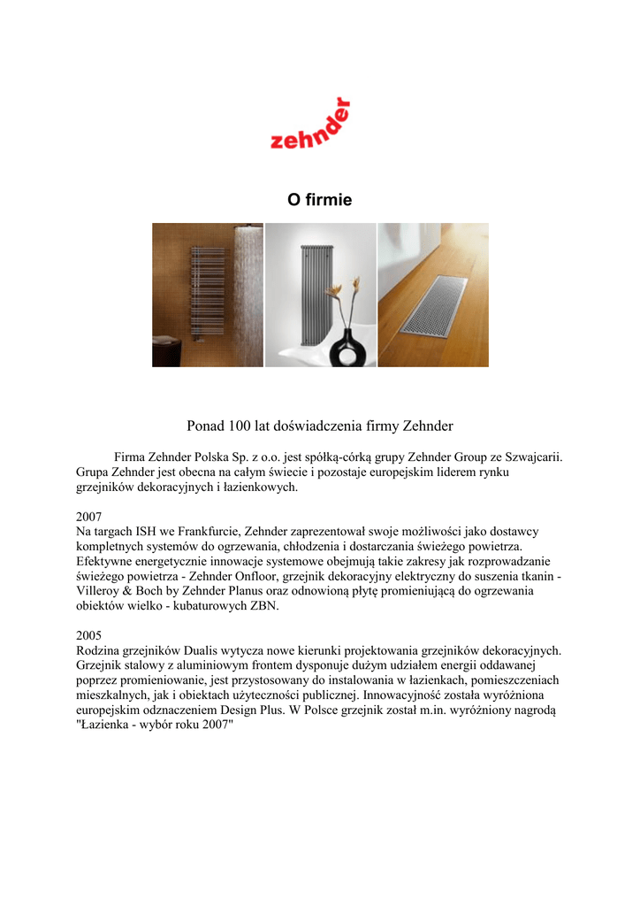 O firmie Ponad 100 lat doświadczenia firmy Zehnder Firma Zehnder Polska Sp. z o.o. jest spółką-córką grupy Zehnder Group ze Szwajcarii. Grupa Zehnder jest obecna na całym świecie i pozostaje europejskim liderem rynku grzejników dekoracyjnych i łazienkowych. 2007 Na targach ISH we Frankfurcie, Zehnder zaprezentował swoje możliwości jako dostawcy kompletnych systemów do ogrzewania, chłodzenia i dostarczania świeżego powietrza. Efektywne energetycznie innowacje systemowe obejmują takie zakresy jak rozprowadzanie świeżego powietrza - Zehnder Onfloor, grzejnik dekoracyjny elektryczny do suszenia tkanin Villeroy & Boch by Zehnder Planus oraz odnowioną płytę promieniującą do ogrzewania obiektów wielko - kubaturowych ZBN. 2005 Rodzina grzejników Dualis wytycza nowe kierunki projektowania grzejników dekoracyjnych. Grzejnik stalowy z aluminiowym frontem dysponuje dużym udziałem energii oddawanej poprzez promieniowanie, jest przystosowany do instalowania w łazienkach, pomieszczeniach mieszkalnych, jak i obiektach użyteczności publicznej. Innowacyjność została wyróżniona europejskim odznaczeniem Design Plus. W Polsce grzejnik został m.in. wyróżniony nagrodą "Łazienka - wybór roku 2007" 2003 Początek współpracy z Villeroy & Boch: grzejniki łazienkowe dopasowane przez renomowanych projektantów do serii produktów Villeroy & Boch znalazły się w ofercie Partnerów firmy Zehnder Polska. 2002 Początek działalności Zehnder Polska Sp. z o.o. 2001 Wejście na rynek komfortowych systemów wentylacyjnych. 2000 Zehnder świętuje 70-cio lecie grzejników żeberkowych tej marki. Z okazji rocznicy, produkt otrzymuje nazwę z czasów w których został stworzony: Zehnder Charleston. 1993 Doktor Hans - Peter Zehnder, jako przedstawiciel czwartej generacji rodu obejmuje przewodzenie zarządowi Grupy. 1986 Wejście na giełdę spółki Zehnder Holding AG. Akcje zostają przedłożone do wolnego obrotu rynkowego. 1984 Zehnder staje się pionierem segmentu grzejników dekoracyjnych. Zehnder Art Deco oraz Zehnder Sculptur to pierwsze grzejniki dekoracyjne na światowym rynku. 1980 W wyniku fuzji ze znaczącym producentem systemów grzewczych - marką Beutler z siedzibą w Lahr (Schwarzwald) - następuje dalsze umocnienie pozycji marki Zehnder na rynku europejskim. Wyprodukowanie pierwszego grzejnika przystosowanego do suszenia ręczników - Zehnder Universal. To zdarzenie po raz pierwszy rozwinęło funkcję grzewczą w kierunku wartości dodatkowych grzejnika - suszarki do tkanin. 1964 Ze względu na duży popyt na produkty marki Zehnder następuje zarejestrowanie spółki córki w miejscowości Riegel (Niemcy). 1953 Ekspansja na nowe rynki zbytu. Rozpoczęcie eksportu grzejników rurowych do Niemiec. 1930 Robert Zehnder wynajduje grzejnik żeberkowy skonstruowany z rur stalowych (protoplasta Zehnder Charleston). W porównaniu do ówcześnie stosowanych masywnych grzejników żeliwnych, grzejnik żeberkowy Zehnder był tańszy w produkcji, efektywniej oddawał energię i oferował lepsze właściwości estetyczne. 1923 Bracia Walter i Robert Zehnder konstruują i produkują na skalę masową serię motocykli małolitrażowych. 1895 Jakob Zehnder otwiera zakład produkcyjny rowerów, maszyn do pisania i pralek w miejscowości Gränichen w Szwajcarii. Kontakt Zehnder Polska Sp. z o.o. ul. Tarnogajska 18 50-512 Wrocław tel. (0 71) 367-64-24 (0 71) 790-27-47 www.zehnder.pl E-mail [email protected]