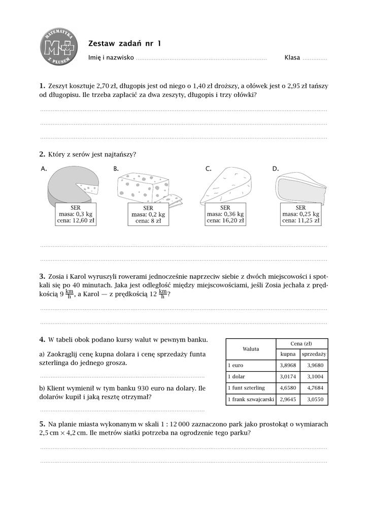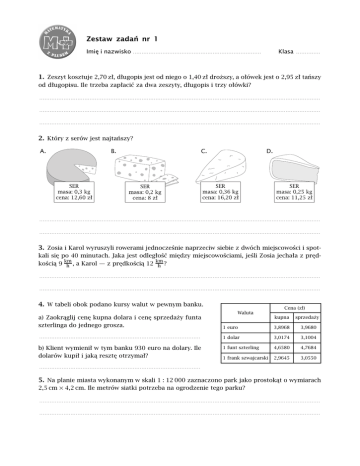 Zestaw zadań nr 1 Imię i nazwisko .......................................................................... Klasa .............. 1. Zeszyt kosztuje 2,70 zł, długopis jest od niego o 1,40 zł droższy, a ołówek jest o 2,95 zł tańszy od długopisu. Ile trzeba zapłacić za dwa zeszyty, długopis i trzy ołówki? .................................................................................................................................................................. .................................................................................................................................................................. .................................................................................................................................................................. 2. Który z serów jest najtańszy? .................................................................................................................................................................. .................................................................................................................................................................. 3. Zosia i Karol wyruszyli rowerami jednocześnie naprzeciw siebie z dwóch miejscowości i spotkali się po 40 minutach. Jaka jest odległość między miejscowościami, jeśli Zosia jechała z prędkm km kością 9 h , a Karol — z prędkością 12 h ? .................................................................................................................................................................. .................................................................................................................................................................. 4. W tabeli obok podano kursy walut w pewnym banku. Cena (zł) Waluta a) Zaokrąglij cenę kupna dolara i cenę sprzedaży funta szterlinga do jednego grosza. ............................................................................................. b) Klient wymienił w tym banku 930 euro na dolary. Ile dolarów kupił i jaką resztę otrzymał? kupna sprzedaży 1 euro 3,8968 3,9680 1 dolar 3,0174 3,1004 1 funt szterling 4,6580 4,7684 1 frank szwajcarski 2,9645 3,0550 ............................................................................................. 5. Na planie miasta wykonanym w skali 1 : 12 000 zaznaczono park jako prostokąt o wymiarach 2,5 cm × 4,2 cm. Ile metrów siatki potrzeba na ogrodzenie tego parku? .................................................................................................................................................................. .................................................................................................................................................................. 6. Rok produkcji filmu często zapisuje się cyframi rzymskimi. Ile lat temu wyprodukowano poniższe filmy? Tytuł filmu Rok produkcji Ile lat upłynęło? Krzyżacy MCMLX ............................................................................. Potop MCMLXXIV ............................................................................. Park jurajski MCMXCIII ............................................................................. Pan Tadeusz MCMXCIX ............................................................................. Harry Potter i Zakon Feniksa MMVII ............................................................................. 7. Stosunek liczby dziewcząt do liczby chłopców w pewnej szkole jest równy 4 : 3. Dziewcząt jest o 90 więcej niż chłopców. Ilu chłopców jest w tej szkole? .................................................................................................................................................................. .................................................................................................................................................................. 8. Zaznacz na osi liczbowej następujące liczby: −1 1 a= 5 b= √ 25 − 16 c = −3 − (−2) d = −1 + 10 : (−5) f = (2 0,5)2 − 50 e = 22 − (−2)2 9. Zapisz, nie używając notacji wykładniczej: a) 2,6 · 108 g = ................... b) 8,4 · 106 cm = c) 3 · 10−2 m2 = kg ................... ................... d) 1,4 · 105 cm3 = km cm2 ................... litrów 10. Wykonaj obliczenia, a następnie wskaż największą liczbę: a = (62 )4 : 65 = b = 6 · 63 = c= ................... 34 ·24 62 = ................... d = (48 : 23 )−1 = ................... 11. Wyłącz czynnik przed znak pierwiastka: a) √ 72 = ......... b) √ 396 = ......... c) ................... √ 3 108 = ......... d) √ 3 −640 = ......... 12. Oblicz pola figur przedstawionych na rysunkach: .................................................................................................................................................................. .................................................................................................................................................................. ..................................................................................................................................................................