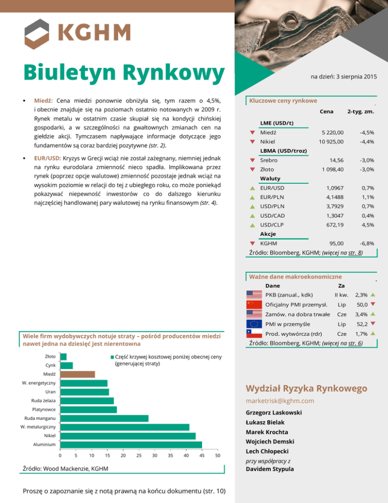 Biuletyn Rynkowy Miedź: Cena miedzi ponownie obniżyła się, tym razem o 4,5%, na dzień: 3 sierpnia 2015 Kluczowe ceny rynkowe i obecnie znajduje się na poziomach ostatnio notowanych w 2009 r. Cena Rynek metalu w ostatnim czasie skupiał się na kondycji chińskiej gospodarki, a w szczególności na gwałtownych zmianach cen na giełdzie akcji. Tymczasem napływające informacje dotyczące jego fundamentów są coraz bardziej pozytywne (str. 2). na rynku eurodolara zmienność nieco spadła. Implikowana przez rynek (poprzez opcje walutowe) zmienność pozostaje jednak wciąż na wysokim poziomie w relacji do tej z ubiegłego roku, co może poniekąd niepewność inwestorów co do LME (USD/t) q Miedź 5 220,00 -4,5% q Nikiel 10 925,00 -4,4% 14,56 -3,0% 1 098,40 -3,0% p EUR/USD 1,0967 0,7% EUR/PLN 4,1488 1,1% p USD/PLN 3,7929 0,7% p USD/CAD 1,3047 0,4% p USD/CLP 672,19 4,5% 95,00 -6,8% LBMA (USD/troz) EUR/USD: Kryzys w Grecji wciąż nie został zażegnany, niemniej jednak pokazywać 2-tyg. zm. dalszego kierunku najczęściej handlowanej pary walutowej na rynku finansowym (str. 4). q Srebro q Złoto Waluty p Akcje q KGHM Źródło: Bloomberg, KGHM; (więcej na str. 8) Ważne dane makroekonomiczne Dane PKB (zanual., kdk) Wiele firm wydobywczych notuje straty – pośród producentów miedzi nawet jedna na dziesięć jest nierentowna Za II kw. 2,3% p Oficjalny PMI przemysł. Lip 50,0 q Zamów. na dobra trwałe Cze 3,4% p PMI w przemyśle Lip 52,2 q Prod. wytwórcza (rdr) Cze 1,7% p Źródło: Bloomberg, KGHM; (więcej na str. 6) Część krzywej kosztowej poniżej obecnej ceny (generującej straty) Złoto Cynk Miedź W. energetyczny Wydział Ryzyka Rynkowego Uran [email protected] Ruda żelaza Platynowce Grzegorz Laskowski Ruda manganu Łukasz Bielak W. metalurgiczny Marek Krochta Nikiel Wojciech Demski Aluminium 0 5 10 15 20 25 30 35 40 45 50 Źródło: Wood Mackenzie, KGHM Proszę o zapoznanie się z notą prawną na końcu dokumentu (str. 10) Lech Chłopecki przy współpracy z Davidem Stypula Biuletyn Rynkowy | 3 sierpnia 2015 Metale bazowe i szlachetne | Pozostałe surowce Miedź Cena miedzi ponownie obniżyła się, tym razem o 4,5%, i obecnie znajduje się na poziomach ostatnio notowanych w 2009 r. Rynek metalu w ostatnim czasie skupiał się na kondycji chińskiej gospodarki, a w szczególności na gwałtownych zmianach cen na giełdzie akcji. Tymczasem napływające informacje dotyczące jego fundamentów są coraz bardziej pozytywne. Zakłócenia produkcji od stycznia w skali roku wynoszą 5,5% Rynek metalu w ostatnim czasie skupiał się na kondycji chińskiej gospodarki, a w szczególności na gwałtownych zmianach cen na giełdzie akcji. Tymczasem napływające informacje dotyczące jego fundamentów są coraz bardziej pozytywne, ponieważ część raportów spółek górniczych za II kwartał ujawnia ich problemy produkcyjne z wydobyciem surowca w Chile, Chinach, Zambii i Papule Nowej Gwinei: Spółka First Quantum Minerals ogłosiła problemy z dostępnością energii elektrycznej, spowodowaną niższymi opadami deszczu w rejonie, gdzie działają jej kopalnie. Z tego powodu wydobycie w Sentinel i Kansanshi jest ograniczone. Macquarie Research szacuje, że problemy te mogą skutkować o 25 tys. ton niższą niż zakładana produkcją w tych 2 kopalniach. Wcześniej Macquarie przewidywał zakłócenia wydobycia w wysokości 20 tys. ton w innych kopalniach w Zambii. Niskie ceny metalu w tym roku zmusiły niektórych chińskich producentów do ograniczenia wydobycia o ok. 20 tys. ton. Ok Tedi Mining Ltd., państwowa kopalnia w Papui Nowej Gwinei, ogłosiła czasowe wstrzymanie wydobycia ze względu na niski stan wód, utrudniający transport rzeczny. Zawieszenie działalności może potrwać kilka tygodni i obniżyć produkcję firmy o 10 tys. ton. W Chile, Codelco zmaga się z eskalacją protestów, które początkowo wybuchły w mniejszej kopalni El Salvador, by później przenieść się na dużo większą kopalnię Chuquicamata. Według Macquarie pełen efekt tych zakłóceń jest trudny do oszacowania, jednak obecnie może to być ok. 5 tys. ton. Jednym ze źródeł dalszych zakłóceń produkcji w najbliższym czasie może być działalność Freeport McMoran. Spółka ogłosiła „kompleksową rewizję planów operacyjnych”, która będzie uwzględniała potencjalne dostosowanie obecnych i przyszłych wielkości produkcji miedzi i molibdenu, by obniżyć koszty i zachować bazę surowcową na czas lepszych warunków rynkowych. 2 / 10 Biuletyn Rynkowy | 3 sierpnia 2015 Innym dużym wydobywcą, który poddany będzie obserwacji jest Anglo American. Firma zmaga się obecnie z niedoborem wody w kopalni Los Bronces i, chociaż w planie na 2015 r. przewidziała podobne problemy, pogorszenie warunków pogodowych może jednak skutkować odpisami. Zakłócenia produkcji w tym roku wynoszą już 600 tys. ton (5,5% produkcji w skali roku) 1% Problemy techniczne 15% Strajki 24% 8% Opóźnienia uruchomień Pogoda 6% Jakość rudy 26% Cena surowca 20% Inne Źródło: Macquarie Research, KGHM Pozostałe istotne informacje dotyczące rynku miedzi: Barrick Gold Corp., największy na świecie producent złota, zaakceptował ofertę kupna 50 procent udziałów w chilijskiej kopalni miedzi Zaldivar od Angtofagasta Plc. Transakcja warta jest 1,01 mld USD i ma zakończyć się pod koniec 2015 r. Londyńska firma Armajaro Asset Management LLP z końcem lipca zdecydowała się na likwidację wartego 450 mln USD funduszu surowcowego. Przyczyną decyzji o jego zamknięciu jest odejście głównego zarządzającego oraz wygenerowane przez fundusz straty. International Copper Study Group (ICSG) w kwietniu zanotowała deficyt na rynku miedzi rafinowanej w wysokości 81 tys. ton w porównaniu do nadwyżki 4 tys. ton miesiąc wcześniej. W ciągu czterech miesięcy 2015 r. nadwyżka według ICSG wyniosła 62 tys. ton, podczas gdy w analogicznym okresie ubiegłego roku rynek znajdował się w defi