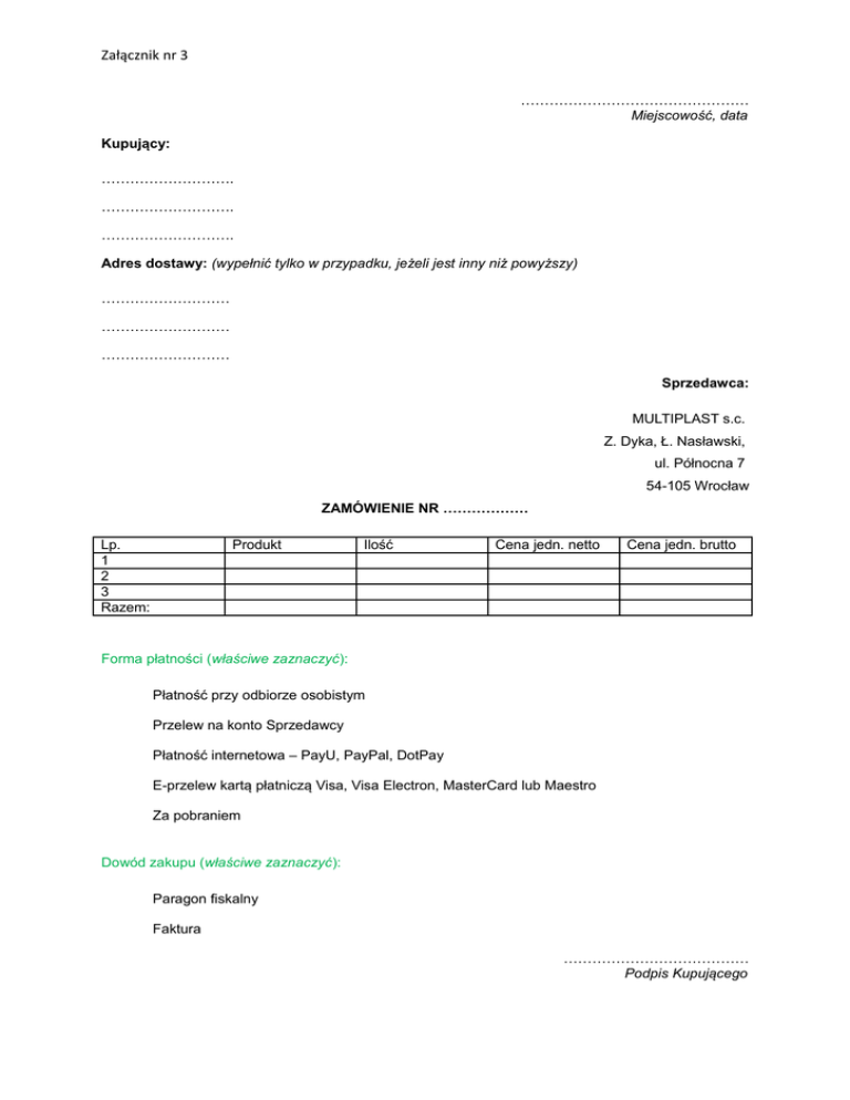 Załącznik nr 3 ………………………………………… Miejscowość, data Kupujący: ………………………. ………………………. ………………………. Adres dostawy: (wypełnić tylko w przypadku, jeżeli jest inny niż powyższy) ……………………… ……………………… ……………………… Sprzedawca: MULTIPLAST s.c. Z. Dyka, Ł. Nasławski, ul. Północna 7 54-105 Wrocław ZAMÓWIENIE NR ……………… Lp. 1 2 3 Razem: Produkt Ilość Cena jedn. netto Cena jedn. brutto Forma płatności (właściwe zaznaczyć): Płatność przy odbiorze osobistym Przelew na konto Sprzedawcy Płatność internetowa – PayU, PayPal, DotPay E-przelew kartą płatniczą Visa, Visa Electron, MasterCard lub Maestro Za pobraniem Dowód zakupu (właściwe zaznaczyć): Paragon fiskalny Faktura ………………………………… Podpis Kupującego