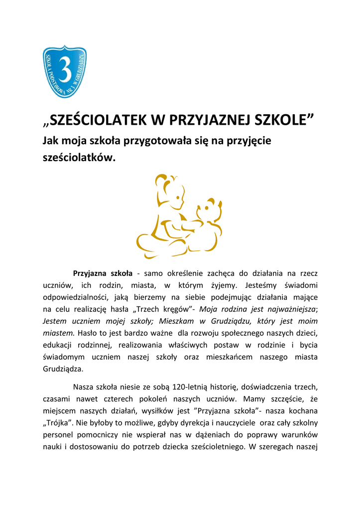 „SZEŚCIOLATEK W PRZYJAZNEJ SZKOLE” Jak moja szkoła przygotowała się na przyjęcie sześciolatków. Przyjazna szkoła - samo określenie zachęca do działania na rzecz uczniów, ich rodzin, miasta, w którym żyjemy. Jesteśmy świadomi odpowiedzialności, jaką bierzemy na siebie podejmując działania mające na celu realizację hasła „Trzech kręgów”- Moja rodzina jest najważniejsza; Jestem uczniem mojej szkoły; Mieszkam w Grudziądzu, który jest moim miastem. Hasło to jest bardzo ważne dla rozwoju społecznego naszych dzieci, edukacji rodzinnej, realizowania właściwych postaw w rodzinie i bycia świadomym uczniem naszej szkoły oraz mieszkańcem naszego miasta Grudziądza. Nasza szkoła niesie ze sobą 120-letnią historię, doświadczenia trzech, czasami nawet czterech pokoleń naszych uczniów. Mamy szczęście, że miejscem naszych działań, wysiłków jest ”Przyjazna szkoła”- nasza kochana „Trójka”. Nie byłoby to możliwe, gdyby dyrekcja i nauczyciele oraz cały szkolny personel pomocniczy nie wspierał nas w dążeniach do poprawy warunków nauki i dostosowaniu do potrzeb dziecka sześcioletniego. W szeregach naszej rady złożonej z rodziców szóstych klas są już rodzice sześciolatków. To nasz pomysł na płynne przekazywanie obowiązków i nowe spojrzenie na szkołę. Nasza 120-letnia szkoła ma nieduży rejon i staramy się pozyskiwać uczniów wychodząc z propozycją do rodziców poprzez bezpośredni kontakt, organizowanie wspólnych przedsięwzięć, działań informacyjnych. Zapraszamy do udziału w uroczystościach i imprezach szkolnych. Organizujemy: Pasowanie na ucznia, Jasełka, Dzień Dziecka, Dni otwarte, okolicznościowe przedstawienia, zabawy, konkursy - spotkanie z bajką, turniej ekologiczny. Organizowaliśmy do pewnego momentu potyczki rodzinne. Propagujemy zdrowy styl życia wśród naszych uczniów i w ich rodzinach. Bierzemy udział w Roku Korczakowskim przybliżając w ten sposób postać patrona szkoły Janusza Korczaka. Organizujemy mnóstwo konkursów plastycznych, których owoce widać w holu szkolnym, w gablotach i na tablicach. Zastanawiamy się często, skąd biorą się te wszystkie pomysły na wykonanie prac konkursowych? U sześciolatków widać często pomoc rodziców. Właśnie o to nam chodzi, na tym nam zależy najbardziej! To wspaniałe uczucie widzieć, jak rodzice stają się partnerami naszej szkoły i wspólnie wychowujemy i edukujemy. Nasza szkoła to wyjątkowe miejsce, stworzone dla sześciolatków. Miejsce, w którym wychowawca pomoże maluszkowi w różnych kryzysowych momentach. Problemu nie stanowi wyjście do multimedialnego kina w naszym mieście. Idziemy całą szkołą, taką mamy zasadę – wszystko, co możemy, robimy razem. Wyjeżdżamy na wycieczki, tworzymy zgrany zespół i wyznaczamy sobie wspólne cele. Różnice materialne likwidujemy ograniczając działania do możliwości tych najmniej zamożnych, negocjujemy jednocześnie obniżenie kosztów . Po prostu jesteśmy razem! My jako Rada Rodziców naszej szkoły mamy świadomość, że umożliwienie sześciolatkom nauki w I klasie jest niepodważalnym dobrem, jakie spotkało te dzieci. W dobie zdobyczy XXI wieku, to nie jest taki sam sześciolatek, co kiedyś. Rodzice powielają stereotypy i trzeba pokazać im, że nie ma się czego bać. Program jest przyjazny i bardzo dobrze realizowany w naszej szkole. Zależy nam na tym, żeby uczniowie czuli się w szkole bezpiecznie, a nauka ma być przyjemnym obowiązkiem. Dlatego też bierzemy udział w projekcie MEN - Radosna szkoła, co widać na twarzach naszych dzieci. Wszyscy uczniowie naszej szkoły są nasi i za wszystkich ponosimy odpowiedzialność jako Rada Rodziców. Nam jest łatwiej, bo jesteśmy niewielką szkołą liczącą ok. 300 uczniów i mamy jednak nadzieję, że w większych ośrodkach da się wypracować tak niepowtarzalny, rodzinny i w pełni zintegrowany klimat, jak u nas. W naszej szkole staramy się stale poprawiać warunki funkcjonowania, czuwać we współpracy z Koordynatorem bezpieczeństwa nad warunkami bhp. Poprzez remonty i doposażenie sal oraz pomieszczeń poprawiamy warunki nauki i dostosowujemy je do potrzeb dziecka sześcioletniego. Nasi najmłodsi uczniowie mają radosne i przyjemne klasy wyposażone w najnowsze pomoce multimedialne. Mają wydzielone miejsce do odpoczynku, każde ma swoją szafkę i ergonomiczne miejsca do nauki. Jednak najważniejszy w tym wszystkim jest nauczyciel wychowawca, a my mamy wyjątkowych. Nasze dzieci czują się w szkole bezpiecznie. Kolejnym dobrym pomysłem na sukces jest zintegrowanie się ze środowiskiem lokalnym. Dzięki wypracowanym przez dyrekcję naszej szkoły dobrym relacjom z władzami miasta, lokalnymi mediami oraz społecznością jesteśmy pozytywnie postrzegani. My jako Rada Rodziców naszej szkoły wychodzimy na zewnątrz. Spotykamy się z radami innych Grudziądzkich szkół i czerpiemy z doświadczeń innych. Odwiedzamy przedszkola naszego miasta prezentując naszą przyjazną sześciolatkowi szkołę. Szkoła pojawia się w publikacjach na łamach lokalnych gazet - Nowości oraz Gazety Pomorskiej. Pojawiamy się w audycjach TV Kablowej przy okazji realizowania materiału dotyczącego szkolnictwa podstawowego. Mamy uczniów spoza naszego rejonu. Rodzice przywożą swoje pociechy do nas, choć budynek szkolny jest zabytkiem i wiążą się z tym ograniczenia. Nie możemy wybudować dużej sali gimnastycznej, zrobić łazienek na każdym piętrze, czy wykonać innych poważnych przeróbek bez zgody Konserwatora zabytków. Mamy niewielką salę gimnastyczną jak kilka innych szkół w Grudziądzu, dwie łazienki położone na poziomie -1,asfaltowe boisko do piłki ręcznej, ale nasi uczniowie są tu radośni i szczęśliwi. Dużym atutem jest posiadanie własnej kuchni, gdzie jedzenie przygotowywane jest na bieżąco. Uczniowie spożywają posiłki w czystej i przytulnej stołówce, bywa że jest to ich j