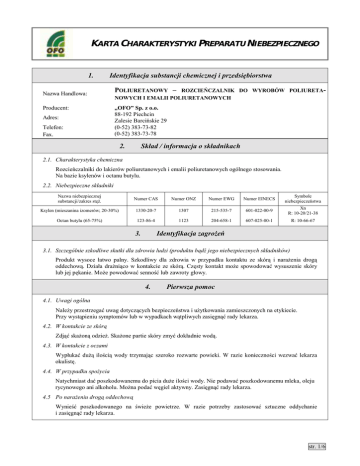 KARTA CHARAKTERYSTYKI PREPARATU NIEBEZPIECZNEGO 1. Identyfikacja substancji chemicznej i przedsiębiorstwa Nazwa Handlowa: Producent: Adres: Telefon: Fax. POLIURETANOWY – ROZCIEŃCZALNIK DO WYROBÓW POLIURETANOWYCH I EMALII POLIURETANOWYCH „OFO” Sp. z o.o. 88-192 Piechcin Zalesie Barcińskie 29 (0-52) 383-73-82 (0-52) 383-73-78 2. Skład / informacja o składnikach 2.1. Charakterystyka chemiczna Rozcieńczalniki do lakierów poliuretanowych i emalii poliuretanowych ogólnego stosowania. Na bazie ksylenów i octanu butylu. 2.2. Niebezpieczne składniki Nazwa niebezpiecznej substancji/zakres stęż. Numer CAS Numer ONZ Numer EWG Numer EINECS Symbole niebezpieczeństwa Ksylen (mieszanina izomerów; 20-30%) 1330-20-7 1307 215-535-7 601-022-00-9 Xn R: 10-20/21-38 Octan butylu (65-75%) 123-86-4 1123 204-658-1 607-025-00-1 R: 10-66-67 3. Identyfikacja zagrożeń 3.1. Szczególnie szkodliwe skutki dla zdrowia ludzi (produktu bądź jego niebezpiecznych składników) Produkt wysoce łatwo palny. Szkodliwy dla zdrowia w przypadku kontaktu ze skórą i narażenia drogą oddechową. Działa drażniąco w kontakcie ze skórą. Częsty kontakt może spowodować wysuszenie skóry lub jej pękanie. Może powodować senność lub zawroty głowy. 4. Pierwsza pomoc 4.1. Uwagi ogólna Należy przestrzegać uwag dotyczących bezpieczeństwa i użytkowania zamieszczonych na etykiecie. Przy wystąpieniu symptomów lub w wypadkach wątpliwych zasięgnąć rady lekarza. 4.2. W kontakcie ze skórą Zdjąć skażoną odzież. Skażone partie skóry zmyć dokładnie wodą. 4.3. W kontakcie z oczami Wypłukać dużą ilością wody trzymając szeroko rozwarte powieki. W razie konieczności wezwać lekarza okulistę. 4.4. W przypadku spożycia Natychmiast dać poszkodowanemu do picia duże ilości wody. Nie podawać poszkodowanemu mleka, oleju rycynowego ani alkoholu. Można podać węgiel aktywny. Zasięgnąć rady lekarza. 4.5 Po narażeniu drogą oddechową Wynieść poszkodowanego na świeże powietrze. W razie potrzeby zastosować sztuczne oddychanie i zasięgnąć rady lekarza. str. 1/6 KARTA CHARAKTERYSTYKI PREPARATU NIEBEZPIECZNEGO Nazwa Handlowa: POLIURETANOWY – ROZCIEŃCZALNIK DO POLIURETANOWYCH I EMALII POLIURETANOWYCH Producent: Adres: Telefon/Fax. „OFO” Sp. z o.o. 88-192 Piechcin, Zalesie Barcińskie 29 (0-52) 383-73-82 / (0-52) 383-73-78 5. Postępowanie w przypadku pożaru 5.1. Odpowiednie środki gaśnicze Piana, CO2, proszek gaśniczy, rozpylony strumień wody. 5.2. Środki gaśnicze nieodpowiednie ze względów bezpieczeństwa Silny strumień wody – ryzyko rozprzestrzenienia pożaru. 5.3. Szczególne wyposażenie podczas walki z ogniem W walce z ogniem: niezbędna ochrona dróg oddechowych z niezależnym obiegiem powietrza. Stosowć kombinezon ochronny do chemikaliów. 5.4. Uwagi dodatkowe Ochrona dróg oddechowych z niezależnym obiegiem powietrza Produkt palny. Pary cięższe od powietrza. Istnieje duże prawdopodobieństwo powstania mieszaniny wybuchowej z powietrzem. Zastosować środki ostrożności dla uniknięcia wyładowań elektrostatycznych. Zagrożone ogniem pojemniki polewać rozpyloną wodą z bezpiecznej odległości. Podczas pożaru może powstawać tlenek węgla (II) [CO] jako produkt częściowego spalania. Nie dopuścić do przedostania się wody gaśniczej do wód powierzchniowych lub gruntowych. 6. Postępowanie w przypadku uwolnienia do środowiska 6.1. Indywidualne środki ostrożności Pracować w należycie wentylowanych pomieszczeniach, stosować indywidualne środki ochrony. Unikać kontaktu ze skórą i oczami. 6.2. Niezbędne środki w zakresie ochrony środowiska Nie dopuścić do przedostania się do kanalizacji; ryzyko wybuchu. 6.3. Metody oczyszczania/wchłaniania Potraktować materiałem wchłaniającym ciecze - mineralnym lub roślinnym (np. piasek, ziemia, krzemionka, trociny itp.). Zebrany materiał potraktować jak odpady i dalej postępować wg p. 13. 7. Obchodzenie się z produktem i magazynowanie 7.1. Środki ostrożności podczas obchodzenia się z substancją Przestrzegać przepisów prawnych w zakresie ochrony i bezpieczeństwa. Unikać kontaktu ze skórą i oczami. 7.2. Wymagania w zakresie przechowywania i opakowań Przechowywać tylko w oryginalnych, szczelnych opakowaniach. Przechowywać w pomieszczeniach dobrze wentylowanych. Zalecana temperatura przechowywania ok. 20 °C. 7.3. Wspólne magazynowanie Niebezpieczeństwo pożaru, materiał łatwo zapalny. Nie przechowywać razem z substancjami mogącymi reagować z produktem lub jego parami. Nie przechowywać razem z artykułami żywnościowymi. 7.4. Uwagi o ochronie przed zapłonem i eksplozją Przechowywać z dala od źródła ognia. Zastosować środki ostrożności dla uniknięcia wyładowań elektrostatycznych. str. 2/6 KARTA CHARAKTERYSTYKI PREPARATU NIEBEZPIECZNEGO Nazwa Handlowa: POLIURETANOWY – ROZCIEŃCZALNIK DO POLIURETANOWYCH I EMALII POLIURETANOWYCH Producent: Adres: Telefon/Fax. „OFO” Sp. z o.o. 88-192 Piechcin, Zalesie Barcińskie 29 (0-52) 383-73-82 / (0-52) 383-73-78 8. Kontrola narażania / środki ochrony indywidualnej 8.1. Parametry kontroli niebezpiecznych składników w miejscu pracy Specyfikacja – maksymalne stężenia składnika w miejscu pracy: Specyfikacja NDS NDSCh NDSP Octan Butylu [CAS 123-86-4] 200 950 Ksylen [CAS 1330-20-7] 100 350 8.2. Wyposażenie osobiste Przestrzegać ogólnych zasad bezpieczeństwa i higieny. Przed przerwą i po zakończeniu pracy umyć ręce. Unikać dłuższego kontaktu ze skórą. Zdjąć natychmiast zabrudzone ubranie. Zalecane używanie kremu ochronnego do rąk. 8.3. Ochrona rąk Używać rękawic ochronnych. 8.4. Ochrona oczu Używać okularów ochronnych. 8.5. Ochrona dróg oddechowych Używać ochrony dóg oddechowych w przypadku tworzenia par/areozolu. 9. Właściwości fizykochemiczne 9.1. Dane ogólne stan skupienia barwa zapach ciecz bezbarwna charakterystyczny 9.2. Dane istotne ze względów bezpieczeństwa temperatur