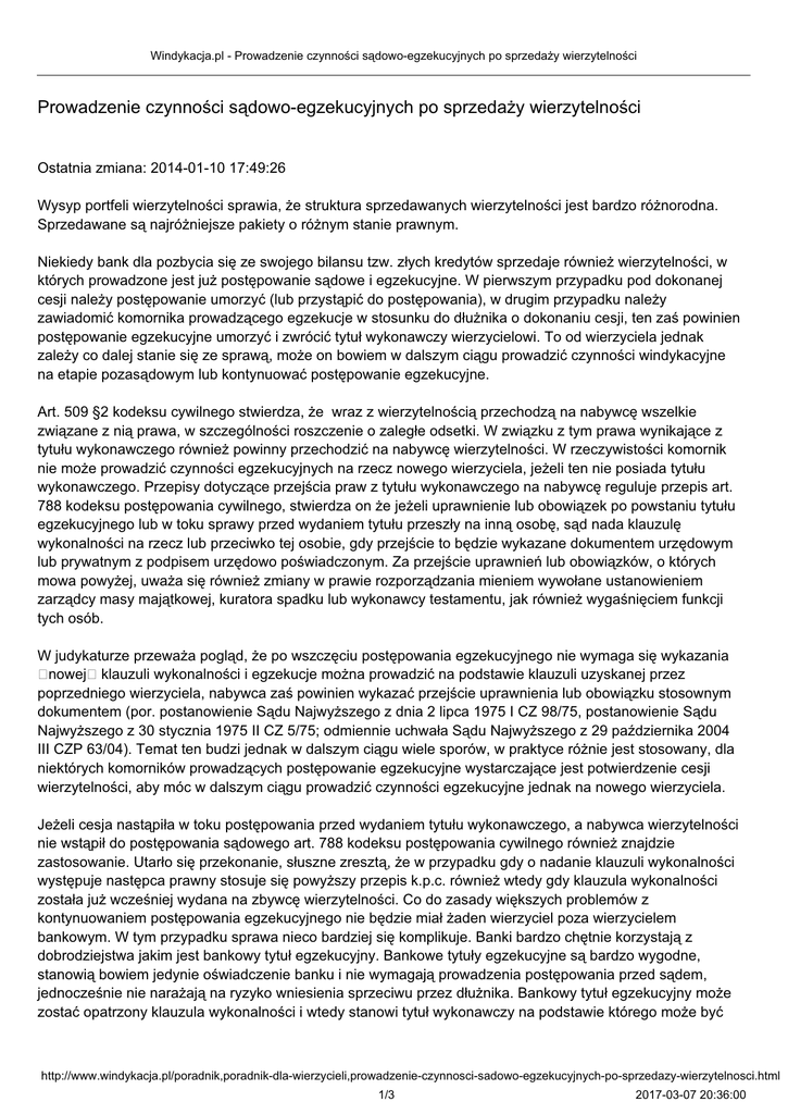Windykacja.pl - Prowadzenie czynności sądowo-egzekucyjnych po sprzedaży wierzytelności Prowadzenie czynności sądowo-egzekucyjnych po sprzedaży wierzytelności Ostatnia zmiana: 2014-01-10 17:49:26 Wysyp portfeli wierzytelności sprawia, że struktura sprzedawanych wierzytelności jest bardzo różnorodna. Sprzedawane są najróżniejsze pakiety o różnym stanie prawnym. Niekiedy bank dla pozbycia się ze swojego bilansu tzw. złych kredytów sprzedaje również wierzytelności, w których prowadzone jest już postępowanie sądowe i egzekucyjne. W pierwszym przypadku pod dokonanej cesji należy postępowanie umorzyć (lub przystąpić do postępowania), w drugim przypadku należy zawiadomić komornika prowadzącego egzekucje w stosunku do dłużnika o dokonaniu cesji, ten zaś powinien postępowanie egzekucyjne umorzyć i zwrócić tytuł wykonawczy wierzycielowi. To od wierzyciela jednak zależy co dalej stanie się ze sprawą, może on bowiem w dalszym ciągu prowadzić czynności windykacyjne na etapie pozasądowym lub kontynuować postępowanie egzekucyjne. Art. 509 §2 kodeksu cywilnego stwierdza, że wraz z wierzytelnością przechodzą na nabywcę wszelkie związane z nią prawa, w szczególności roszczenie o zaległe odsetki. W związku z tym prawa wynikające z tytułu wykonawczego również powinny przechodzić na nabywcę wierzytelności. W rzeczywistości komornik nie może prowadzić czynności egzekucyjnych na rzecz nowego wierzyciela, jeżeli ten nie posiada tytułu wykonawczego. Przepisy dotyczące przejścia praw z tytułu wykonawczego na nabywcę reguluje przepis art. 788 kodeksu postępowania cywilnego, stwierdza on że jeżeli uprawnienie lub obowiązek po powstaniu tytułu egzekucyjnego lub w toku sprawy przed wydaniem tytułu przeszły na inną osobę, sąd nada klauzulę wykonalności na rzecz lub przeciwko tej osobie, gdy przejście to będzie wykazane dokumentem urzędowym lub prywatnym z podpisem urzędowo poświadczonym. Za przejście uprawnień lub obowiązków, o których mowa powyżej, uważa się również zmiany w prawie rozporządzania mieniem wywołane ustanowieniem zarządcy masy majątkowej, kuratora spadku lub wykonawcy testamentu, jak również wygaśnięciem funkcji tych osób. W judykaturze przeważa pogląd, że po wszczęciu postępowania egzekucyjnego nie wymaga się wykazania nowej klauzuli wykonalności i egzekucje można prowadzić na podstawie klauzuli uzyskanej przez poprzedniego wierzyciela, nabywca zaś powinien wykazać przejście uprawnienia lub obowiązku stosownym dokumentem (por. postanowienie Sądu Najwyższego z dnia 2 lipca 1975 I CZ 98/75, postanowienie Sądu Najwyższego z 30 stycznia 1975 II CZ 5/75; odmiennie uchwała Sądu Najwyższego z 29 października 2004 III CZP 63/04). Temat ten budzi jednak w dalszym ciągu wiele sporów, w praktyce różnie jest stosowany, dla niektórych komorników prowadzących postępowanie egzekucyjne wystarczające jest potwierdzenie cesji wierzytelności, aby móc w dalszym ciągu prowadzić czynności egzekucyjne jednak na nowego wierzyciela. Jeżeli cesja nastąpiła w toku postępowania przed wydaniem tytułu wykonawczego, a nabywca wierzytelności nie wstąpił do postępowania sądowego art. 788 kodeksu postępowania cywilnego również znajdzie zastosowanie. Utarło się przekonanie, słuszne zresztą, że w przypadku gdy o nadanie klauzuli wykonalności występuje następca prawny stosuje się powyższy przepis k.p.c. również wtedy gdy klauzula wykonalności została już wcześniej wydana na zbywcę wierzytelności. Co do zasady większych problemów z kontynuowaniem postępowania egzekucyjnego nie będzie miał żaden wierzyciel poza wierzycielem bankowym. W tym przypadku sprawa nieco bardziej się komplikuje. Banki bardzo chętnie korzystają z dobrodziejstwa jakim jest bankowy tytuł egzekucyjny. Bankowe tytuły egzekucyjne są bardzo wygodne, stanowią bowiem jedynie oświadczenie banku i nie wymagają prowadzenia postępowania przed sądem, jednocześnie nie narażają na ryzyko wniesienia sprzeciwu przez dłużnika. Bankowy tytuł egzekucyjny może zostać opatrzony klauzula wykonalności i wtedy stanowi tytuł wykonawczy na podstawie którego może być http://www.windykacja.pl/poradnik,poradnik-dla-wierzycieli,prowadzenie-czynnosci-sadowo-egzekucyjnych-po-sprzedazy-wierzytelnosci.html 1/3 2017-03-07 20:36:00 Windykacja.pl - Prowadzenie czynności sądowo-egzekucyjnych po sprzedaży wierzytelności prowadzone postępowanie egzekucyjne. Jednak w przypadku wierzytelności bankowych stwierdzonych bankowymi tytułami egzekucyjnymi nabywcy wierzytelności nie przysługuje prawo do zastosowania art. 788 kodeksu postępowania cywilnego (uchwała Sądu Najwyższego III CZP 9/04). Ponieważ BTE jest przywilejem, z którego mogą korzystać jedynie banki i żadne inne podmioty. Dla nabywców wierzytelności bankowych oznacza to, że w takich sprawach muszą wszczynać na nowo postępowanie to jest kierować sprawę na drogę postępowania sądowego, a po uzyskaniu tytułu egzekucyjnego dopiero zwrócić się o opatrzenie go klauzulą wykonalności, wtedy dopiero też nowy wierzyciel będzie mógł skierować sprawę na drogę postępowania egzekucyjnego. Nowy wierzyciel musi się jednak liczyć w tym przypadku również i z możliwością wniesienia sprzeciwu przez dłużnika oraz dodatkowymi kosztami postępowania sądowego oraz kosztami zastępstwa procesowego. Według praktyki sądowej postanowienie o nadaniu klauzuli wykonalności na rzecz następcy prawnego wydaje się na oddzielnym dokumencie niż sam tytuł egzekucyjny.Warunkiem do uzyskania klauzuli wykonalności przez nabywcę jest wykazanie przez niego praw za pomocą dokumentu urzędowego lub prywatnego z podpisem urzędowo poświadczonym. Pod względem formalnym sąd samodzielnie oceni czy dokument taki spełnia wymagania stwierdzenia przejścia praw. Do zakresu sądu nie należy już jednak badanie czy do przejścia 