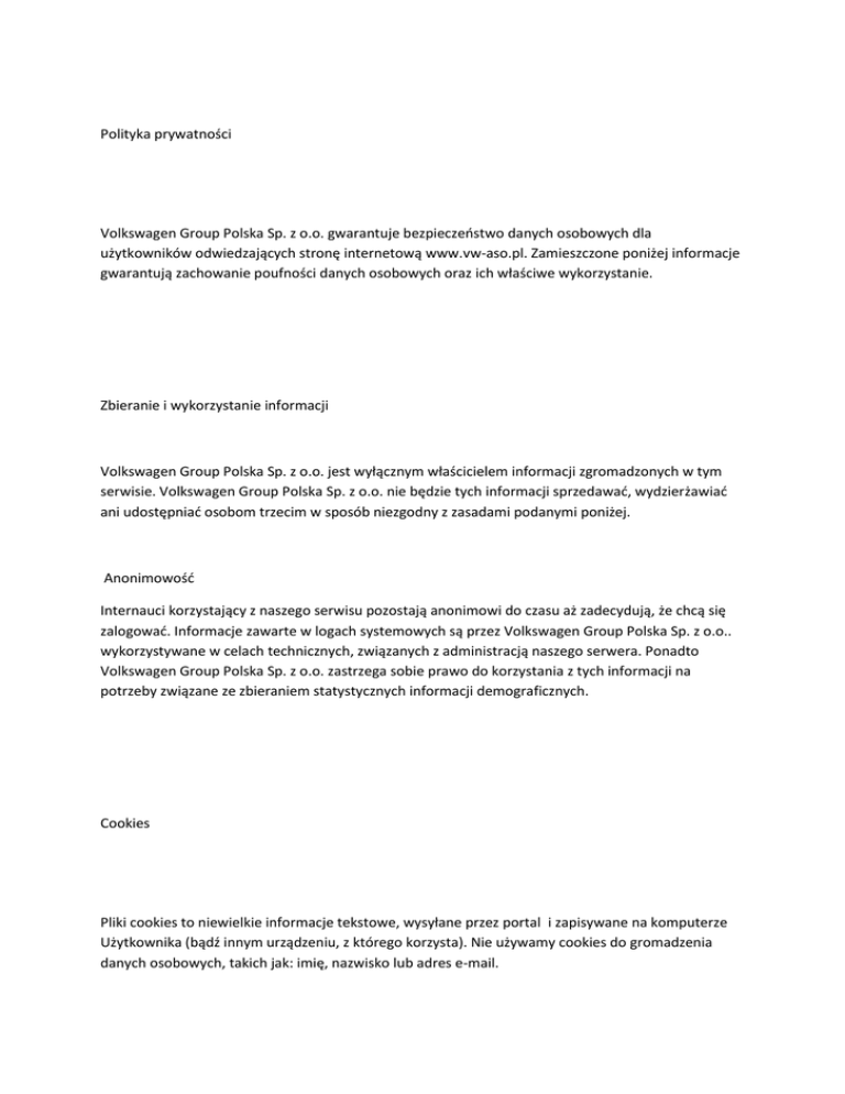 Polityka prywatności Volkswagen Group Polska Sp. z o.o. gwarantuje bezpieczeństwo danych osobowych dla użytkowników odwiedzających stronę internetową www.vw-aso.pl. Zamieszczone poniżej informacje gwarantują zachowanie poufności danych osobowych oraz ich właściwe wykorzystanie. Zbieranie i wykorzystanie informacji Volkswagen Group Polska Sp. z o.o. jest wyłącznym właścicielem informacji zgromadzonych w tym serwisie. Volkswagen Group Polska Sp. z o.o. nie będzie tych informacji sprzedawać, wydzierżawiać ani udostępniać osobom trzecim w sposób niezgodny z zasadami podanymi poniżej. Anonimowość Internauci korzystający z naszego serwisu pozostają anonimowi do czasu aż zadecydują, że chcą się zalogować. Informacje zawarte w logach systemowych są przez Volkswagen Group Polska Sp. z o.o.. wykorzystywane w celach technicznych, związanych z administracją naszego serwera. Ponadto Volkswagen Group Polska Sp. z o.o. zastrzega sobie prawo do korzystania z tych informacji na potrzeby związane ze zbieraniem statystycznych informacji demograficznych. Cookies Pliki cookies to niewielkie informacje tekstowe, wysyłane przez portal i zapisywane na komputerze Użytkownika (bądź innym urządzeniu, z którego korzysta). Nie używamy cookies do gromadzenia danych osobowych, takich jak: imię, nazwisko lub adres e-mail. Portal wykorzystuje pliki cookies w celu rozpoznawania osobistych preferencji Użytkownika. Innymi słowy stosowane przez portal pliki cookies pozwalają na rozpoznanie komputera Użytkownika w czasie kolejnej wizyty w portalu i mają jedynie ułatwiać korzystanie z portalu. Portal wykorzystuje oraz umożliwia korzystanie z plików cookies podmiotom trzecim (Google AdWords, GoogleAnalytics) w celach statystycznych oraz reklamowych. To Użytkownik decyduje, czy chce, aby pliki cookies były zapisywane na jego komputerze. Może dezaktywować lub całkowicie wyłączyć pliki cookies w opcjach swojej przeglądarki internetowej lub wybierając odpowiednią opcję w programach typu Firewall. Może również usunąć zapisane do tej pory pliki cookies. Użytkownik może zablokować usługę Analytics dla reklam displayowych oraz dostosowywać reklamy w sieci reklamowej Google w Menedżerze preferencji reklam. Wyłączenie plików cookies może jednak spowodować, niedogodności w korzystaniu z naszego serwisu. Subskrypcje Aby otrzymać pewne informacje o naszej firmie, konieczne jest podanie przez użytkownika swojego adresu e-mail. Adres ten będzie wykorzystywany przez Volkswagen Group Polska Sp. z o.o. tylko w celu wysłania żądanych informacji. Jeżeli użytkownik chce zrezygnować z tej usługi, może w każdej chwili anulować subskrypcję. Ochrona danych i zachowanie poufności Wszystkie dane o użytkownikach uzyskane przez Volkswagen Group Polska Sp. z o.o. za pośrednictwem tego serwisu są przechowywane i przetwarzane w sposób zapewniający ich bezpieczeństwo, zgodnie z przepisami polskiego prawa. Jednocześnie prosimy o zachowanie ostrożności przy opuszczaniu naszego serwisu, aby nikt postronny nie mógł wykorzystywać lub zmieniać Twoich informacji. Prosimy też o zachowanie ostrożności w udostępnianiu ich osobom trzecim. Zmiany w zasadach zachowania poufności Volkswagen Group Polska Sp. z o.o. zastrzega sobie prawo do wprowadzania zmian w niniejszym oświadczeniu. W związku z tym prosimy użytkowników o okresowe sprawdzanie treści oświadczenia w celu zapoznania się z ewentualnymi zmianami.