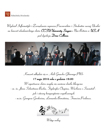 Wydział Informatyki i Zarządzania zaprasza Pracowników i Studentów naszej Uczelni na koncert akademickiego chóru CCSU University Singers z New Britain w USA pod dyrekcją Drew Collinsa. Koncert odbędzie się w Auli Gmachu Głównego PWr 17 maja 2016 roku o godzinie 18:00. W repertuarze chóru znajdą się zarówno dzieła klasyczne - m. in. Jana Sebastiana Bacha, Fryderyka Chopina, Wacława z Szamotuł jak i utwory kompozytorów współczesnych - m.in. Georgesa Gershwina, Leonarda Bernsteina, Francisa Poulenca. Wstęp wolny