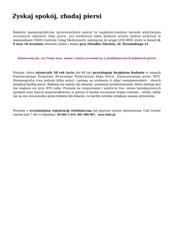Zyskaj spokój, zbadaj piersi Badanie mammograficzne (prześwietlenie piersi) to najskuteczniejsza metoda wykrywania wczesnych objawów raka piersi. Już niebawem takie badanie można będzie wykonać w mammobusie FADO Centrum Usług Medycznych, należącym do grupy LUX MED, który w dniach 6, 9 oraz 10 września odwiedzi Zelów i stanie przy Ośrodku Zdrowia, ul. Żeromskiego 21. Zainteresuj się, czy Twoja żona, mama i siostra uczestniczą w profilaktycznych badaniach piersi! Paniom, które ukończyły 50 rok życia (do 69 lat) przysługuje bezpłatne badanie w ramach Populacyjnego Programu Wczesnego Wykrywania Raka Piersi, finansowanego przez NFZ. Mammografia trwa jedynie kilka minut i polega na zrobieniu 4 zdjęć rentgenowskich – dwóch projekcji każdej piersi. Badania nie należy się obawiać, ponieważ promieniowanie, które emituje jest nie większe niż przy RTG zęba. Pozwala na rozpoznanie i wykrycie tzw. zmian bezobjawowych (guzków oraz innych nieprawidłowości w piersi) w bardzo wczesnym etapie rozwoju – wtedy, kiedy nie są one wyczuwalne przez kobietę lub lekarza, co bardzo istotnie zwiększa szansę wyleczenia. Prosimy o wcześniejszą rejestrację telefoniczną lub poprzez stronę internetową. Call Center czynne jest 7 dni w tygodniu: 58 666 2 444, 801 080 007, www.fado.pl.