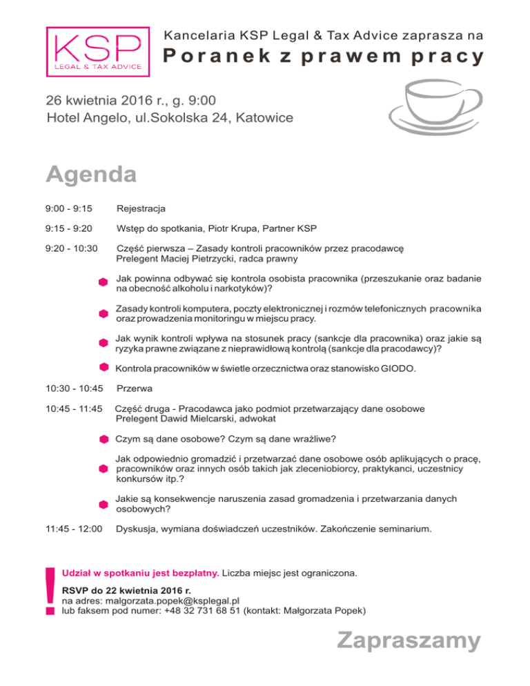 Kancelaria KSP Legal & Tax Advice zaprasza na Poranek z prawem pracy 26 kwietnia 2016 r., g. 9:00 Hotel Angelo, ul.Sokolska 24, Katowice 9:00 - 9:15 Rejestracja 9:15 - 9:20 Wstêp do spotkania, Piotr Krupa, Partner KSP 9:20 - 10:30 Czêœæ pierwsza – Zasady kontroli pracowników przez pracodawcê Prelegent Maciej Pietrzycki, radca prawny Jak powinna odbywaæ siê kontrola osobista pracownika (przeszukanie oraz badanie na obecnoœæ alkoholu i narkotyków)? Zasady kontroli komputera, poczty elektronicznej i rozmów telefonicznych pracownika oraz prowadzenia monitoringu w miejscu pracy. Jak wynik kontroli wp³ywa na stosunek pracy (sankcje dla pracownika) oraz jakie s¹ ryzyka prawne zwi¹zane z nieprawid³ow¹ kontrol¹ (sankcje dla pracodawcy)? Kontrola pracowników w œwietle orzecznictwa oraz stanowisko GIODO. 10:30 - 10:45 Przerwa 10:45 - 11:45 Czêœæ druga - Pracodawca jako podmiot przetwarzaj¹cy dane osobowe Prelegent Dawid Mielcarski, adwokat Czym s¹ dane osobowe? Czym s¹ dane wra¿liwe? Jak odpowiednio gromadziæ i przetwarzaæ dane osobowe osób aplikuj¹cych o pracê, pracowników oraz innych osób takich jak zleceniobiorcy, praktykanci, uczestnicy konkursów itp.? Jakie s¹ konsekwencje naruszenia zasad gromadzenia i przetwarzania danych osobowych? 11:45 - 12:00 Dyskusja, wymiana doœwiadczeñ uczestników. Zakoñczenie seminarium. Udzia³ w spotkaniu jest bezp³atny. Liczba miejsc jest ograniczona. RSVP do 22 kwietnia 2016 r. na adres: [email protected] lub faksem pod numer: +48 32 731 68 51 (kontakt: Ma³gorzata Popek) Kancelaria KSP Legal & Tax Advice zaprasza na Poranek z prawem pracy 26 kwietnia 2016 r., g. 9:00 Hotel Angelo, ul.Sokolska 24, Katowice Formularz zg³oszeniowy nazwa firmy: kod pocztowy: e-mail: miasto: ulica i numer: tel. faks. tel. kom. Uczestnik: Udzia³ w spotkaniu jest bezp³atny. Liczba miejsc jest ograniczona (tylko 1 osoba z firmy) RSVP do 22 kwietnia 2016 r. na adres: [email protected] lub faksem pod numer: +48 32 731 68 51 (kontakt: Ma³gorzata Popek) Kancelaria KSP Legal & Tax Advice zaprasza na Poranek z prawem pracy 26 kwietnia 2016 r., g. 9:00 Hotel Angelo, ul.Sokolska 24, Katowice Sylwetki prelegentów Piotr Krupa, Partner Radca prawny. Szef zespo³u Prawa Pracy KSP. Jest specjalist¹ w dziedzinie prawa spó³ek, fuzji, przejêæ i innych przekszta³ceñ w³asnoœciowych. Doradza w zakresie indywidualnego i zbiorowego prawa pracy, restrukturyzacji zatrudnienia oraz systemów wynagrodzeñ. Pomaga w uregulowaniu kwestii pracowniczych podczas przejêæ zak³adów pracy przez innych pracodawców, transferach i outsourcingu pracowników. Od lat œwiadczy pomoc w zakresie bie¿¹cej obs³ugi prawnej spó³ek, przy realizacji przedsiêwziêæ typu joint-venture oraz znacz¹cych projektów restrukturyzacyjnych m.in. z sektorów: energetycznego, metalowego, hutniczego, budowy maszyn, infrastrukturalnego, budowniczego, górniczego oraz motoryzacyjnego. Dawid Mielcarski, Senior Associate Adwokat. Specjalizuje siê w zakresie prawa nieruchomoœci, prawa administracyjnego, prawa spó³ek oraz procesów s¹dowych. W obszarze jego praktyki znajduje siê tak¿e prawo pracy. Doradza pracodawcom w kwestiach zwi¹zanych z gromadzeniem, przechowywaniem oraz przetwarzaniem danych osobowych. Reprezentuje przedsiêbiorców w sporach z zakresu prawa pracy, doradza równie¿ jak chroniæ siê przed roszczeniami opartymi o mobbing i dyskryminacjê, a w przypadku wyst¹pienia przez pracowników z takimi roszczeniami s³u¿y rad¹ w zakresie zarz¹dzania powsta³ym sporem oraz reprezentuje klientów przed s¹dami pracy. Posiada bogate doœwiadczenie w opracowywaniu i negocjowaniu miêdzynarodowych kontraktów handlowych oraz porozumieñ, w tym umów dotycz¹cych prac projektowych, in¿ynieryjnych i wykoñczeniowych oraz umów dotycz¹cych realizacji procesów budowlanych. Maciej Pietrzycki, Senior Associate Radca prawny. Specjalista w zakresie prawa pracy. Œwiadczy us³ugi w zakresie nawi¹zywania i rozwi¹zywania stosunków pracy oraz w zakresie procedury zwolnieñ grupowych, w tym reprezentuje klientów w sporach w zwi¹zku z roszczeniami z zakresu prawa pracy. Doradza w przygotowaniu dokumentacji pracowniczej, w tym kontraktów menad¿erskich, umów o pracê, regulaminów pracy, regulaminów wynagradzania oraz umów o zakazie konkurencji. Uczestniczy jako doradca pracodawców w negocjacjach ze stron¹ zwi¹zkow¹ w ramach procedury sporu zbiorowego oraz w negocjacjach z przedstawicielami rad pracowników. Pomaga pracodawcom formu³owaæ zasady dobrych praktyk, procedury antydyskryminacyjne i antymobbingowe, które sprzyjaj¹ unikaniu procesów s¹dowych.