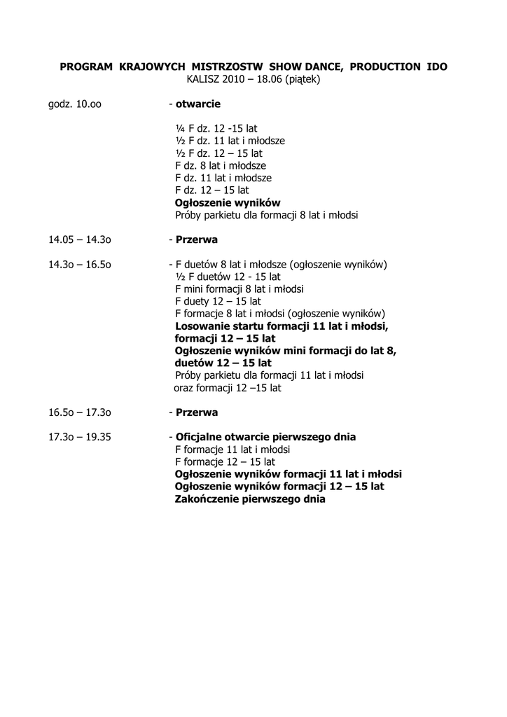 PROGRAM KRAJOWYCH MISTRZOSTW SHOW DANCE, PRODUCTION IDO KALISZ 2010 – 18.06 (piątek) godz. 10.oo - otwarcie ¼ F dz. 12 -15 lat ½ F dz. 11 lat i młodsze ½ F dz. 12 – 15 lat F dz. 8 lat i młodsze F dz. 11 lat i młodsze F dz. 12 – 15 lat Ogłoszenie wyników Próby parkietu dla formacji 8 lat i młodsi 14.05 – 14.3o - Przerwa 14.3o – 16.5o - F duetów 8 lat i młodsze (ogłoszenie wyników) ½ F duetów 12 - 15 lat F mini formacji 8 lat i młodsi F duety 12 – 15 lat F formacje 8 lat i młodsi (ogłoszenie wyników) Losowanie startu formacji 11 lat i młodsi, formacji 12 – 15 lat Ogłoszenie wyników mini formacji do lat 8, duetów 12 – 15 lat Próby parkietu dla formacji 11 lat i młodsi oraz formacji 12 –15 lat 16.5o – 17.3o - Przerwa 17.3o – 19.35 - Oficjalne otwarcie pierwszego dnia F formacje 11 lat i młodsi F formacje 12 – 15 lat Ogłoszenie wyników formacji 11 lat i młodsi Ogłoszenie wyników formacji 12 – 15 lat Zakończenie pierwszego dnia PROGRAM KRAJOWYCH MISTRZOSTW SHOW DANCE, PRODUCTION IDO KALISZ 2010 – 19.06 (sobota) godz. 10.oo - otwarcie ¼ F solo dz. 16 lat i starsze F solo ch. 11 lat i młodsi F solo ch. 12 – 15 lat Ogłoszenie wyników ch. 11 lat i młodsi, 12 – 15 lat ½ F solo dz. 16 lat i starsze F solo ch. 16 lat i starsi F solo dz. 16 lat i starsze Ogłoszenie wyników ch. 16 lat i starsi Ogłoszenie wyników dz. 16 lat i starsze F duety 11 lat i młodsze F duety 16 lat i starsze Ogłoszenie wyników duety 11 lat i młodsze Ogłoszenie wyników duety 16 lat i starsze Losowanie kolejności startu formacje 16 lat i starsze ½ F mini formacje 12 – 15 lat ½ F mini formacje 16 lat i starsi F mini formacji 11 lat i młodsi F mini formacji 12 – 15 lat F mini formacji 16 lat i starsi Ogłoszenie wyników mini formacji 11 lat i młodsi Ogłoszenie wyników mini formacji 12 – 15 lat Ogłoszenie wyników mini formacji 16 lat i starsi Próby formacji 16 lat i starsi Próby produkcji godz. 17.3o – 18.oo - Przerwa godz. 18.oo – 20.3o - Oficjalne otwarcie F formacje 16 lat i starsi F production Ogłoszenie wyników formacji 16 lat i starsi Ogłoszenie wyników production Oficjalne zamknięcie Krajowych Mistrzostw IDO