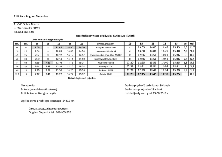 PHU Caro Bogdan Stepaniuk 11-040 Dobre Miasto ul. Warszawska 5B/11 tel. 604-265-448 Rozkład jazdy trasa : Różynka- Kwiecewo-Świątki Linia komunikacyjna zwykła km. ZS ZS ZS ZS Dworce,przystanki 0 odl. czas ZS 0 7:00 x 13:05 14:05 14:50 Rózynka centrum 06 2,5 2,5 7:04 x 13:09 14:09 14:54 Kwiecewo Kolonia 04 4,9 2,4 7:07 x 13:12 14:12 14:57 Kwiecewo skrz. Z dr. Woj. 530 02 5,5 0,6 7:09 x 13:14 14:14 14:59 Kwiecewo Kolonia 30/03 6,1 0,6 7:35 7:35 13:16 14:16 15:01 Kwiecewo 05/28 8,9 2,8 7:14 7:38 13:19 14:19 15:04 Drzazgi 07/26 9,9 1,0 7:15 7:39 13:20 14:20 15:05 Jankowo 24/09 11,7 1,8 7:17 7:41 13:22 14:22 15:07 Światki 22/11 czas ZS x x x x 07:30 07:26 07:24 07:20 ZS 13:03 13:00 12:56 12:56 12:55 12:51 12:49 12:45 ZS 14:03 14:00 13:56 13:56 13:55 13:51 13:49 13:45 ZS 14:48 14:45 14:41 14:41 14:40 14:36 14:34 14:30 Linia obsługiwana 1 pojazdem Oznaczenia: S- Kursuje w dni nauki szkolnej Z- Linia komunikacyjna zwykła Ogólna suma przebiegu- rocznego- 34310 km Osoba zarządzająca transportem : Bogdan Stepaniuk tel . 608-353-973 średnia prędkość techniczna- 39 km/h średni czas przejazdu- 18 minut rozkład jazdy ważny od 25-08-2016 r. ZS 15:43 15:40 15:36 15:36 15:35 15:31 15:29 15:25 km odl 2,6 11,7 2,9 9,1 0 0,0 0,6 6,2 2,8 5,6 1 2,8 1,8 1,8 0 0,0