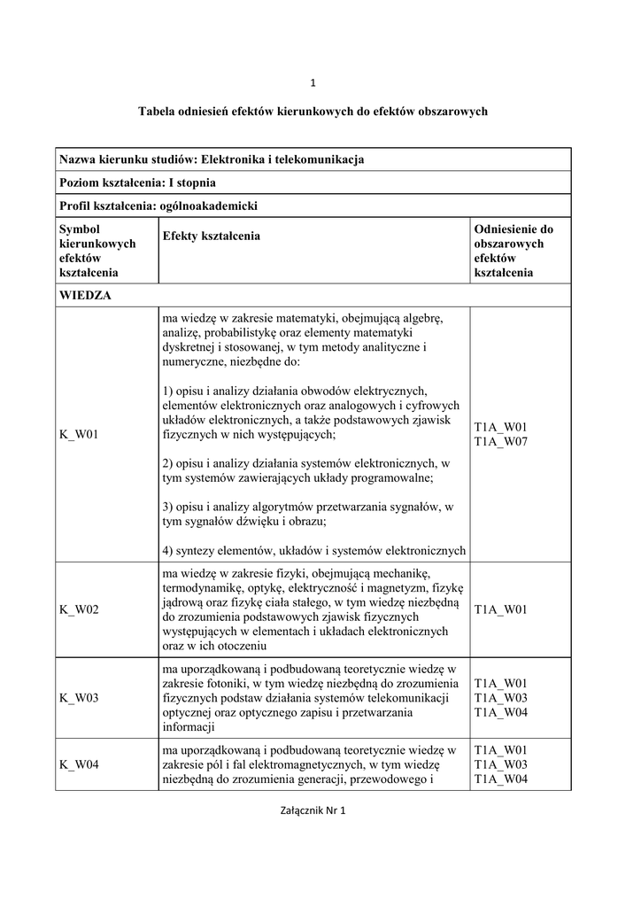 1 Tabela odniesień efektów kierunkowych do efektów obszarowych Nazwa kierunku studiów: Elektronika i telekomunikacja Poziom kształcenia: I stopnia Profil kształcenia: ogólnoakademicki Symbol kierunkowych efektów kształcenia Odniesienie do obszarowych efektów kształcenia Efekty kształcenia WIEDZA ma wiedzę w zakresie matematyki, obejmującą algebrę, analizę, probabilistykę oraz elementy matematyki dyskretnej i stosowanej, w tym metody analityczne i numeryczne, niezbędne do: K_W01 1) opisu i analizy działania obwodów elektrycznych, elementów elektronicznych oraz analogowych i cyfrowych układów elektronicznych, a także podstawowych zjawisk fizycznych w nich występujących; T1A_W01 T1A_W07 2) opisu i analizy działania systemów elektronicznych, w tym systemów zawierających układy programowalne; 3) opisu i analizy algorytmów przetwarzania sygnałów, w tym sygnałów dźwięku i obrazu; 4) syntezy elementów, układów i systemów elektronicznych K_W02 ma wiedzę w zakresie fizyki, obejmującą mechanikę, termodynamikę, optykę, elektryczność i magnetyzm, fizykę jądrową oraz fizykę ciała stałego, w tym wiedzę niezbędną T1A_W01 do zrozumienia podstawowych zjawisk fizycznych występujących w elementach i układach elektronicznych oraz w ich otoczeniu K_W03 ma uporządkowaną i podbudowaną teoretycznie wiedzę w zakresie fotoniki, w tym wiedzę niezbędną do zrozumienia fizycznych podstaw działania systemów telekomunikacji optycznej oraz optycznego zapisu i przetwarzania informacji T1A_W01 T1A_W03 T1A_W04 K_W04 ma uporządkowaną i podbudowaną teoretycznie wiedzę w zakresie pól i fal elektromagnetycznych, w tym wiedzę niezbędną do zrozumienia generacji, przewodowego i T1A_W01 T1A_W03 T1A_W04 Załącznik Nr 1 2 bezprzewodowego przesyłania oraz detekcji sygnałów w paśmie wysokich częstotliwości K_W05 ma elementarną wiedzę w zakresie materiałów stosowanych T1A_W02 w przemyśle elektronicznym T1A_W07 K_W06 ma wiedzę w zakresie architektury komputerów, w szczególności warstwy sprzętowej K_W07 ma wiedzę w zakresie metodyki i technik programowania w T1A_W02 wybranych językach, takich jak C, VHDL T1A_W04 K_W08 ma szczegółową wiedzę w zakresie architektury i oprogramowania systemów mikroprocesorowych (języki wysokiego i niskiego poziomu) K_W09 ma elementarną wiedzę w zakresie architektury systemów i sieci komputerowych oraz systemów operacyjnych, T1A_W02 niezbędną do instalacji, obsługi i utrzymania narzędzi T1A_W07 informatycznych służących do symulacji i projektowania elementów, układów i systemów elektronicznych K_W10 ma uporządkowaną wiedzę w zakresie podstaw T1A_W02 telekomunikacji oraz systemów i sieci telekomunikacyjnych K_W11 ma uporządkowaną wiedzę w zakresie urządzeń wchodzących w skład sieci teleinformatycznych, w tym sieci bezprzewodowych, oraz konfigurowania tych urządzeń w sieciach lokalnych T1A_W02 T1A_W07 K_W12 ma elementarną wiedzę w zakresie podstaw sterowania i automatyki T1A_W02 K_W13 ma uporządkowaną i podbudowaną teoretycznie wiedzę w zakresie zasad działania elementów elektronicznych (w tym T1A_W03 elementów optoelektronicznych, elementów mocy oraz T1A_W04 czujników), analogowych i cyfrowych układów elektronicznych oraz prostych systemów elektronicznych K_W14 ma uporządkowaną wiedzę w zakresie teorii obwodów elektrycznych oraz w zakresie teorii sygnałów i metod ich przetwarzania T1A_W03 T1A_W04 K_W15 ma podstawową wiedzę w zakresie metrologii, zna i rozumie metody pomiaru i ekstrakcji podstawowych wielkości charakteryzujących elementy i układy elektroniczne różnego typu, zna metody obliczeniowe i narzędzia informatyczne niezbędne do analizy wyników eksperymentu T1A_W03 T1A_W04 T1A_W07 K_W16 zna i rozumie procesy wytwarzania elementów T1A_W04 Załącznik Nr 1 T1A_W02 T1A_W03 T1A_W02 T1A_W04 T1A_W07 3 elektronicznych, układów scalonych i mikrosystemów T1A_W07 K_W17 zna i rozumie procesy konstruowania i wytwarzania prostych urządzeń elektronicznych T1A_W04 T1A_W07 K_W18 zna i rozumie metodykę projektowania elementów elektronicznych, analogowych i cyfrowych układów elektronicznych (również w wersji scalonej) oraz systemów T1A_W03 elektronicznych, a także metody i techniki wykorzystywane T1A_W04 w projektowaniu, w tym metody sztucznej inteligencji; zna T1A_W07 języki opisu sprzętu i komputerowe narzędzia do projektowania i symulacji układów i systemów K_W19 orientuje się w obecnym stanie oraz najnowszych trendach rozwojowych elektroniki T1A_W05 K_W20 ma elementarną wiedzę na temat cyklu życia urządzeń i systemów elektronicznych T1A_W06 K_W21 ma podstawową wiedzę niezbędną do rozumienia pozatechnicznych uwarunkowań działalności inżynierskiej; T1A_W08 zna podstawowe zasady bezpieczeństwa i higieny pracy obowiązujące w przemyśle elektronicznym K_W22 ma elementarną wiedzę w zakresie ochrony własności intelektualnej oraz prawa patentowego T1A_W10 K_W23 ma elementarną wiedzę w zakresie zarządzania, w tym zarządzania jakością, i prowadzenia działalności gospodarczej T1A_W09 K_W24 zna ogólne zasady tworzenia i rozwoju form indywidualnej przedsiębiorczości T1A_W11 K_W25 ma wiedzę w zakresie budowy i zasad działania układów do T1A_W04 przetwarzania dźwięków i obrazu; zna budowę i działanie T1A_W07 radia i telewizji cyfrowej K_W26 ma wiedzę w zakresie niezawodności układów i elementów T1A_W06 elektronicznych K_W27 ma wiedzę w zakresie systemów łączności bezprzewodowej T1A_W05 stosowanych w sieciach i systemach teleinformatycznych T1A_W07 K_W28 ma wiedzę w zakresie budowy anten i propagacji fal radiowych T1A_W05 T1A_W07 K_W29 ma wiedzę w zakresie radiofonii cyfrowej i telewizji cyfrowej dotyczącą tworzenia sygnałów, przetwarzania, nadawania i odbioru sygnałów dźwiękowych i wizyjnych T1A_W04 T1A_W07 K_W30 ma wiedzę w zakresie przetwarzania, kompresji sygnałów T1A_W05 Załącznik Nr 