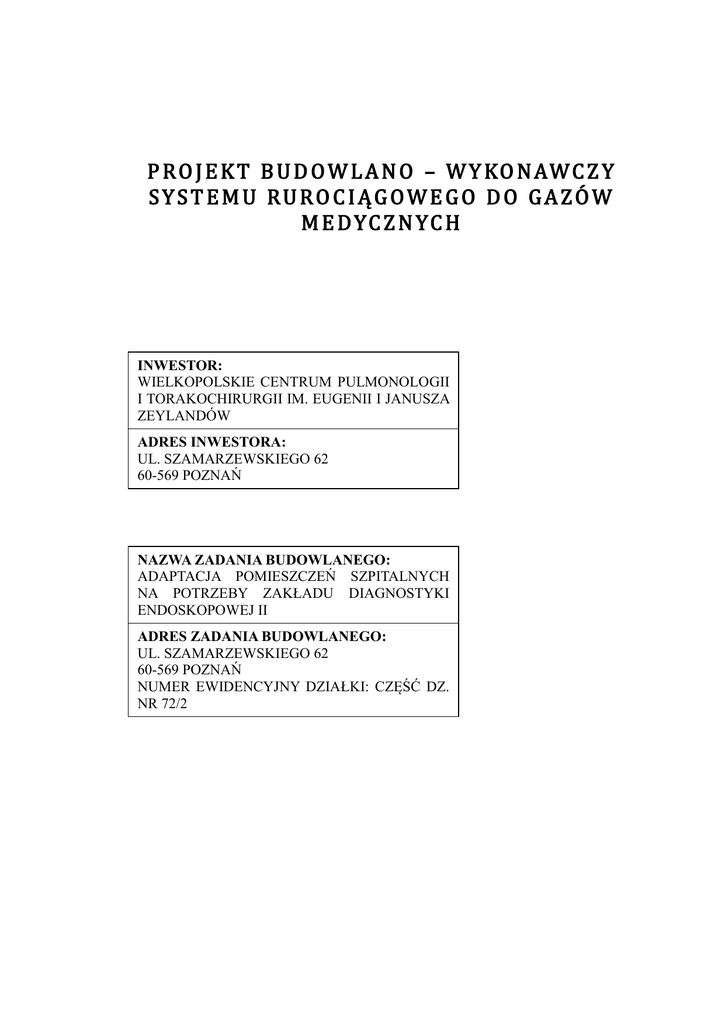 P R O J E K T B U D O W L A N O – W Y KO N AW C Z Y SYSTEMU RUROCIĄGOWEGO DO GAZÓW M E D YC Z N YC H INWESTOR: WIELKOPOLSKIE CENTRUM PULMONOLOGII I TORAKOCHIRURGII IM. EUGENII I JANUSZA ZEYLANDÓW ADRES INWESTORA: UL. SZAMARZEWSKIEGO 62 60-569 POZNAŃ NAZWA ZADANIA BUDOWLANEGO: ADAPTACJA POMIESZCZEŃ SZPITALNYCH NA POTRZEBY ZAKŁADU DIAGNOSTYKI ENDOSKOPOWEJ II ADRES ZADANIA BUDOWLANEGO: UL. SZAMARZEWSKIEGO 62 60-569 POZNAŃ NUMER EWIDENCYJNY DZIAŁKI: CZĘŚĆ DZ. NR 72/2 ADAPTACJA POMIESZCZEŃ SZPITALNYCH NA POTRZEBY ZAKŁADU DIAGNOSTYKI ENDOSKOPOWEJ II W WIELKOPOLSKIM CENTRUM PULMONOLOGII I TORAKOCHIRURGII OŚWIADCZENIA – PROJEKTANCI Niżej podpisani projektanci oświadczają, że projekt niniejszy został sporządzony zgodnie z obowiązującymi przepisami i zasadami wiedzy technicznej (art. 20, ust. 4 PB) BRANŻA INSTALACJA SYSTEMÓW RUROCIĄGOWYCH DO GAZÓW MEDYCZNYCH IMIĘ I NAZWISKO NUMER UPRAWNIEŃ PODPIS I DATA OPRACOWANIA Projektował: mgr inż. Ewa Śródecka-Ćwikła Sprawdził: Strona | 2 ADAPTACJA POMIESZCZEŃ SZPITALNYCH NA POTRZEBY ZAKŁADU DIAGNOSTYKI ENDOSKOPOWEJ II W WIELKOPOLSKIM CENTRUM PULMONOLOGII I TORAKOCHIRURGII STRONA TYTUŁOWA – SPIS ZAWARTOŚCI PROJEKTU INSTALACYJNEGO Spis treści PROJEKT WYKONAWCZY INSTALACJI SYSTEMÓW RUROCIĄGOWYCH DO GAZÓW MEDYCZNYCH CZĘŚĆ OPISOWA 1. Podstawa, przedmiot i zakres opracowania ............................................... Str.4 2. Źródła i główne istniejące rurociągi zasilające ........................................... Str.5 3. Punkty pobory ...................................................................................... Str.6 4. Opis instalacji wewnętrznej .................................................................... Str.7 5. Systemy monitorowania i systemy alarmowe ............................................ Str.8 6. Wykaz prób jakie należy wykonać przed oddaniem inst. do eksploatowania .. Str.9 7. Podstawowe przepisy prawne i normy .....................................................Str.10 DECYZJE O NADANIU UPRAWNIEŃ I ZAŚWIADCZENIAZ IZBY CZĘŚĆ RYSUNKOWA GM-01 Rzut parteru GM-02 Rzut przekrój skala 1:100 ............................................................. skala 1:100 ............................................................. Strona | 3 ADAPTACJA POMIESZCZEŃ SZPITALNYCH NA POTRZEBY ZAKŁADU DIAGNOSTYKI ENDOSKOPOWEJ II W WIELKOPOLSKIM CENTRUM PULMONOLOGII I TORAKOCHIRURGII PROJEKT WYKONAWCZY INSTALACJI SYSTEMÓW RUROCIĄGOWYCH DO GAZÓW MEDYCZNYCH 1. Podstawa, przedmiot i zakres opracowania Podstawa opracowania zlecenie Inwestora, projekt budowlany adaptacji pomieszczeń założenia technologii zamieszczone w projekcie budowlanym inwentaryzacja istniejących systemów rurociągowych do gazów medycznych projekty wykonawcze związane z poprzednimi inwestycjami z lat 20092010 uzgodnienia z Inwestorem uzgodnienia międzybranżowe Przedmiot i zakres opracowania Przedmiotem opracowania jest nowa instalacja systemu rurociągowego do gazów medycznych dla pomieszczeń adaptowanych na potrzeby Zakładu Diagnostyki Endoskopowej II. Zakład będzie zlokalizowany na parterze Budynku Głównego, w dawnych pomieszczeniach aptecznych, znajdujących się przy holu między Łącznikiem a Rejestracją Szpitala. Zakład będzie drugą tego typu jednostką szpitalną znajdującą się na terenie Wielkopolskiego Centrum Pulmonologii i Torakochirurgii. Pierwsza zmodernizowana w 3009 roku znajduje się na I piętrze Budynku Nr 2 między Oddziałem Pulmonologicznym a Łącznikiem. Zakres opracowania obejmuje następujące instalacje: instalację tlenu medycznego O2, instalację sprężonego powietrza do oddychania 0,5 MPa, instalację próżni medycznej, instalację systemów monitorowania i systemów alarmowych dla w/w gazów medycznych System rurociągowy do gazów medycznych musi być wykonany przez certyfikowanego wytwórcę i odebrany w sposób umożliwiający przekazanie instalacji jako wyrób medyczny z nadaną deklaracją zgodności. Strona | 4 ADAPTACJA POMIESZCZEŃ SZPITALNYCH NA POTRZEBY ZAKŁADU DIAGNOSTYKI ENDOSKOPOWEJ II W WIELKOPOLSKIM CENTRUM PULMONOLOGII I TORAKOCHIRURGII 2. Źródła i główne istniejące rurociągi zasilające Tlen medyczny ze stacjonarnego zbiornika kriogenicznego i sprężone powietrze do oddychania z butli przygotowywane są centralnie. Istniejąca zewnętrzna sieć dystrybuująca tlen medyczny i sprężone powietrze do oddychania została zmodernizowana w 2009 roku i biegnie z Rozdzielni Gazów do piwnicy Budynku Głównego skąd rozchodzi się zasilając poszczególne oddziały: Torakochirurgię I, Torakochirurgię II, Oddział Rehabilitacyjny, Zakład Endoskopii, Zakład Diagnostyki Obrazowej oraz piwnicą łączy się z Budynkiem Nr 2 zasilając Oddział Onkologiczny, Oddział Pulmonologiczny i Oddział PulmonologicznoIzolacyjny z Pododdziałem Opieki Paliatywnej. Zmodernizowana maszynownia próżni dla całego Szpitala zlokalizowana została w pomieszczeniu na poziomie piwnic Budynku Nr 2. Z nowej maszynowni próżni pod stropem w komunikacji piwnic budynków nr 2, nr 11 i nr 1 biegnie główny przewód zasilający Ø42. Strona | 5 ADAPTACJA POMIESZCZEŃ SZPITALNYCH NA POTRZEBY ZAKŁADU DIAGNOSTYKI ENDOSKOPOWEJ II W WIELKOPOLSKIM CENTRUM PULMONOLOGII I TORAKOCHIRURGII 3. Punkty poboru Punkty poboru rozmieszczono w oparciu o dyspozycje rysunku technologii oraz dokonane uzgodnienia, których potwierdzeniem jest zaakceptowany przez Inwestora projekt budowlano-wykonawczy. Punkty poboru gazów medycznych znajdować się będą w ścianach dwóch Gabinetów Zabiegowych oraz będzie się znajdowały instalacje doprowadzające gaz do miejsca na suficie, w którym w przyszłości będzie można zamontować kolumny anestezjologiczne. Do wszystkich punktów poboru gazów znajdujących się w Zakładzie Endoskopii II projektuje się doprowadzenie trzech gazów tj. tlenu, sprężonego powietrza 0,5MPa i próżni. Punkty poboru powinny spełniać wymagani