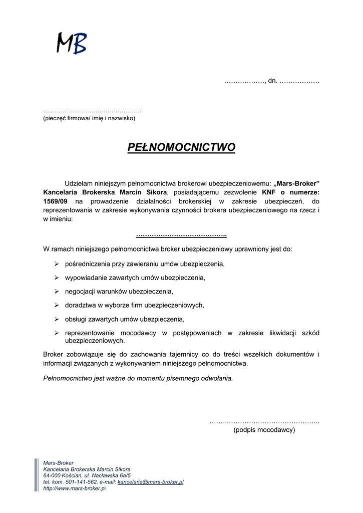 ………………, dn. ……………… …..…………………………………….. (pieczęć firmowa/ imię i nazwisko) PEŁNOMOCNICTWO Udzielam niniejszym pełnomocnictwa brokerowi ubezpieczeniowemu: „Mars-Broker” Kancelaria Brokerska Marcin Sikora, posiadającemu zezwolenie KNF o numerze: 1569/09 na prowadzenie działalności brokerskiej w zakresie ubezpieczeń, do reprezentowania w zakresie wykonywania czynności brokera ubezpieczeniowego na rzecz i w imieniu: ………………………………….. W ramach niniejszego pełnomocnictwa broker ubezpieczeniowy uprawniony jest do: pośredniczenia przy zawieraniu umów ubezpieczenia, wypowiadanie zawartych umów ubezpieczenia, negocjacji warunków ubezpieczenia, doradztwa w wyborze firm ubezpieczeniowych, obsługi zawartych umów ubezpieczenia, reprezentowanie mocodawcy w postępowaniach w zakresie likwidacji szkód ubezpieczeniowych. Broker zobowiązuje się do zachowania tajemnicy co do treści wszelkich dokumentów i informacji związanych z wykonywaniem niniejszego pełnomocnictwa. Pełnomocnictwo jest ważne do momentu pisemnego odwołania. .……..………………………………….. (podpis mocodawcy) Mars-Broker Kancelaria Brokerska Marcin Sikora 64-000 Kościan, ul. Nacławska 6a/5 tel. kom. 501-141-562, e-mail: [email protected] http://www.mars-broker.pl
