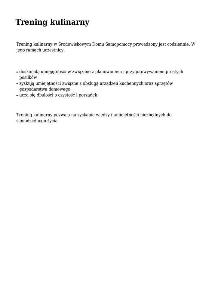 Trening kulinarny Trening kulinarny w Środowiskowym Domu Samopomocy prowadzony jest codziennie. W jego ramach uczestnicy: ● ● ● doskonalą umiejętności w związane z planowaniem i przygotowywaniem prostych posiłków zyskują umiejętności związne z obsługą urządzeń kuchennych oraz sprzętów gospodarstwa domowego uczą się dbałości o czystość i porządek Trening kulinarny pozwala na zyskanie wiedzy i umiejętności niezbędnych do samodzielnego życia.