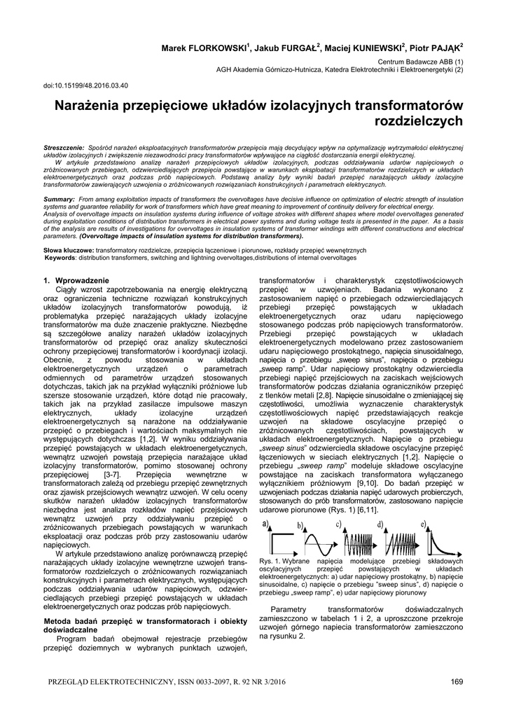 Marek FLORKOWSKI1, Jakub FURGAŁ2, Maciej KUNIEWSKI2, Piotr PAJĄK2 Centrum Badawcze ABB (1) AGH Akademia Górniczo-Hutnicza, Katedra Elektrotechniki i Elektroenergetyki (2) doi:10.15199/48.2016.03.40 Narażenia przepięciowe układów izolacyjnych transformatorów rozdzielczych Streszczenie: Spośród narażeń eksploatacyjnych transformatorów przepięcia mają decydujący wpływ na optymalizację wytrzymałości elektrycznej układów izolacyjnych i zwiększenie niezawodności pracy transformatorów wpływające na ciągłość dostarczania energii elektrycznej. W artykule przedstawiono analizę narażeń przepięciowych układów izolacyjnych, podczas oddziaływania udarów napięciowych o zróżnicowanych przebiegach, odzwierciedlających przepięcia powstające w warunkach eksploatacji transformatorów rozdzielczych w układach elektroenergetycznych oraz podczas prób napięciowych. Podstawą analizy były wyniki badań przepięć narażających układy izolacyjne transformatorów zawierających uzwojenia o zróżnicowanych rozwiązaniach konstrukcyjnych i parametrach elektrycznych. Summary: From amang exploitation impacts of transformers the overvoltages have decisive influence on optimization of electric strength of insulation systems and guarantee reliability for work of transformers which have great meaning to improvement of continuity delivery for electrical energy. Analysis of overvoltage impacts on insulation systems during influence of voltage strokes with different shapes where model overvoltages generated during exploitation conditions of distribution transformers in electrical power systems and during voltage tests is presented in the paper. As a basis of the analysis are results of investigations for overvoltages in insulation systems of transformer windings with different constructions and electrical parameters. (Overvoltage impacts of insulation systems for distribution transformers). Słowa kluczowe: transformatory rozdzielcze, przepięcia łączeniowe i piorunowe, rozkłady przepięć wewnętrznych Keywords: distribution transformers, switching and lightning overvoltages,distributions of internal overvoltages 1. Wprowadzenie Ciągły wzrost zapotrzebowania na energię elektryczną oraz ograniczenia techniczne rozwiązań konstrukcyjnych układów izolacyjnych transformatorów powodują, iż problematyka przepięć narażających układy izolacyjne transformatorów ma duże znaczenie praktyczne. Niezbędne są szczegółowe analizy narażeń układów izolacyjnych transformatorów od przepięć oraz analizy skuteczności ochrony przepięciowej transformatorów i koordynacji izolacji. Obecnie, z powodu stosowania w układach elektroenergetycznych urządzeń o parametrach odmiennych od parametrów urządzeń stosowanych dotychczas, takich jak na przykład wyłączniki próżniowe lub szersze stosowanie urządzeń, które dotąd nie pracowały, takich jak na przykład zasilacze impulsowe maszyn elektrycznych, układy izolacyjne urządzeń elektroenergetycznych są narażone na oddziaływanie przepięć o przebiegach i wartościach maksymalnych nie występujących dotychczas [1,2]. W wyniku oddziaływania przepięć powstających w układach elektroenergetycznych, wewnątrz uzwojeń powstają przepięcia narażające układ izolacyjny transformatorów, pomimo stosowanej ochrony przepięciowej [3-7]. Przepięcia wewnętrzne w transformatorach zależą od przebiegu przepięć zewnętrznych oraz zjawisk przejściowych wewnątrz uzwojeń. W celu oceny skutków narażeń układów izolacyjnych transformatorów niezbędna jest analiza rozkładów napięć przejściowych wewnątrz uzwojeń przy oddziaływaniu przepięć o zróżnicowanych przebiegach powstających w warunkach eksploatacji oraz podczas prób przy zastosowaniu udarów napięciowych. W artykule przedstawiono analizę porównawczą przepięć narażających układy izolacyjne wewnętrzne uzwojeń transformatorów rozdzielczych o zróżnicowanych rozwiązaniach konstrukcyjnych i parametrach elektrycznych, występujących podczas oddziaływania udarów napięciowych, odzwierciedlających przebiegi przepięć powstających w układach elektroenergetycznych oraz podczas prób napięciowych. Metoda badań przepięć w transformatorach i obiekty doświadczalne Program badań obejmował rejestracje przebiegów przepięć doziemnych w wybranych punktach uzwojeń, transformatorów i charakterystyk częstotliwościowych przepięć w uzwojeniach. Badania wykonano z zastosowaniem napięć o przebiegach odzwierciedlających przebiegi przepięć powstających w układach elektroenergetycznych oraz udaru napięciowego stosowanego podczas prób napięciowych transformatorów. Przebiegi przepięć powstających w układach elektroenergetycznych modelowano przez zastosowaniem udaru napięciowego prostokątnego, napięcia sinusoidalnego, napięcia o przebiegu „sweep sinus”, napięcia o przebiegu „sweep ramp”. Udar napięciowy prostokątny odzwierciedla przebiegi napięć przejściowych na zaciskach wejściowych transformatorów podczas działania ograniczników przepięć z tlenków metali [2,8]. Napięcie sinusoidalne o zmieniającej się częstotliwości, umożliwia wyznaczenie charakterystyk częstotliwościowych napięć przedstawiających reakcje uzwojeń na składowe oscylacyjne przepięć o zróżnicowanych częstotliwościach, powstających w układach elektroenergetycznych. Napięcie o przebiegu „sweep sinus” odzwierciedla składowe oscylacyjne przepięć łączeniowych w sieciach elektrycznych [1,2]. Napięcie o przebiegu „sweep ramp” modeluje składowe oscylacyjne powstające na zaciskach transformatora wyłączanego wyłącznikiem próżniowym [9,10]. Do badań przepięć w uzwojeniach podczas działania napięć udarowych probierczych, stosowanych do prób transformatorów, zastosowano napięcie udarowe piorunowe (Rys. 1) [6,11]. Rys. 1. Wybrane napięcia modelujące przebiegi składowych oscylacyjnych pr