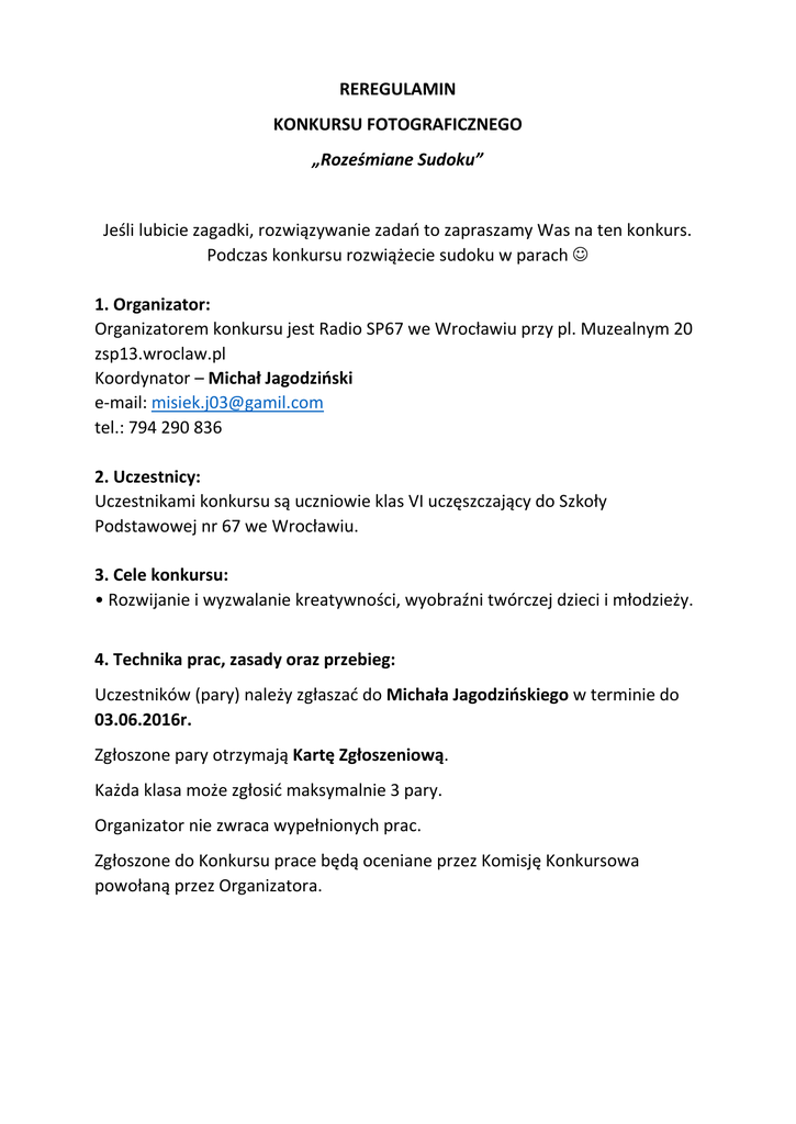 REREGULAMIN KONKURSU FOTOGRAFICZNEGO „Roześmiane Sudoku” Jeśli lubicie zagadki, rozwiązywanie zadań to zapraszamy Was na ten konkurs. Podczas konkursu rozwiążecie sudoku w parach 1. Organizator: Organizatorem konkursu jest Radio SP67 we Wrocławiu przy pl. Muzealnym 20 zsp13.wroclaw.pl Koordynator – Michał Jagodziński e-mail: [email protected] tel.: 794 290 836 2. Uczestnicy: Uczestnikami konkursu są uczniowie klas VI uczęszczający do Szkoły Podstawowej nr 67 we Wrocławiu. 3. Cele konkursu: • Rozwijanie i wyzwalanie kreatywności, wyobraźni twórczej dzieci i młodzieży. 4. Technika prac, zasady oraz przebieg: Uczestników (pary) należy zgłaszać do Michała Jagodzińskiego w terminie do 03.06.2016r. Zgłoszone pary otrzymają Kartę Zgłoszeniową. Każda klasa może zgłosić maksymalnie 3 pary. Organizator nie zwraca wypełnionych prac. Zgłoszone do Konkursu prace będą oceniane przez Komisję Konkursowa powołaną przez Organizatora. Załącznik nr 1 OŚWIADCZENIE O WYRAŻENIU ZGODY NA UDZIAŁ W KONKURSIE „Roześmiane Sudoku” I PRZETWARZANIE DANYCH OSOBOWYCH ORAZ POTWIERDZENIE ZAPOZNANIA SIĘ Z REGULAMINEM Ja ……………………………………………….. wyrażam zgodę na udział w konkursie „Roześmiane Sudoku” mojego dziecka …………………………………………………….. Oświadczam także, że wyrażam zgodę na przetwarzanie danych osobowych dziecka, umieszczanie wyników, prac na stronie internetowej zsp13.wroclaw.pl oraz potwierdzam zapoznanie się z regulaminem. ………………………………………………….. Podpis Rodzica oraz Data Załącznik nr 2 KARTA ZGŁOSZENIOWA Para nr………. Imię i Nazwisko uczestnika: ………………………………………………………………………...... Klasa: …………………………………………………………………………………………………………….. Wiek uczestnika: ……………………………………………………………………………………………. Imię i Nazwisko uczestnika: ………………………………………………………………………...... Klasa: …………………………………………………………………………………………………………….. Wiek uczestnika: …………………………………………………………………………………………….