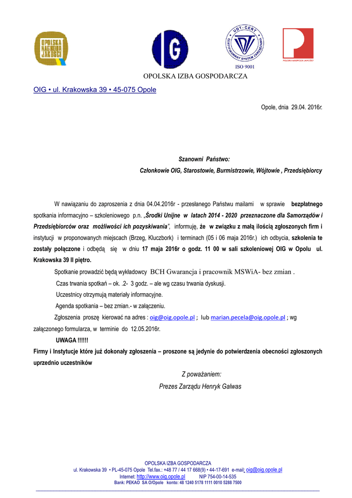 OPOLSKA IZBA GOSPODARCZA OIG • ul. Krakowska 39 • 45-075 Opole Opole, dnia 29.04. 2016r. Szanowni Państwo: Członkowie OIG, Starostowie, Burmistrzowie, Wójtowie , Przedsiębiorcy W nawiązaniu do zaproszenia z dnia 04.04.2016r - przesłanego Państwu mailami w sprawie bezpłatnego spotkania informacyjno – szkoleniowego p.n. „Środki Unijne w latach 2014 - 2020 przeznaczone dla Samorządów i Przedsiębiorców oraz możliwości ich pozyskiwania”, informuję, że w związku z małą ilością zgłoszonych firm i instytucji w proponowanych miejscach (Brzeg, Kluczbork) i terminach (05 i 06 maja 2016r.) ich odbycia, szkolenia te zostały połączone i odbędą się w dniu 17 maja 2016r o godz. 11 00 w sali szkoleniowej OIG w Opolu ul. Krakowska 39 II piętro. Spotkanie prowadzić będą wykładowcy BCH Gwarancja i pracownik MSWiA- bez zmian . Czas trwania spotkań – ok. .2- 3 godz. – ale wg czasu trwania dyskusji. Uczestnicy otrzymują materiały informacyjne. Agenda spotkania – bez zmian.- w załączeniu. Zgłoszenia proszę kierować na adres : [email protected] ; lub [email protected] ; wg załączonego formularza, w terminie do 12.05.2016r. UWAGA !!!!!! Firmy i Instytucje które już dokonały zgłoszenia – proszone są jedynie do potwierdzenia obecności zgłoszonych uprzednio uczestników Z poważaniem: Prezes Zarządu Henryk Galwas OPOLSKA IZBA GOSPODARCZA ul. Krakowska 39 • PL-45-075 Opole Tel.fax.: +48 77 / 44 17 668(9) • 44-17-691 e-mail: [email protected] Internet: http://www.oig.opole.pl NIP 754-00-14-535 Bank: PEKAO SA O/Opole konto: 48 1240 5178 1111 0010 5288 7500 ________________________________________________________________________________________________ KARTA ZGŁOSZENIA UCZESTNICTWA W SEMINARIUM Zgłaszam udział w spotkaniu organizowanym w dniu 17 maja 2016r. dotyczącym możliwości pozyskania środków finansowych z funduszy europejskich , które odbędzie się w Opolu ul. Krakowska 39 II p. Prosimy o wypełnienie drukowanymi literami Wypełnioną kartę zgłoszeniową prosimy przesłać do Opolskiej Izby Gospodarczej 45-075 Opole ul. Krakowska 39 , na numer faksu 77 44 17 668(669,691) lub na adres e-mail: [email protected] lub [email protected] Nazwa Firmy/Instytucji Firma/Instytucja jest: mikroprzedsiębiorstwem (do 9 prac.) BRANŻA : Usługowa małym przedsiębiorstwem (10-49 prac.) średnim przedsiębiorstwem (50-249 prac.) dużym przedsiębiorstwem (pow. 250 prac.) Produkcyjna Handlowa Budowlana inna ………………………………………. Samorząd : gminny, powiatowy Adres Telefon Faks E-mail NIP Dane uczestników: Imię i nazwisko, stanowisko Kontakt tel., e-mail 1. ________________________________________________ 2. ________________________________________________ FIRMA CZŁONKOWSKA TAK NIE Wyrażam zgodę na przetwarzanie moich danych osobowych zawartych w niniejszym zgłoszeniu w celach niezbędnych do organizacji seminarium oraz w celach marketingowych w rozumieniu ustawy z dnia 29 sierpnia 1997r. o ochronie danych osobowych (Dz. U Nr 133,poz. 883 z póżn. zm.) miejscowość, data pieczęć firmowa, podpis osoby upoważnione Program spotkania w dniach: 17.05.2016r. 11:00 – 11:20 11:20 – 11:30 11:30 – 11:45 11:45 – 11:50 11:50 – 12:00 12:00 – 12:05 12:05 – 12:10 12:10 – 12:25 12:25 – 12:40 Możliwości wsparcia w ramach Programu Operacyjnego Infrastruktura i Środowisko 2014 – 2020: Działanie 1.5 Efektywna dystrybucja ciepła i chłodu Działanie 2.2 Gospodarka odpadami komunalnymi Działanie 2.3 Gospodarka wodno-ściekowa w aglomeracjach Działanie 2.4 Ochrona przyrody i edukacja ekologiczna Działanie 2.5 Poprawa jakości środowiska miejskiego Działanie 3.2 Rozwój transportu morskiego, śródlądowych dróg wodnych i połączeń multimodalnych Działanie 4.2 Zwiększenie dostępności transportowej ośrodków miejskich leżących w sieci drogowej TEN-T i odciążenie miast od nadmiernego ruchu drogowego Działanie 6.1 Rozwój publicznego transportu zbiorowego w miastach. Możliwości wsparcia w ramach Programu Operacyjnego Wiedza, Edukacja, Rozwój 2014 – 2020 Działanie 2.10 Wysoka jakość systemu oświaty Działanie 2.14 Rozwój narzędzi dla uczenia się przez całe życie Działanie 2.19 Usprawnienie procesów inwestycyjno-budowlanych i planowania przestrzennego Możliwości wsparcia w ramach RPO 2014-2020 Województwa Opolskiego Poddziałanie 2.2.1 Przygotowanie terenów inwestycyjnych Poddziałanie 3.2.1 Efektywność energetyczna w budynkach użyteczności publicznej Poddziałanie 4.1 Mała retencja Poddziałanie 5.3.1 Dziedzictwo kulturowe i kultura Poddziałanie 5.3.2 Dziedzictwo kulturowe i kultura na obszarach Działanie 6.1 Infrastruktura drogowa Możliwości wsparcia w ramach RPO 2014-2020 Województwa Opolskiego EFS Możliwości wsparcia w ramach Programu Rozwoju Obszarów Wiejskich Możliwości wsparcia w ramach Programu Razem bezpieczniej im. Władysława Stasiaka. Fundusze Europejskie na lata 2014-2020 Możliwości wsparcia w ramach RPO 2014-2020 Województwa Opolskiego: Działanie 1.1 - Innowacje w przedsiębiorstwach Poddziałanie 2.1.1 - Nowe produkty i usługi w MŚP Działanie 2.3 – Wsparcie otoczenia biznesu Działanie 3.4 - Efektywność energetyczna w MSP Środki z EFS Możliwości wsparcia w ramach PO Inteligentny Rozwój 2014-2020: Poddziałanie 2.3.4 Ochrona własności przemysłowej Poddziałanie 1.1.1 Badania przemysłowe i prace rozwojowe Poddziałanie 1.1.2 Prace B+R związane z wytworzeniem instalacji pilotażowej/demonstracyjnej Działanie 2.1 Tworzenie Centrów Badawczo – Rozwojowych Poddziałanie 2.3.2 Bony na innowacje dla MŚP Poddziałanie 3.2.1 Badania na rynek Poddziałanie 3.2.2 Kredyt na innowacje technologiczne 12:40 – 13:15 Dyskusja, indywidualne konsultacje z przedstawicielami BCH GWARANCJA 13:00 – 13:15 13:15 – 13:45 Fundusze Europejskie na lata 2014-2020 Możliwości wsparcia w ramach RPO 2014-2020 Województwa Opolskiego: Działanie 1.1 - 