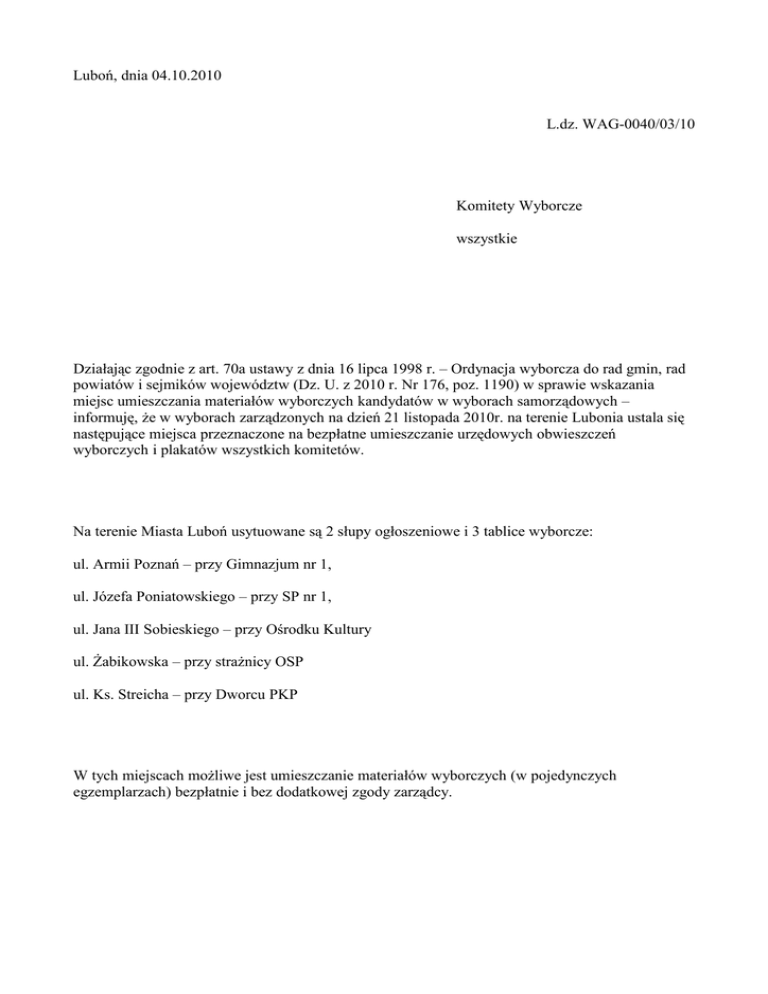 Luboń, dnia 04.10.2010 L.dz. WAG-0040/03/10 Komitety Wyborcze wszystkie Działając zgodnie z art. 70a ustawy z dnia 16 lipca 1998 r. – Ordynacja wyborcza do rad gmin, rad powiatów i sejmików województw (Dz. U. z 2010 r. Nr 176, poz. 1190) w sprawie wskazania miejsc umieszczania materiałów wyborczych kandydatów w wyborach samorządowych – informuję, że w wyborach zarządzonych na dzień 21 listopada 2010r. na terenie Lubonia ustala się następujące miejsca przeznaczone na bezpłatne umieszczanie urzędowych obwieszczeń wyborczych i plakatów wszystkich komitetów. Na terenie Miasta Luboń usytuowane są 2 słupy ogłoszeniowe i 3 tablice wyborcze: ul. Armii Poznań – przy Gimnazjum nr 1, ul. Józefa Poniatowskiego – przy SP nr 1, ul. Jana III Sobieskiego – przy Ośrodku Kultury ul. Żabikowska – przy strażnicy OSP ul. Ks. Streicha – przy Dworcu PKP W tych miejscach możliwe jest umieszczanie materiałów wyborczych (w pojedynczych egzemplarzach) bezpłatnie i bez dodatkowej zgody zarządcy. Do umieszczenia materiałów wyborczych na obiektach stanowiących własność Miasta Luboń – t.j. na słupach oświetleniowych (tylko przy ul. Dębieckiej i ul. Unijnej), na drzewach, chodnikach, barierkach, balustradach, słupkach (nie dotyczy znaków drogowych) – wymagane jest pisemne zawiadomienie Urzędu Miasta Luboń. Pisemne zawiadomienie o zamiarze umieszczania materiałów wyborczych winno zawierać: oznaczenie komitetu wyborczego, określenie obiektu na jakim materiały mają być umieszczone, określenie ulic przy, których zlokalizowane są przedmiotowe obiekty, określenie ilości i wielkości umieszczonych materiałów, określenie sposobu umocowania materiałów – w przypadku drzew nie wolno używać pinezek, gwoździ, wkrętów itp., nie powinny być stosowane obejmy metalowe, należy stosować taśmy papierowe, plastikowe, plastikowe zaciągające itp., plakaty winny być zawieszone na wysokości 1,50 m do 2 m nad ziemią, Po otrzymaniu zawiadomienia Urząd Miasta nie wydaje oddzielnej zgody na umieszczanie materiałów wyborczych na w/w obiektach. W przypadku gdy złożone zawiadomienie nie będzie zawierać wymaganych danych wnioskodawca zostanie poproszony o ich uzupełnienie. W razie odmowy uzupełnienia zawiadomienia Urząd Miasta odmówi zgody na umieszczenie materiałów wyborczych. Umieszczanie materiałów wyborczych przez uprawnione komitety wyborcze na wymienionych wyżej obiektach i według podanych zasad jest nieodpłatne. Powyższe zasady nie dotyczą obszaru spółdzielni i wspólnot mieszkaniowych oraz pasa drogowego drogi wojewódzkiej nr 430 (ul. Armii Poznań) – w tych przypadkach tak jak w stosunku do innych zarządców materiały wyborcze można umieszczać wyłącznie po uzyskaniu odpowiedniej zgody. Burmistrz Miasta /-/ Dariusz Szmyt