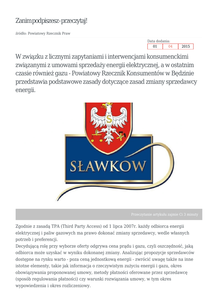 Zanimpodpiszesz-przeczytaj! źródło: Powiatowy Rzecznik Praw Data dodania: 01 04 2015 W związku z licznymi zapytaniami i interwencjami konsumenckimi związanymi z umowami sprzedaży energii elektrycznej, a w ostatnim czasie również gazu - Powiatowy Rzecznik Konsumentów w Będzinie przedstawia podstawowe zasady dotyczące zasad zmiany sprzedawcy energii. Przeczytanie artykułu zajmie Ci 3 minuty Zgodnie z zasadą TPA (Third Party Access) od 1 lipca 2007r. każdy odbiorca energii elektrycznej i paliw gazowych ma prawo dokonać zmiany sprzedawcy, wedle własnych potrzeb i preferencji. Decydującą rolę przy wyborze oferty odgrywa cena prądu i gazu, czyli oszczędność, jaką odbiorca może uzyskać w wyniku dokonanej zmiany. Analizując propozycje sprzedawców dostępne na rynku warto - poza ceną jednostkową energii - zwrócić uwagę także na inne istotne elementy, takie jak informacja o rzeczywistym zużyciu energii i gazu, okres obowiązywania proponowanej umowy, metody płatności oferowane przez sprzedawcę (sposób regulowania płatności) czy warunki rozwiązania umowy, w tym okres wypowiedzenia i okres rozliczeniowy. Pamiętajmy, że przed podpisaniem umowy należy w szczególności: sprawdzić nazwę firmy, z którą zawieramy umowę (nazwa powinna się znaleźć w dokumentach, które podpisujemy) dokładnie zbadać zapisy umowy w ofercie nowego sprzedawcy - przede wszystkim ceny i warunki ich stosowania; sprawdzić dostępne opcje płatności (np. co miesiąc, rozlicznie prognozowane raz na pół roku czy raz na rok); ustalić okres obowiązywania umowy i warunki wypowiedzenia (np. czy umowa jest przedłużana automatycznie, jakie są kary umowne za wcześniejsze rozwiązanie umowy); sprawdzić, czy umowa nie wiąże się z koniecznością skorzystania z dodatkowych usług (np. usługa ubezpieczeniowa, usługa zdrowotna). Pamiętajmy, że po podpisaniu umowy musimy otrzymać egzemplarz podpisanych dokumentów stwierdzających datę i rodzaj oraz przedmiot świadczenia i cenę oraz nazwę przedsiębiorcy. Proces zmiany sprzedawcy energii elektrycznej i paliw gazowych bardzo często odbywa się w drodze umów zawieranych poza lokalem przedsiębiorcy, np. w domach odbiorców, za pośrednictwem akwizytora reprezentującego przedsiębiorstwo lub na odległość np. oferta przez telefon. W tych przypadkach konsument może od umowy odstąpić bez podania przyczyny, składając na piśmie, w terminie 14 dni od zawarcia umowy, stosowne oświadczenie przedsiębiorstwu energetycznemu, z którym zawarta została dana umowa. Oświadczenie to może być złożone osobiście w siedzibie przedsiębiorstwa lub listownie, najlepiej ze zwrotnym potwierdzeniem odbioru, przed upływem tego terminu. Przedsiębiorstwo energetyczne przed zawarciem umowy poza swoim lokalem powinno poinformować konsumenta na piśmie o prawie odstąpienia od umowy w terminie 14 dni i wręczyć wzór oświadczenia o odstąpieniu z oznaczeniem nazwy oraz adresem siedziby tego przedsiębiorstwa. Przedsiębiorstwo obowiązane jest także wręczyć odbiorcy pisemne potwierdzenie zawarcia umowy, stwierdzające jej datę i rodzaj oraz przedmiot świadczenia i cenę. Niestety niektórzy nieuczciwi akwizytorzy wykorzystują nasze przyzwyczajenia, a czasem także niewiedzę. W związku z takimi praktykami przede wszystkim należy pamiętać o konieczności stosowania zasady ograniczonego zaufania w odniesieniu do każdej osoby, która chce wejść do naszego mieszkania. To, że osoba taka będzie dla nas uprzejma, nie oznacza jeszcze, że ma dobre zamiary. Należy pamiętać, że informacja o treści „reprezentuję elektrownię, gazownię czy zakład energetyczny” to stanowczo za mało. Zawsze należy pytać o nazwę spółki, jaką osoba, która odwiedziła nas w domu, reprezentuje. Ta nazwa powinna się również znaleźć w dokumentach, które chce przedstawić nam do podpisu.Niestety często nieuczciwi przedstawiciele handlowi podszywają się pod techników, twierdząc, że mają rutynowe dokumenty do podpisania. To może być próba oszustwa. Nigdy nie należy podpisywać dokumentu, którego się nie czytało. Jeżeli już zawarliśmy taką umowę, należy pamiętać, że mamy 14 dni, żeby się wycofać bez podania przyczyny. Po tym terminie odstąpienie od umowy może się wiązać z obciążeniami finansowymi po naszej stronie. Zawsze, gdy mamy wątpliwości co do legalności, prawidłowości działań podejmowanych przez akwizytorów możemy zwrócić się do rzecznika konsumentów zgodnie z miejscem swojego zamieszkania. Dla mieszkańców Powiatu Będzińskiego właściwy jest Powiatowy Rzecznik Konsumentów w Będzinie – Starostwo Powiatowe ul. Krasickiego 17, pokój nr 130 tel. 32 368 08 03, e-mail [email protected] D R U KUJ D RUKUJ DO PDF http://www.slawkow.pl/print.php?pdf=true&unique=zanim-podpiszesz-przeczytaj&lang=pl