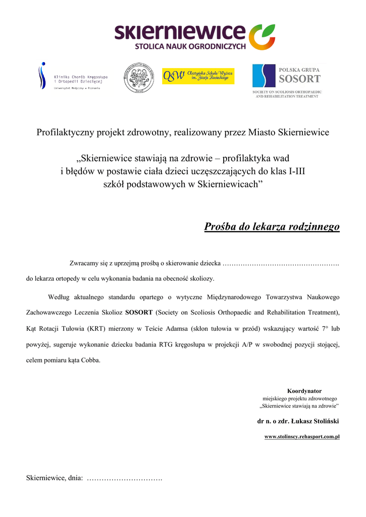 Profilaktyczny projekt zdrowotny, realizowany przez Miasto Skierniewice „Skierniewice stawiają na zdrowie – profilaktyka wad i błędów w postawie ciała dzieci uczęszczających do klas I-III szkół podstawowych w Skierniewicach” Prośba do lekarza rodzinnego Zwracamy się z uprzejmą prośbą o skierowanie dziecka ……………………………………………. do lekarza ortopedy w celu wykonania badania na obecność skoliozy. Według aktualnego standardu opartego o wytyczne Międzynarodowego Towarzystwa Naukowego Zachowawczego Leczenia Skolioz SOSORT (Society on Scoliosis Orthopaedic and Rehabilitation Treatment), Kąt Rotacji Tułowia (KRT) mierzony w Teście Adamsa (skłon tułowia w przód) wskazujący wartość 7 lub powyżej, sugeruje wykonanie dziecku badania RTG kręgosłupa w projekcji A/P w swobodnej pozycji stojącej, celem pomiaru kąta Cobba. Koordynator miejskiego projektu zdrowotnego „Skierniewice stawiają na zdrowie” dr n. o zdr. Łukasz Stoliński www.stolinscy.rehasport.com.pl Skierniewice, dnia: ………………………….