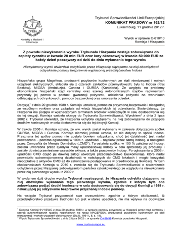 Trybunał Sprawiedliwości Unii Europejskiej KOMUNIKAT PRASOWY nr 162/12 Luksemburg, 11 grudnia 2012 r. Wyrok w sprawie C-610/10 Komisja / Hiszpania Kontakty z Mediami i Informacja Z powodu niewykonania wyroku Trybunału Hiszpania zostaje zobowiązana do zapłaty ryczałtu w kwocie 20 mln EUR oraz kary okresowej w kwocie 50 000 EUR za każdy dzień począwszy od dziś do dnia wykonania tego wyroku Niewykonany wyrok stwierdzał uchybienie przez Hiszpanię ciążącemu na niej obowiązkowi odzyskania pomocy bezprawnie wypłaconej przedsiębiorstwu Indosa Hiszpańska grupa Magefesa, producent przyborów kuchennych ze stali nierdzewnej i małych urządzeń elektrycznych, składała się z czterech zakładów przemysłowych; były to Indosa (Kraj Basków), MIGSA (Andaluzja), Cunosa i GURSA (Kantabria). Ze względu na problemy ekonomiczne hiszpański rząd centralny oraz szereg autonomicznych rządów regionalnych przyznały jej pomoc w postaci: gwarancji pożyczek, udzielenia pożyczki na warunkach odbiegających od rynkowych, pomocy bezzwrotnej oraz umorzenia odsetek. Decyzją 1 z dnia 20 grudnia 1989 r. Komisja uznała tą pomoc za przyznaną bezprawnie i niezgodną ze wspólnym rynkiem oraz zażądała od władz hiszpańskich jej odzyskania. Stwierdziwszy, że Hiszpania nie podjęła w wyznaczonych terminach środków koniecznych w celu dostosowania się do tej decyzji, Komisja wniosła skargę do Trybunału Sprawiedliwości. Wyrokiem 2 z dnia 2 lipca 2002 r. Trybunał stwierdził, że Hiszpania uchybiła ciążącemu na niej zobowiązaniu do przyjęcia środków koniecznych w celu dostosowania się do tej decyzji Komisji. W trakcie 2006 r. Komisja uznała, że ww. wyrok został wykonany w zakresie dotyczącym spółek GURSA, MIGSA i Cunosa. Komisja niemniej jednak uznała, że nie dotyczy to spółki Indosa. Przyznana tej spółce pomoc nie została bowiem odzyskana, choć jej działalność jest nadal prowadzona – pomimo ogłoszonej w 1994 r. upadłości – najpierw przez samą Indosę, a następnie przez Compañía de Menaje Doméstico („CMD”). Ta ostatnia spółka, w 100 % zależna od Indosy, została utworzona przez syndyka masy upadłościowej Indosy w celu sprzedaży jej produkcji i zostały do niej przeniesione wszystkie aktywa, a także pracownicy Indosy. Po ogłoszeniu w 2008 r. upadłości CMD część jej dawnej załogi utworzyła przedsiębiorstwo Euskomenaje, które nadal prowadziło subwencjonowaną działalność w należących do CMD lokalach i mogło korzystać nieodpłatnie z aktywów CMD aż do zakończenia postępowania w przedmiocie jej likwidacji. W tych okolicznościach Komisja w 2010 r. zwróciła się do Trybunału Sprawiedliwości o stwierdzenie uchybienia przez Hiszpanię zobowiązaniom państwa członkowskiego ze względu na niewykonanie przez nią pierwszego wyroku z 2002 r. W wydanym dziś drugim wyroku Trybunał rozstrzygnął, że Hiszpania uchybiła ciążącemu na niej obowiązku wykonania tego pierwszego wyroku, zgodnie z którym była ona zobowiązana podjąć środki konieczne w celu dostosowania się do decyzji Komisji z 1989 r. nakazującej jej odzyskanie bezprawnie przyznanej Indosie pomocy. Na wstępie Trybunał przypomniał swe orzecznictwo, zgodnie z którym okoliczność, iż przedsiębiorstwo przeżywa trudności lub jest w stanie upadłości, nie ma wpływu na obowiązek 1 Decyzja Komisji 91/1/EWG z dnia 20 grudnia 1989 r. w sprawie pomocy przyznanej w Hiszpanii przez rząd centralny i szereg autonomicznych rządów regionalnych na rzecz MAGEFESA, producenta przyborów kuchennych ze stali nierdzewnej i małych urządzeń elektrycznych (Dz.U. 1991 L 5, s. 18). 2 Wyrok Trybunału Sprawiedliwości z dnia 2 lipca 2002 r. w sprawie C-499/99 Komisja przeciwko Hiszpanii. www.curia.europa.eu odzyskania bezprawnie wypłaconej pomocy. Zakłócenie konkurencji wynikłe z tej pomocy można co do zasady wyeliminować poprzez wpisanie w ramach postępowania upadłościowego wierzytelności z tytułu zwrotu danej pomocy na listę wierzytelności. W przypadku zaś CMD – od której należało było odzyskać pomoc – przed upływem terminu wyznaczonego przez Komisję (czyli dniem 22 maja 2010 r.) taka wierzytelność nie została wpisana na sporządzoną w ramach postępowania upadłościowego listę wierzytelności. Dopiero po tym terminie, między grudniem 2010 r. a grudniem 2011 r. Wspólnota Autonomiczna Kraju Basków przedstawiła szereg wniosków o wpisanie wierzytelności na jej rzecz – której kwota była następnie sukcesywnie zwiększana – po stronie pasywów CMD 3 . Trybunał następnie podkreślił, że w niniejszym przypadku taki wpis sam w sobie nie jest wystarczający do tego, aby obowiązek wykonania wyroku z 2002 r. można było uznać za spełniony. Wpis taki umożliwia wywiązanie się z tego obowiązku jedynie wówczas jeśli, w przypadku, gdy władze krajowe nie mogły odzyskać całej kwoty bezprawnej pomocy, postępowanie upadłościowe zakończyło się ostatecznym zaprzestaniem działalności prowadzonej przez przedsiębiorstwo będące beneficjentem tej pomocy. Odzyskanie pomocy uznanej za niezgodną ze wspólnym rynkiem ma na celu wyeliminowanie zakłócenia konkurencji spowodowanego przez przewagę konkurencyjną, z której beneficjent tej pomocy skorzystał – w stosunku do swoich konkurentów – w ramach rynku, i przywrócenie sytuacji sprzed wypłacenia rzeczonej pomocy. Dalsze prowadzenie działalności spółki znajdującej się w stanie upadłości przez inne przedsiębiorstwa, jeśli tylko bezprawnie przyznana pomoc nie została odzyskana, może zaś nadal powodować wynikające z tej pomocy zakłócenie konkurencji. Ma to miejsce w szczególności w przypadku, gdy taka spółka dokonuje nabycia aktywów likwidowanego przedsiębiorstwa nie płacąc w zamian ceny rynkowej lub też, gdy utworzenie takiej spółki skutkuje obejściem obowiązku zwrotu tej pomocy. W tym względzie Trybunał stoi na stanowisku, że