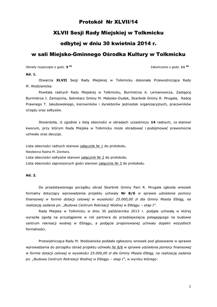 Protokół Nr XLVII/14 XLVII Sesji Rady Miejskiej w Tolkmicku odbytej w dniu 30 kwietnia 2014 r. w sali Miejsko-Gminnego Ośrodka Kultury w Tolkmicku Obrady rozpoczęto o godz. 9 05 Zakończono o godz. 11 00 Ad. 1. Otwarcia XLVII Sesji Rady Miejskiej w Tolkmicku dokonała Przewodnicząca Rady M. Wodzianicka. Powitała radnych Rady Miejskiej w Tolkmicku, Burmistrza A. Lemanowicza, Zastępcę Burmistrza J. Zamojcina, Sekretarz Gminy M. Małysko-Dudek, Skarbnik Gminy R. Mrugała, Radcę Prawnego T. Jakubowskiego, kierowników i dyrektorów jednostek organizacyjnych, pracowników Urzędu oraz sołtysów. Stwierdziła, iż zgodnie z listą obecności w obradach uczestniczy 14 radnych, co stanowi kworum, przy którym Rada Miejska w Tolkmicku może obradować i podejmować prawomocne uchwały oraz decyzje. Lista obecności radnych stanowi załącznik Nr 1 do protokołu. Nieobecna Radna M. Zientara. Lista obecności sołtysów stanowi załącznik Nr 2 do protokołu. Lista obecności zaproszonych gości stanowi załącznik Nr 3 do protokołu. Ad. 2. Do przedstawionego porządku obrad Skarbnik Gminy Pani R. Mrugała zgłosiła wniosek formalny dotyczący wprowadzenia projektu uchwały Nr 8/6 w sprawie udzielenia pomocy finansowej w formie dotacji celowej w wysokości 25.000,00 zł dla Gminy Miasta Elbląg, na realizację zadania pn. „Budowa Centrum Rekreacji Wodnej w Elblągu – etap I”. Rada Miejska w Tolkmicku w dniu 30 października 2013 r. podjęła uchwałę w której wyraziła zgodę na przystąpienie w roli partnera do przedsięwzięcia polegającego na budowie centrum rekreacji wodnej w Elblągu, a podjęcie proponowanej uchwały dopełni wszystkich formalności. Przewodnicząca Rady M. Wodzianicka poddała zgłoszony wniosek pod głosowanie w sprawie wprowadzenia do porządku obrad projektu uchwały Nr 8/6 w sprawie udzielenia pomocy finansowej w formie dotacji celowej w wysokości 25.000,00 zł dla Gminy Miasta Elbląg, na realizację zadania pn. „Budowa Centrum Rekreacji Wodnej w Elblągu – etap I”, w wyniku którego: 1 za – 14 głosów przeciw – 0 głosów wstrzymało się – 0 głosów Wniosek został przyjęty. Następnie Przewodnicząca Rady poddała porządek obrad pod głosowanie przy uwzględnieniu zgłoszonego wniosku, jak niżej: za – 14 głosów przeciw – 0 głosów wstrzymało się – 0 głosów 2. Przedstawienie porządku obrad. 3. Przyjęcie protokołu XLVI Sesji Rady Miejskiej z dnia 28.03.2014 r. 4. Informacja Burmistrza o bieżącej pracy. 5. Interpelacje i wnioski Radnych. 6. Zapytania i wolne wnioski. 7. Realizacja wydatków z budżetu gminy w rozdziale 75075 promocja jednostki samorządu terytorialnego - analiza wydatków i korzyści dla gminy w ciągu ostatnich 3 lat. 7a. Ocena zasobów pomocy społecznej za 2013 rok. 8. Podjęcie uchwał: 8/1 o zmianie Wieloletniej Prognozy Finansowej Gminy Tolkmicko, 8/2 w sprawie zmian w budżecie gminy na 2014 rok, 8/3 w sprawie wyrażenia zgody na wynajem pomieszczeń użytkowych, 8/4 w sprawie ustalenia wieloletniego programu gospodarowania mieszkaniowym zasobem gminy na lata 2014-2018, 8/5 o zmianie uchwały w sprawie wyrażenia zgody na utworzenie spółki „Pętla Żuławska” Spółka z Ograniczoną Odpowiedzialnością. 8/6 w sprawie udzielenia pomocy finansowej w formie dotacji celowej w wysokości 25.000,00 zł dla Gminy Miasta Elbląg, na realizację zadania pn. „Budowa Centrum Rekreacji Wodnej w Elblągu – etap I”. 9. Odpowiedzi na interpelacje i wnioski. 10. Sprawy różne. 11. Zakończenie obrad. Ad. 3. Do protokołu XLVI Sesji Rady Miejskiej z dnia 28.03.2014 r., radni nie wnieśli uwag. W wyniku przeprowadzonego głosowania protokół XLVI Sesji Rady Miejskiej w Tolkmicku został przyjęty następująco: za - 14 głosów przeciw – 0 głosów wstrzymało się – 0 głosów 2 Ad. 4. Pan A. Lemanowicz przedstawił informację o pracy Burmistrza Tolkmicka w okresie międzysesyjnym od 28 marca do 30 kwietnia 2014 roku, która stanowi załącznik Nr 4 do protokołu. Do przedstawionej informacji zgłoszono następujące zapytania: Radny P. Nowicki odniósł się do pkt 14 informacji. Zapytał o koszty jakie gmina poniosła w związku z udzieleniem pomocy weterynaryjnej porzuconemu w Rangórach psu, jego transportem, uśpieniem i poddaniem utylizacji. W ocenie radnego zachodzi pilna konieczność pochylenia się nad problemem psów w gminie Tolkmicko. Zachodzi potrzeba ewidencjonowania psów, co umożliwi szybką identyfikację i interwencję w sytuacjach awaryjnych. Jeśli porzucony pies był zaczipowany to na tej podstawie można ustalić jego właściciela, w obowiązku którego jest poniesienie kosztów finansowych za czynności wykonane przez lekarza weterynarii. Burmistrz Tolkmicka Pan A. Lemanowicz odniósł się do powyższego punktu. Wyjaśnił, że porzucony pies nie był zaczipowany i najprawdopodobniej pochodził z okolic Elbląga. W trakcie oględzin lekarz weterynarii stwierdził, że pies bardzo cierpi z powodu choroby. Zrobiliśmy wszystko, by pomóc czworonogowi niemniej jednak konieczne było jego uśpienie. Wysokość środków finansowych jakie gmina poniesie za odbiór, transport i utylizację psa będzie znana w momencie otrzymania faktury. Problem psów narasta z roku na rok i gmina musi zmierzyć się z tym problemem. Pan Burmistrz przyznał, że najwłaściwszym rozwiązaniem byłoby czipowanie t. j. wszczepienie elektronicznego elementu z zakodowaną informacją o zwierzęciu, która pozwoli ustalić jego tożsamość. Ad. 5. Interpelacje i wnioski: Radny M. Misztal: zgłosił zły stan techniczny Pomnika Męczeństwa zlokalizowanego w Nadbrzeżu, który wymaga naprawy, podziękował za udzieloną odpowiedź na interpelację w sprawie naprawy drogi powiatowej biegnącej od granic administracyjnych Elbląga w kierunku Tolkmicka. Jednakże zapytał o podanie konkretnego terminu rozpoczęcia prac na tej drodze, wskazał niebezpieczną „ścianę” zakrzaczeń, która