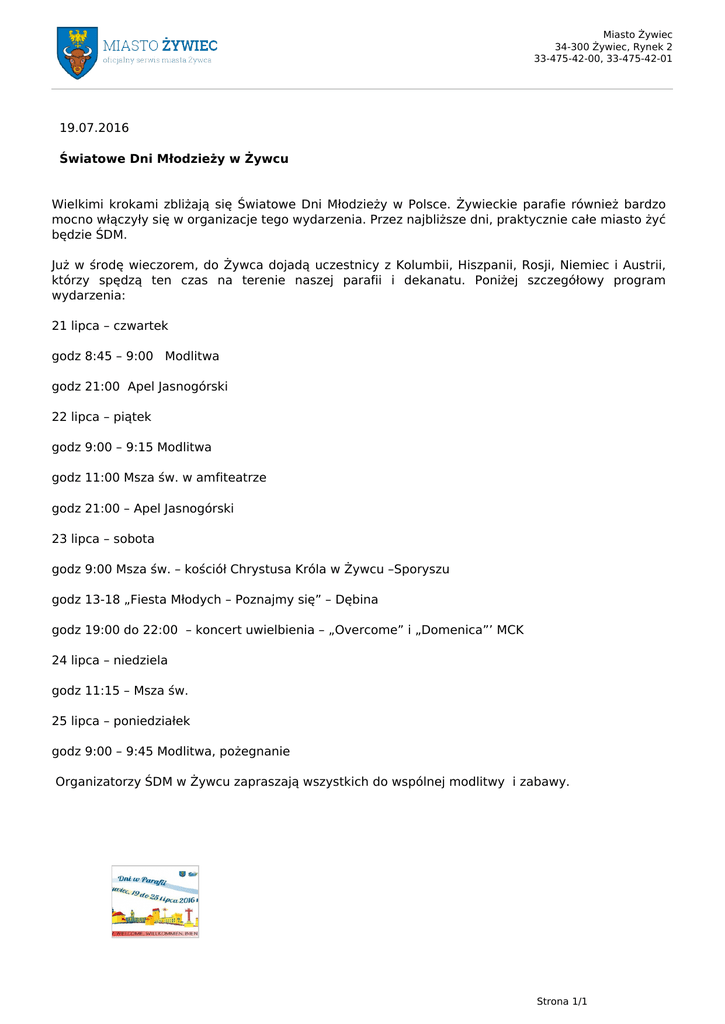 Miasto Żywiec 34-300 Żywiec, Rynek 2 33-475-42-00, 33-475-42-01 19.07.2016 Światowe Dni Młodzieży w Żywcu Wielkimi krokami zbliżają się Światowe Dni Młodzieży w Polsce. Żywieckie parafie również bardzo mocno włączyły się w organizacje tego wydarzenia. Przez najbliższe dni, praktycznie całe miasto żyć będzie ŚDM. Już w środę wieczorem, do Żywca dojadą uczestnicy z Kolumbii, Hiszpanii, Rosji, Niemiec i Austrii, którzy spędzą ten czas na terenie naszej parafii i dekanatu. Poniżej szczegółowy program wydarzenia: 21 lipca – czwartek godz 8:45 – 9:00 Modlitwa godz 21:00 Apel Jasnogórski 22 lipca – piątek godz 9:00 – 9:15 Modlitwa godz 11:00 Msza św. w amfiteatrze godz 21:00 – Apel Jasnogórski 23 lipca – sobota godz 9:00 Msza św. – kościół Chrystusa Króla w Żywcu –Sporyszu godz 13-18 „Fiesta Młodych – Poznajmy się” – Dębina godz 19:00 do 22:00 – koncert uwielbienia – „Overcome” i „Domenica”’ MCK 24 lipca – niedziela godz 11:15 – Msza św. 25 lipca – poniedziałek godz 9:00 – 9:45 Modlitwa, pożegnanie Organizatorzy ŚDM w Żywcu zapraszają wszystkich do wspólnej modlitwy i zabawy. Strona 1/1 Powered by TCPDF (www.tcpdf.org)