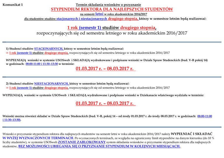 Komunikat 1 Termin składania wniosków o przyznanie STYPENDIUM REKTORA DLA NAJLEPSZYCH STUDENTÓW na semestr letni w roku akademickim 2016/2017 dla studentów studiów stacjonarnych i niestacjonarnych drugiego stopnia, którzy w semestrze letnim będą realizować: 1 rok (semestr 1) studiów drugiego stopnia, rozpoczynających się od semestru letniego w roku akademickim 2016/2017 1) Studenci studiów STACJONARNYCH, którzy w semestrze letnim będą realizować: • 1 rok (semestr 1) studiów drugiego stopnia, rozpoczynających się od semestru letniego w roku akademickim 2016/2017 WYPEŁNIAJĄ wnioski w systemie USOSweb i SKŁADAJĄ wydrukowane i podpisane wnioski w Dziale Spraw Studenckich (bud. V-B pokój 14) w godzinach: 08:00-11:00 i 11:30–13:30 w terminie: 01.03.2017 r. – 08.03.2017 r. 2) Studenci studiów NIESTACJONARNYCH, którzy w semestrze letnim będą realizować: • 1 rok (semestr 1) studiów drugiego stopnia, rozpoczynających się od semestru letniego w roku akademickim 2016/2017 WYPEŁNIAJĄ wnioski w systemie USOSweb i SKŁADAJĄ wydrukowane i podpisane wnioski w Dziekanacie właściwego wydziału w terminie: 01.03.2017 r. – 08.03.2017 r. Wnioski można również składać w Dziale Spraw Studenckich (bud. V-B, pokój 14 – od środy 01.03.2017 r. do środy 08.03.2017 r. w godzinach: 08:00-11:00 i 11:30–13:30). Wnioski o przyznanie stypendium rektora dla najlepszych studentów na semestr letni w roku akademickim 2016/2017 należy WYPEŁNIAĆ I SKŁADAĆ W WYŻEJ WYZNACZONYCH TERMINACH. Po wyznaczonych terminach, ze względu na ograniczony limit stypendiów na danym kierunku (do 10 % liczby studentów), w systemie USOSweb ZOSTANIE ZABLOKOWANY system składania wniosków o przyznanie stypendium rektora dla najlepszych studentów, BEZ MOŻLIWOŚCI UBIEGANIA SIĘ O PRZYZNANIE STYPENDIUM W KOLEJNYCH MIESIĄCACH. 1 STUDENT 1- GO ROKU (SEMESTR 1) STUDIÓW DRUGIEGO STOPNIA Student 1- go roku (semestr 1) studiów stacjonarnych i niestacjonarnych drugiego stopnia składa: 1) wydrukowany i podpisany wniosek o przyznanie na semestr letni w roku akademickim 2016/2017 stypendium rektora dla najlepszych studentów – pod nazwą „Wniosek o stypendium rektora dla najlepszych studentów - semestr letni 2016/17 ”, studentowi będącego absolwentem Politechniki Rzeszowskiej w semestrze zimowym w roku akademickim 2016/2017 na tym samym kierunku studiów, na którym podjął studia drugiego stopnia w PRz, średnia arytmetyczna ocen jest generowana automatycznie z systemu USOSweb. Student nie ma obowiązku składania oświadczenia o średniej arytmetycznej ocen (załącznik nr 14 do Regulaminu przyznawania świadczeń pomocy materialnej dla studentów Politechniki Rzeszowskiej z dnia 29 września 2015 r., z późn. zm.) i dokumentów dotyczących średniej ocen (suplementu do dyplomu) W przypadku braku lub wątpliwości co do średniej arytmetycznej, należy skontaktować się z Dziekanatem właściwego wydziału. student: - niebędący absolwentem Politechniki Rzeszowskiej, - będący absolwentem Politechniki Rzeszowskiej w roku akademickim 2015/2016 na tym samym kierunku studiów na którym podjął studia drugiego stopnia w PRz - będący absolwentem Politechniki Rzeszowskiej w roku akademickim 2015/2016, na innym kierunku niż kontynuuje studia drugiego stopnia lub na innym wydziale wypełnia oświadczenie o średniej arytmetycznej ocen (załącznik nr 14 do Regulaminu przyznawania świadczeń pomocy materialnej dla studentów Politechniki Rzeszowskiej z dnia 29 września 2015 r., z późn. zm.), dostępny w systemie USOSweb w trakcie wypełniania wniosku, jest zobowiązany dołączyć do oświadczenia zaświadczenie z ukończonej szkoły wyższej o obowiązującej skali ocen wraz z potwierdzoną za zgodność z oryginałem kopią suplementu do dyplomu lub indeksu. 2) w przypadku posiadania dodatkowych osiągnięć naukowych lub artystycznych lub wysokich wyników sportowych we współzawodnictwie międzynarodowym lub krajowym, należy dołączyć dokumenty potwierdzające wykazane we wniosku dodatkowe osiągnięcia, uzyskane w poprzednim roku studiów, tj. z okresu: 01.10.2016 r. – 20.02.2017 r., z ostatniego semestru, w przypadku, gdy ostatni rok studiów zgodnie z planem studiów trwał jeden semestr. Dodatkowe osiągnięcia należy wykazać w trakcie wypełniania wniosku w systemie USOSweb i dołączyć do wniosku dokumenty potwierdzające wykazane we wniosku dodatkowe osiągnięcia, uzyskane w poprzednim roku studiów. W trakcie wypełniania wniosku należy zaznaczyć z jakiego tytułu składany jest wniosek o przyznanie stypendium rektora dla najlepszych studentów (np. w przypadku uzyskania wysokiej średniej ocen, osiągnięć naukowych, artystycznych i wysokich wyników sportowych we współzawodnictwie międzynarodowym lub krajowym, należy zaznaczyć w systemie USOSweb, że wniosek składany jest z tytułu: wysokiej średniej ocen, osiągnięć naukowych, osiągnięć artystycznych, wysokich wyników sportowych we 2 współzawodnictwie międzynarodowym lub krajowym). W przypadku gdy we wniosku nie będzie wykazane osiągnięcie, a będzie potwierdzone dokumentem lub osiągnięcie zostanie wykazane we wniosku, ale nie będzie potwierdzone odpowiednim dokumentem, osiągnięcie to nie będzie punktowane. Niezłożenie wypełnionego w systemie USOSweb, wydrukowanego i podpisanego wniosku o przyznanie stypendium rektora dla najlepszych studentów w Dziale Spraw Studenckich (w budynku V-B, pok. 14 )/Dziekanacie właściwego Wydziału w wyżej wyznaczonych terminach spowoduje odrzucenie wniosku i pozostawienie bez rozpatrzenia, BEZ MOŻLIWOŚCI UBIEGANIA SIĘ O PRZYZNANIE STYPENDIUM REKTORA DLA NAJLEPSZYCH STUDENTÓW W KOLEJNYCH MIESIĄCACH. INFORMUJEMY, że w wyżej wymienionych terminach wypełniania i składania wniosków, istnieje możliwość cofnięcia przez koordynatora wypełnionego i złożonego przez studenta w systemie USOSweb wniosku o przyznanie stypendium