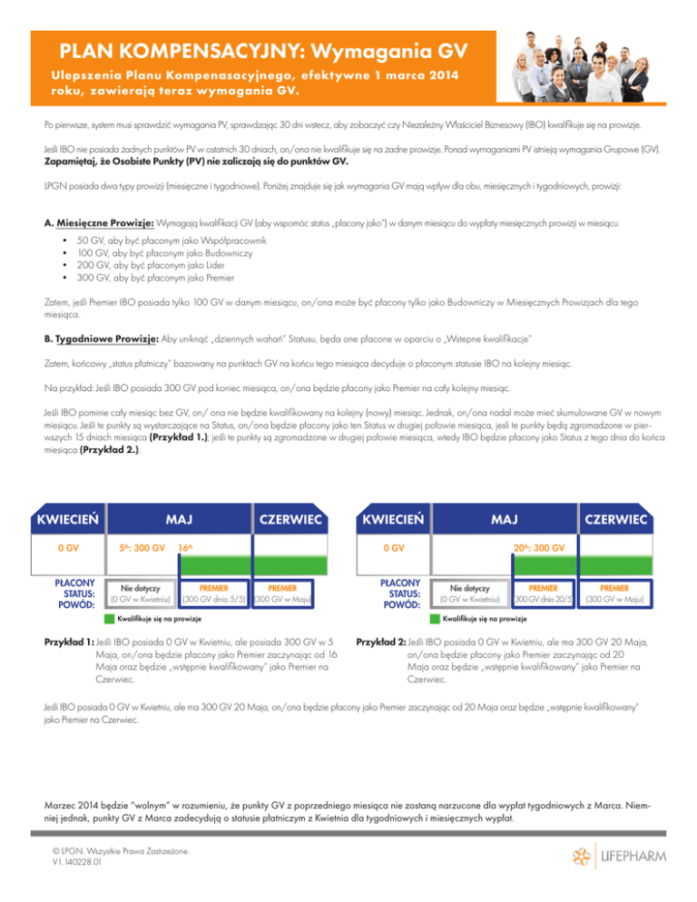 PLAN KOMPENSACYJNY: Wymagania GV Ulepszenia Planu Kompenasacyjnego, efektywne 1 marca 2014 roku, zawierają teraz wymagania GV. Po pierwsze, system musi sprawdzić wymagania PV, sprawdzając 30 dni wstecz, aby zobaczyć czy Niezależny Właściciel Biznesowy (IBO) kwalifikuje się na prowizje. Jeśli IBO nie posiada żadnych punktów PV w ostatnich 30 dniach, on/ona nie kwalifikuje się na żadne prowizje. Ponad wymaganiami PV istnieją wymagania Grupowe (GV). Zapamiętaj, że Osobiste Punkty (PV) nie zaliczają się do punktów GV. LPGN posiada dwa typy prowizji (miesięczne i tygodniowe). Poniżej znajduje się jak wymagania GV mają wpływ dla obu, miesięcznych i tygodniowych, prowizji: A. Miesięczne Prowizje: Wymagają kwalifikacji GV (aby wspomóc status „placony jako”) w danym miesiącu do wypłaty miesięcznych prowizji w miesiącu. • • • • 50 GV, aby być płaconym jako Współpracownik 100 GV, aby być płaconym jako Budowniczy 200 GV, aby być płaconym jako Lider 300 GV, aby być płaconym jako Premier Zatem, jeśli Premier IBO posiada tylko 100 GV w danym miesiącu, on/ona może być płacony tylko jako Budowniczy w Miesięcznych Prowizjach dla tego miesiąca. B. Tygodniowe Prowizje: Aby uniknąć „dziennych wahań” Statusu, będa one płacone w oparciu o „Wstepne kwalifikacje” Zatem, końcowy „status płatniczy” bazowany na punktach GV na końcu tego miesiąca decyduje o płaconym statusie IBO na kolejny miesiąc. Na przykład: Jeśli IBO posiada 300 GV pod koniec miesiąca, on/ona będzie płacony jako Premier na cały kolejny miesiąc. Jeśli IBO pominie cały miesiąc bez GV, on/ ona nie będzie kwalifikowany na kolejny (nowy) miesiąc. Jednak, on/ona nadal może mieć skumulowane GV w nowym miesiącu. Jeśli te punkty są wystarczające na Status, on/ona będzie płacony jako ten Status w drugiej połowie miesiąca, jesli te punkty będą zgromadzone w pierwszych 15 dniach miesiąca (Przykład 1.); jeśli te punkty są zgromadzone w drugiej połowie miesiąca, wtedy IBO będzie płacony jako Status z tego dnia do końca miesiąca (Przykład 2.). KWIECIEŃ 0 GV PŁACONY STATUS: POWÓD: MAJ 5th: 300 GV Nie dotyczy (0 GV w Kwietniu) CZERWIEC 16th PREMIER (300 GV dnia 5/5) KWIECIEŃ MAJ 0 GV PREMIER (300 GV w Maju) Kwalifikuje się na prowizje Przykład 1: Jeśli IBO posiada 0 GV w Kwietniu, ale posiada 300 GV w 5 Maja, on/ona będzie płacony jako Premier zaczynając od 16 Maja oraz będzie „wstępnie kwalifikowany” jako Premier na Czerwiec. PŁACONY STATUS: POWÓD: CZERWIEC 20th: 300 GV Nie dotyczy (0 GV w Kwietniu) PREMIER (300 GV dnia 20/5) PREMIER (300 GV w Maju) Kwalifikuje się na prowizje Przykład 2: Jeśli IBO posiada 0 GV w Kwietniu, ale ma 300 GV 20 Maja, on/ona będzie płacony jako Premier zaczynając od 20 Maja oraz będzie „wstępnie kwalifikowany” jako Premier na Czerwiec. Jeśli IBO posiada 0 GV w Kwietniu, ale ma 300 GV 20 Maja, on/ona będzie płacony jako Premier zaczynając od 20 Maja oraz będzie „wstępnie kwalifikowany” jako Premier na Czerwiec. Marzec 2014 będzie “wolnym” w rozumieniu, że punkty GV z poprzedniego miesiąca nie zostaną narzucone dla wypłat tygodniowych z Marca. Niemniej jednak, punkty GV z Marca zadecydują o statusie płatniczym z Kwietnia dla tygodniowych i miesięcznych wypłat. © LPGN. Wszystkie Prawa Zastrzeżone. V1.140228.01