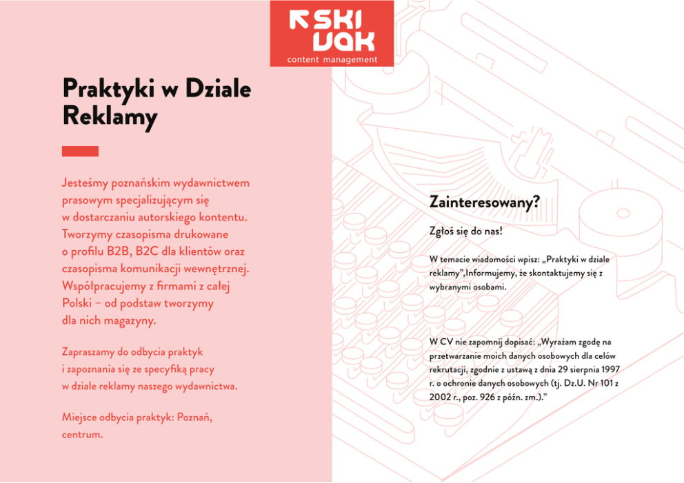 content management Praktyki w Dziale Reklamy Jesteśmy poznańskim wydawnictwem prasowym specjalizującym się w dostarczaniu autorskiego kontentu. Tworzymy czasopisma drukowane o profilu B2B, B2C dla klientów oraz czasopisma komunikacji wewnętrznej. Współpracujemy z firmami z całej Polski – od podstaw tworzymy dla nich magazyny. Zapraszamy do odbycia praktyk i zapoznania się ze specyfiką pracy w dziale reklamy naszego wydawnictwa. Miejsce odbycia praktyk: Poznań, centrum. Zainteresowany? Zgłoś się do nas! W temacie wiadomości wpisz: „Praktyki w dziale reklamy”,Informujemy, że skontaktujemy się z wybranymi osobami. W CV nie zapomnij dopisać: „Wyrażam zgodę na przetwarzanie moich danych osobowych dla celów rekrutacji, zgodnie z ustawą z dnia 29 sierpnia 1997 r. o ochronie danych osobowych (tj. Dz.U. Nr 101 z 2002 r., poz. 926 z późn. zm.).”