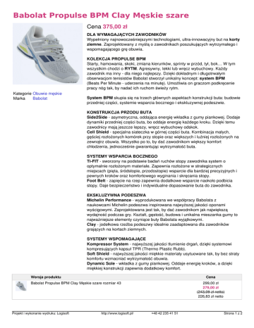 Babolat Propulse BPM Clay Męskie szare Cena 375,00 zł DLA WYMAGAJĄCYCH ZAWODNIKÓW Wypełniony najnowocześniejszymi technologiami, ultra-innowacyjny but na korty ziemne. Zaprojektowany z myślą o zawodnikach poszukujących wytrzymałego i wspomagającego grę obuwia. KOLEKCJA PROPULSE BPM Starty, hamowania, skoki, zmiana kierunków, sprinty w przód, tył, bok… W tym wszystkim chodzi o RYTM. Agresywny, lekki lub wręcz wybuchowy. Każdy zawodnik ma inny - dla niego najlepszy. Dzięki dokładnym i długotrwałym obserwacjom tenisistów Babolat stworzył unikalny koncept: system BPM (Beats Per Minute - uderzenia na minutę). Umożliwia on graczom podkręcenie pracy nóg tak, by nadać ich ruchom świeży rytm. Kategorie Obuwie męskie Marka Babolat System BPM skupia się na trzech głównych aspektach konstrukcji buta: budowie przedniej części, systemie wsparcia bocznego i ekskluzywnej podeszwie. KONSTRUKCJA PRZODU BUTA Side2Side - asymetryczna, oddająca energię wkładka z gumy piankowej. Dodaje dynamiki przedniej części buta, bo oddaje energię każdego kroku. Dzięki temu zawodnicy mają jeszcze lepszy, wręcz wybuchowy odskok. Cell Shield - specjalna siateczka w górnej części buta. Kombinacja małych, gęściej rozłożonych komórek przy stopie oraz większych i luźniej rozłożonych na zewnątrz obuwia. Wszystko po to, by dać zawodnikom większy komfort chłodzenia, jednocześnie gwarantując wytrzymałość buta. SYSTEMY WSPARCIA BOCZNEGO Ti-FIT - sworzony na podstawie badań ruchów stopy zawodnika system o optymalnie rozłożonym materiale. Zapewnia rozłożone w strategicznych miejscach (pięta, śródstopie, przodostopie) wsparcie dla bardziej precyzyjnych i pewnych kroków oraz komfortowego wyginania i skręcania stopy. Foot Belt - zapięcie na rzep zapewnia dodatkowe wsparcie naokoło podbicia stopy. Daje bezpieczeństwo i indywidualne dopasowanie buta do zawodnika. EKSKLUZYWNA PODESZWA Michelin Performance - wyprodukowana we współpracy Babolata z naukowcami Michelin podeszwa inspirowana najwyższej jakości oponami wyścigowymi. Zaprojektowana jest tak, by dać zawodnikom jak największą wydajność podczas gry. Kształt, gęstość, budowa i unikalna mieszanka gumy to najważniejsze elementy czyniące buty Babolata wyjątkowymi. Clay - jodełkowa rzeźba podeszwy idealnie zaadaptowana dla zawodników grających na kortach ziemnych. SYSTEMY WSPOMAGAJĄCE Kompressor System - najwyższej jakości tłumienie drgań, dzięki systemowi kompresujących kapsuł TPR (Thermo Plastic Rubb). Soft Shield - najwyższej jakości miękkie materiały usytuowane tak, by bez straty komfortu wzmacniać wytrzymałość obuwia. Dynamic Sole - wkładka z gumy piankowej. Oddaje energię kroków, a dzięki miękkiej konstrukcji zapewnia dodatkowy komfort. Wersja produktu Cena Babolat Propulse BPM Clay Męskie szare rozmiar 43 Projekt i wykonanie wydruku: Logisoft http://www.logisoft.pl/ 299,00 zł 279,00 zł (243,09 zł netto) 226,83 zł netto +48 42 235 41 51 Strona 1 z 2 W podobnej cenie Adidas Novak Pro rozm 42 395,00 zł Adidas dizero Ubersonic 2 rozm 44 379,00 zł Babolat Buty tenisowe SFX2 All Court czarno-niebieskie 370,00 zł Babolat Buty Tenisowe Propulse TEAM Clay białe 360,00 zł Babolat Buty tenisowe Propulse TEAM Clay czerwone 360,00 zł Babolat Buty tenisowe Propulse TEAM All Court niebieskie 360,00 zł Projekt i wykonanie wydruku: Logisoft Powered by TCPDF (www.tcpdf.org) http://www.logisoft.pl/ +48 42 235 41 51 Strona 2 z 2