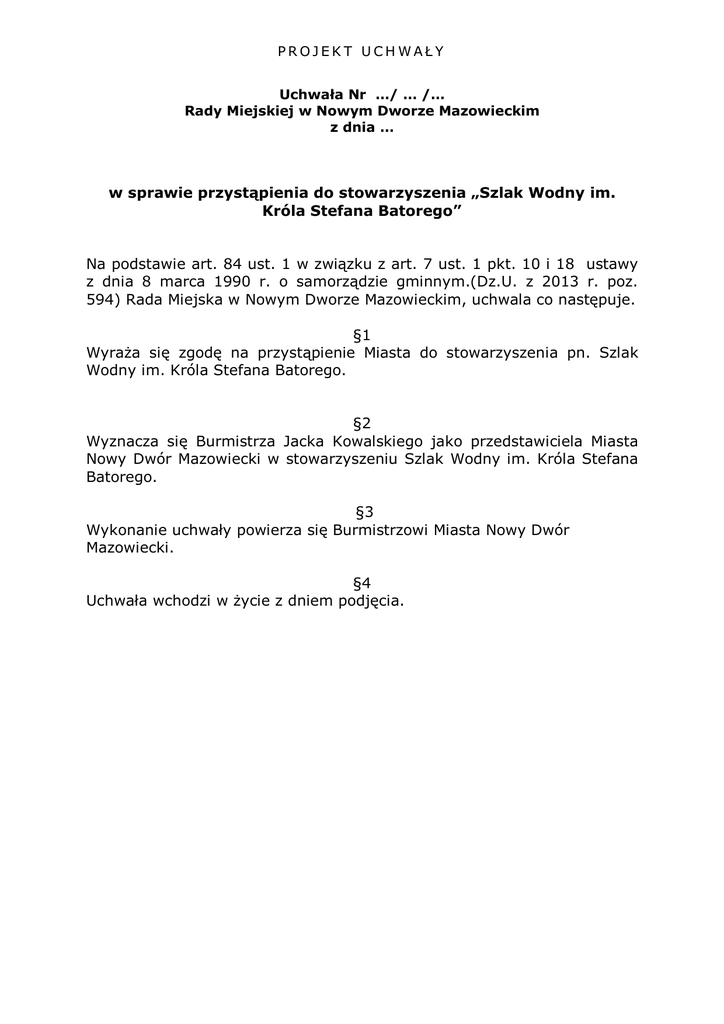 PROJEKT UCHWAŁY Uchwała Nr …/ … /… Rady Miejskiej w Nowym Dworze Mazowieckim z dnia … w sprawie przystąpienia do stowarzyszenia „Szlak Wodny im. Króla Stefana Batorego” Na podstawie art. 84 ust. 1 w związku z art. 7 ust. 1 pkt. 10 i 18 ustawy z dnia 8 marca 1990 r. o samorządzie gminnym.(Dz.U. z 2013 r. poz. 594) Rada Miejska w Nowym Dworze Mazowieckim, uchwala co następuje. §1 Wyraża się zgodę na przystąpienie Miasta do stowarzyszenia pn. Szlak Wodny im. Króla Stefana Batorego. §2 Wyznacza się Burmistrza Jacka Kowalskiego jako przedstawiciela Miasta Nowy Dwór Mazowiecki w stowarzyszeniu Szlak Wodny im. Króla Stefana Batorego. §3 Wykonanie uchwały powierza się Burmistrzowi Miasta Nowy Dwór Mazowiecki. §4 Uchwała wchodzi w życie z dniem podjęcia. PROJEKT UCHWAŁY Uzasadnienie do projektu Uchwały Nr …/ … /… Rady Miejskiej w Nowym Dworze Mazowieckim z dnia … Król Polski Stefan Batory dostrzegał prorozwojowe oddziaływanie rzek i szlaków wodnych na tereny do nich przyległe. Szczególną troską objął szlak wiodący od rzeki Niemen przez Kanał Augustowski, Biebrzę, Narew do Wisły i Wisłą, następnie Nogat i Zalew Wiślany do Morza Bałtyckiego. Nawiązując do idei i działań Batorego samorządy gmin, miast i regionów leżących na trasie tego szlaku w 2007 roku podjęły inicjatywę jego rewitalizacji. W 2012 roku postanowiono powołać stowarzyszenie „Szlak Wodny im. Króla Stefana Batorego”. Wśród licznych celów Stowarzyszenia jednym z podstawowych jest działanie na rzecz rozbudowy szlaku o drogi wodne spoza granic Polski. Uznając ogromny potencjał gospodarczy i wpływ szlaku na rozwój turystyki i transportu wodnego zasadnym jest przynależność Miasta Nowy Dwór Mazowiecki i aktywność jego przedstawicieli w jego pracach.