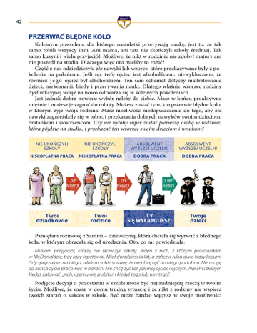 SZKOŁA 42 PRZERWAĆ BŁĘDNE KOŁO Kolejnym powodem, dla którego nastolatki przerywają naukę, jest to, że tak samo robili wszyscy inni. Ani mama, ani tata nie skończyli szkoły średniej. Tak samo kuzyni i wielu przyjaciół. Możliwe, że nikt w rodzinie nie zdobył matury ani nie poszedł na studia. Dlaczego więc oni mieliby to robić? Część z nas odziedziczyła złe nawyki lub wzorce, które przekazywane były z pokolenia na pokolenie. Jeśli np. twój ojciec jest alkoholikiem, niewykluczone, że również j e g o ojciec był alkoholikiem. Ten sam schemat dotyczy maltretowania dzieci, narkomanii, biedy i przerywania nauki. Dlatego właśnie wzorzec rodziny dysfunkcyjnej wciąż na nowo odtwarza się w kolejnych pokoleniach. Jest jednak dobra nowina: wybór należy do ciebie. Masz w końcu proaktywne mięśnie i możesz je zagnać do roboty. Możesz zostać tym, kto przerwie błędne koło, w którym żyje twoja rodzina. Masz możliwość niedopuszczenia do tego, aby złe nawyki zagnieździły się w tobie, i przekazania dobrych nawyków swoim dzieciom, bratankom i siostrzeńcom. Czy nie byłoby super zostać pierwszą osobą w rodzinie, która pójdzie na studia, i przekazać ten wzorzec swoim dzieciom i wnukom? NIE UKOŃCZYLI SZKOŁY NIE UKOŃCZYLI SZKOŁY ABSOLWENT WYŻSZEJ UCZELNI ABSOLWENT WYŻSZEJ UCZELNI NISKOPŁATNA PRACA NISKOPŁATNA PRACA DOBRA PRACA DOBRA PRACA ZŁY NAWYK Twoi dziadkowie ZŁY NAWYK Twoi rodzice DOBRY NAWYK TY SIĘ WYŁAMUJESZ! Twoje dzieci Pamiętam rozmowę z Sammi – dziewczyną, która chciała się wyrwać z błędnego koła, w którym obracała się od urodzenia. Oto, co mi powiedziała: Miałam przyjaciół, którzy nie skończyli szkoły. Jeden z nich, z którym pracowałam w McDonaldzie, trzy razy repetował. Miał dwadzieścia lat, a zaliczył tylko dwie klasy liceum. Gdy spojrzałam na niego, zdałam sobie sprawę, że nie chcę być do niego podobna. Nie mogę do końca życia pracować w barach. Nie chcę żyć tak jak mój ojciec i ojczym. Nie chciałabym kiedyś żałować: „Ach, czemu nie zrobiłam kiedyś tego lub tamtego”. Podjęcie decyzji o pozostaniu w szkole może być najtrudniejszą rzeczą w twoim życiu. Możliwe, że masz w domu trudną sytuację i że nikt z rodziny nie wspiera twoich starań o sukces w szkole. Być może bardzo wątpisz w swoje możliwości SZKOŁA i boisz się, że nie umiesz niczego doprowadzić do końca. Niewykluczone, że cierpnie ci skóra na myśl o choćby jednym, kolejnym dniu w szkole. Obiecuję ci jednak, że jeśli wytrwasz, będziesz sobie za to dziękować do końca swoich dni. Nie będzie to łatwe, ale warto. Dwa cukierki jutro są zawsze lepsze od jednego dzisiaj. Przetrwaj i rozkwitnij Przetrwaj i rozkwitnij Przedstawię ci teraz listę kilku wyrazów. Twoim zadaniem jest wpisać obok każdego z nich słowo, które ci się z tamtym kojarzy. Nie zastanawiaj się zbytnio – po prostu zapisz lub zapamiętaj to, co ci przyszło do głowy. Nauczyciele: ________________________________________________________________ Gramatyka: _____________________________________________________ Prace domowe: __________________________________________________ Lista ocen: ______________________________________________________ Klasówki: _______________________________________________________ Kucharka: _______________________________________________________ Przerobiłem to ćwiczenie z grupą nastolatków i otrzymałem odpowiedzi podobne to tych: Nauczyciele: KLAWISZE Gramatyka: KOSZMAR Prace domowe: ŚMIERĆ KLINICZNA Lista ocen: DZIEŃ SĄDU Klasówki: KUCIE Kucharka: CELLULITIS A jakie są twoje skojarzenia? Gdy myślisz o szkole lub nauce, czy odczuwasz pozytywne wibracje czy zbiera ci się na wymioty? Każdy przeżywa to inaczej, ale jest jedna rzecz wspólna wszystkim nastolatkom: dla wszystkich szkoła jest areną takich lub innych zmagań. Gdy ja chodziłem do szkoły, nie znosiłem stresu, sprawdzianów i wspinania się po linie. W szkole jest wiele rzeczy, którym trzeba sprostać. Oto cztery problemy, o których słyszałem najczęściej: 1. „Jestem zestresowana”. 2. „Mam zbyt wiele do zrobienia, a za mało czasu”. 3. „Zwyczajnie mam to gdzieś”. 4. „Nauka po prostu mi nie idzie”. Mam dobre wieści: tym problemom naprawdę można zaradzić. Przyjrzyjmy się każdemu z nich po kolei. 43 SZKOŁA 44 Wyzwanie 1: „JESTEM ZESTRESOWANA” „Co cię najbardziej stresuje w szkole?” – takie pytanie zadałem kilku nastolatkom. Oto, czego się dowiedziałem: ,,Presja, którą się na mnie wywiera, i ,konsekwencje moich "ST , OPNIE niepowodzeń . ". nia„Wszystkie ważne rzeczy stłoczone są w jednym a w i k W poniedziałek mam cztery klasówki. „Ocze ców ”. terminie. Nauczyciele powinni to jakoś zgrać”. i rod z „Matematyk,, a mnie dobija”. zacja i l a w y ,,R . nauczyciele ze s ny i n w t o ę t r o D „ woimi mon i”. m a łos g i m „Wydaje mi się, że wszystkie sprawy – od piłki nożnej i koszykówki po odrabianie lekcji – nakładają się na siebie i piętrzą. Nie ma ucieczki przed nie kończącą się pracą. Wystarczy mała przerwa, żeby wypaść z obiegu na wiele dni. Nie odrobisz matematyki jednego dnia, a następnego ęp g masz do zrobienia dwa razy więcej”. Zabawne, że kiedy przestaniesz chodzić do szkoły, stres nie zniknie jak za dotknięciem różdżki, lecz pojawi się w innym miejscu. Jego przyczyną nie bę- JA MIAŁABYM BYĆ dzie już szkoła, ale rachunki do zapłacenia, dzieci, ZESTRESOWANA? praca i teściowie. Nie próbuj więc uciekać od streSKĄD TEN su. Naucz się radzić sobie z nim. Jak? Ostrząc piłę, POMYSŁ, MAMO? i to regularnie. Pamiętaj o ostrzeniu piły NASYPAŁAŚ SOBIE KOCIEGO ŻWIRKU DO TALERZA, KOCHANIE. ŻWIREK DLA KOTÓW „W razie niebezpieczeństwa z sufitu zsuną się maski tlenowe. Proszę nałożyć maskę najpierw sobie, a potem osobie lub dziecku na sąsiednim fotelu” – pouczają stewardesy pasażer