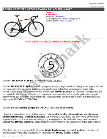 Informacje o produkcie Utworzono 07-03-2017 ROWER NORTHTEC HATHOR TIAGRA 28" KOLEKCJA 2017 Cena : 3.599,00 zł er m ar k Producent : Northtec Stan magazynowy : brak w magazynie Średnia ocena : brak recenzji DOSTĘPNY NA PRZEŁOMIE KWIETNIA/MAJA ! at -Rower HATHOR TIAGRA o rozmiarze kół 28 cali. w -Model HATHOR TIAGRA został zaprojektowany specjalnie dla kolarzy szosowych. Rower ten polecany jest zarówno pasjonatom-amatorom kolarstwa szosowego, także jako rower treningowy dla zawodowców. Model HATHOR TIAGRA to idealne rozwiązanie dla wszystkich, którzy cenią sobie wytrzymałość, niezawodność i wygodę podczas zmagań sportowych jak i rajdów rekreacyjnych. Wyposażenie roweru oparte jest na dobrej klasy osprzęcie SHIMANO TIAGRA. -Rower posiada pełną grupę SHIMANO TIAGRA 2x10 speed. - Rower wyposażono w wysokiej jakości, niezwykle lekką ,aluminiową, cieniowaną, hydroformowaną i aerodynamiczną ramę charakteryzującą się sportową geometrią, odpowiednią sztywnością oraz estetycznym wyglądem. W budowie ramy zastosowano stożkową główkę tapered, która poprawia sztywność oraz stabilność całej konstrukcji. -Wielkim atutem tego modelu stanowi lekki karbonowy, przedni widelec, skutecznie pochłaniający drgania, dostępny w rozmiarach: 49cm, 52cm, 54cm Wygenerowano w programie www.oscGold.com -wytrzymałe koła zbudowane na piastach Shimano, szprychach Sapim, wzmacnianych obręczach nitowanych, gwarantują dużą wytrzymałość bezpieczną jazdę. Natomiast twarde i gładkie opony Shwalbe Lugano umożliwiają rozwinięcie dużej prędkości oraz zagwarantują odpowiednią przyczepność podczas jazdy po szosie. specyfikacja osprzętu: 20 er m ar k Gwarantujemy szybką wysyłkę i pełną satysfakcję z naszych produktów! Alu 60611Hydroformowana, Tapered 1/8" 52/57, 54/58 cm- 1 1/2", 49/54, Carbon Shimano TIAGRA RD4700GS Shimano TIAGRA FD4700F Shimano TIAGRA ST4700 Shimano 50x34T TIAGRA FC4700CB04 at Shimano (11-34) TIAGRA CSHG500 Shimano TIAGRA CN4601 Shimano TIAGRA BR4700A w Shimano TIAGRA HBRS400 32H QR Trilogy Road 622x13 Sapim RACE Schwalbe Lugano 622x25 San Marco Northtec 31,8 szosowa lub prosta Northtec 100/110/120mm Northtec 27,2 350mm 9,6 kg Informacje o produkcie Dostępne opcje ROWER NORTHTEC HATHOR TIAGRA 28" KOLEKCJA 2017 w at er m ar k » Rama: 52 cm, 49 cm, 54 cm. » Kolor Ramy: czarno pomarańczowa, czarno-niebieski. Wygenerowano w programie www.oscGold.com