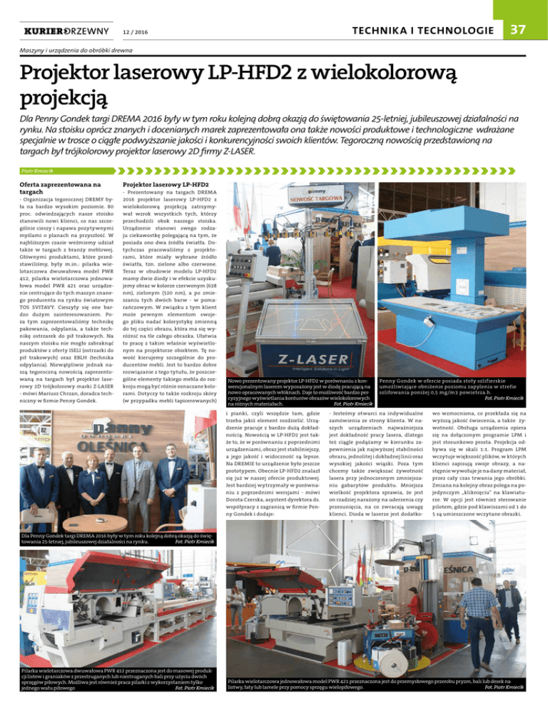 TECHNIKA I TECHNOLOGIE 12 / 2016 37 Maszyny i urządzenia do obróbki drewna Projektor laserowy LP-HFD2 z wielokolorową projekcją Dla Penny Gondek targi DREMA 2016 były w tym roku kolejną dobrą okazją do świętowania 25-letniej, jubileuszowej działalności na rynku. Na stoisku oprócz znanych i docenianych marek zaprezentowała ona także nowości produktowe i technologiczne wdrażane specjalnie w trosce o ciągłe podwyższanie jakości i konkurencyjności swoich klientów. Tegoroczną nowością przedstawioną na targach był trójkolorowy projektor laserowy 2D firmy Z-LASER. Piotr Kmiecik Oferta zaprezentowana na targach - Organizacja tegorocznej DREMY była na bardzo wysokim poziomie. 80 proc. odwiedzających nasze stoisko stanowili nowi klienci, co nas szczególnie cieszy i napawa pozytywnymi myślami o planach na przyszłość. W najbliższym czasie weźmiemy udział także w targach z branży meblowej. Głównymi produktami, które przedstawiliśmy, były m.in.: pilarka wielotarczowa dwuwałowa model PWR 412, pilarka wielotarczowa jednowałowa model PWR 421 oraz urządzenie centrujące do tych maszyn znanego producenta na rynku światowym TOS SVITAVY. Cieszyły się one bardzo dużym zainteresowaniem. Poza tym zaprezentowaliśmy technikę pakowania, odpylania, a także technikę ostrzarek do pił trakowych. Na naszym stoisku nie mogło zabraknąć produktów z oferty ISELI (ostrzarki do pił trakowych) oraz EBLH (technika odpylania). Niewątpliwie jednak naszą tegoroczną nowością zaprezentowaną na targach był projektor laserowy 2D trójkolorowy marki Z-LASER - mówi Mariusz Chrzan, doradca techniczny w firmie Penny Gondek. Projektor laserowy LP-HFD2 - Prezentowany na targach DREMA 2016 projektor laserowy LP-HFD2 z wielokolorową projekcją zatrzymywał wzrok wszystkich tych, którzy przechodzili obok naszego stoiska. Urządzenie stanowi swego rodzaju ciekawostkę polegającą na tym, że posiada ono dwa źródła światła. Dotychczas pracowaliśmy z projektorami, które miały wybrane źródło światła, tzn. zielone albo czerwone. Teraz w obudowie modelu LP-HFD2 mamy dwie diody i w efekcie uzyskujemy obraz w kolorze czerwonym (638 nm), zielonym (520 nm), a po zmieszaniu tych dwóch barw - w pomarańczowym. W związku z tym klient może pewnym elementom swojego pliku nadać kolorystykę zmienną do tej części obrazu, która ma się wyróżnić na tle całego obrazka. Ułatwia to pracę z takim właśnie wyświetlonym na projektorze obiektem. Tę nowość kierujemy szczególnie do producentów mebli. Jest to bardzo dobre rozwiązanie z tego tytułu, że poszczególne elementy takiego mebla do rozkroju mogą być różnie oznaczane kolorami. Dotyczy to także rozkroju skóry (w przypadku mebli tapicerowanych) Nowo prezentowany projektor LP-HFD2 w porównaniu z konwencjonalnym laserem wyposażony jest w diodę pracującą na nowo opracowanych włóknach. Daje to możliwość bardzo percyzyjnego wyświetlania konturów obrazów wielokolorowych na różnych materiałach. Fot. Piotr Kmiecik i pianki, czyli wszędzie tam, gdzie trzeba jakiś element rozdzielić. Urządzenie pracuje z bardzo dużą dokładnością. Nowością w LP-HFD2 jest także to, że w porównaniu z poprzednimi urządzeniami, obraz jest stabilniejszy, a jego jakość i widoczność są lepsze. Na DREMIE to urządzenie było jeszcze prototypem. Obecnie LP-HFD2 znalazł się już w naszej ofercie produktowej. Jest bardziej wytrzymały w porównaniu z poprzednimi wersjami - mówi Dorota Czerska, asystent dyrektora ds. współpracy z zagranicą w firmie Penny Gondek i dodaje: Penny Gondek w ofercie posiada stoły szlifierskie umożliwiające obniżenie poziomu zapylenia w strefie szlifowania poniżej 0,5 mg/m3 powietrza.h. Fot. Piotr Kmiecik - Jesteśmy otwarci na indywidualne zamówienia ze strony klienta. W naszych urządzeniach najważniejsza jest dokładność pracy lasera, dlatego też ciągle podążamy w kierunku zapewnienia jak najwyższej stabilności obrazu, jednolitej i dokładnej linii oraz wysokiej jakości wiązki. Poza tym chcemy także zwiększać żywotność lasera przy jednoczesnym zmniejszaniu gabarytów produktu. Mniejsza wielkość projektora sprawia, że jest on rzadziej narażony na uderzenia czy przesunięcia, na co zwracają uwagę klienci. Dioda w laserze jest dodatko- wo wzmocniona, co przekłada się na wyższą jakość świecenia, a także żywotność. Obsługa urządzenia opiera się na dołączonym programie LPM i jest stosunkowo prosta. Projekcja odbywa się w skali 1:1. Program LPM wczytuje większość plików, w których klienci zapisują swoje obrazy, a następnie wywołuje je na dany materiał, przez cały czas trwania jego obróbki. Zmiana na kolejny obraz polega na pojedynczym „kliknięciu” na klawiaturze. W opcji jest również sterowanie pilotem, gdzie pod klawiszami od 1 do 5 są umieszczone wczytane obrazki. Dla Penny Gondek targi DREMA 2016 były w tym roku kolejną dobrą okazją do świętowania 25-letniej, jubileuszowej działalności na rynku. Fot. Piotr Kmiecik Pilarka wielotarczowa dwuwałowa PWR 412 przeznaczona jest do masowej produkcji listew i graniaków z przestruganych lub niestruganych bali przy użyciu dwóch sprzęgów piłowych. Możliwa jest również praca pilarki z wykorzystaniem tylko jednego wału piłowego Fot. Piotr Kmiecik Pilarka wielotarczowa jednowałowa model PWR 421 przeznaczona jest do przemysłowego przerobu pryzm, bali lub desek na listwy, łaty lub lamele przy pomocy sprzęgu wielopiłowego. Fot. Piotr Kmiecik