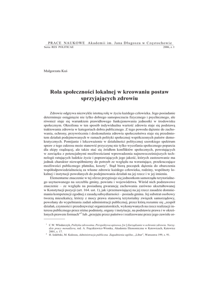 PRACE NAUKOWE A k a d e m i i i m . J a n a D ³ u g o s z a w C z ê s t o c h o w i e Seria: RES POLITICAE 2006, z. I Ma³gorzata Kuœ Rola spo³ecznoœci lokalnej w kreowaniu postaw sprzyjaj¹cych zdrowiu Zdrowie odgrywa niezwykle istotn¹ rolê w ¿yciu ka¿dego cz³owieka. Jego posiadanie determinuje osi¹gniêcie nie tylko dobrego samopoczucia fizycznego i psychicznego, ale równie¿ staje siê warunkiem prawid³owego funkcjonowania jednostki w œrodowisku spo³ecznym. Okreœlona w ten sposób indywidualna wartoœæ zdrowia staje siê podstaw¹ traktowania zdrowia w kategoriach dobra publicznego. Z tego powodu d¹¿enie do zachowania, ochrony, przywrócenia i doskonalenia zdrowia spo³eczeñstwa staje siê przedmiotem dzia³añ podejmowanych w ramach polityki spo³ecznej wspó³czesnych pañstw demokratycznych. Pomijanie i lekcewa¿enie w dzia³alnoœci politycznej szerokiego spektrum spraw z tego zakresu mo¿e stanowiæ przyczynê nie tylko wycofania spo³ecznego poparcia dla ekipy rz¹dz¹cej, ale tak¿e staæ siê Ÿród³em konfliktów spo³ecznych, powstaj¹cych w zawi¹zku z potencjalnymi mo¿liwoœciami wprowadzenia najnowoczeœniejszych technologii ratuj¹cych ludzkie ¿ycie i poprawiaj¹cych jego jakoœæ, których zastosowanie ma jednak charakter niewspó³mierny do potrzeb ze wzglêdu na wzrastaj¹ce, przekraczaj¹ce mo¿liwoœci publicznego p³atnika, koszty1. St¹d bior¹ pocz¹tek d¹¿enia do obarczenia wspó³odpowiedzialnoœci¹ za w³asne zdrowie ka¿dego cz³owieka, rodziny, wspólnoty lokalnej i instytucji powo³anych do podejmowania dzia³añ na jej rzecz i w jej imieniu. Elementarne znaczenie w tej sferze przypisuje siê jednostkom samorz¹du terytorialnego usytuowanego na szczeblu gminy, powiatu i województwa. Wœród nich podstawowe znaczenie – ze wzglêdu na posiadan¹ gwarancjê zachowania zarówno ukszta³towanej w Konstytucji pozycji (art. 164. ust. 1), jak i przemawiaj¹cej na jej rzecz zasadzie domniemania kompetencji zgodnej z zasad¹ subsydiarnoœci – posiada gmina. Jej substrat osobowy tworz¹ mieszkañcy, którzy z mocy prawa stanowi¹ terytorialny zwi¹zek samorz¹dowy, powo³any do wype³niania zadañ administracji publicznej, przez któr¹ rozumie siê „zespó³ dzia³añ, czynnoœci i przedsiêwziêæ organizatorskich, wykonywanych na rzecz realizacji interesu publicznego przez ró¿ne podmioty, organy i instytucje, na podstawie prawa i w okreœlonych prawem formach”2 lub „przejête przez pañstwo i realizowane przez jego zawis³e or1 2 C.W. W³odarczyk, Polityka zdrowotna. Perspektywa opisowa, [w:] Zarz¹dzanie w ochronie zdrowia. Narzêdzie pracy menad¿era, red. A. Fr¹czkiewicz-Wronka, Akademia Ekonomiczna w Katowicach, Katowice 2001, s. 17. H. Izdebski, M. Kulesza, Administracja publiczna. Zagadnienia ogólne, „Liber”, Warszawa 199, s. 91. 44 Ma³gorzata Kuœ gany, a tak¿e przez organy samorz¹du terytorialnego zaspokojenie zbiorowych i indywidualnych potrzeb obywateli, wynikaj¹cych ze wspó³¿ycia ludzi w spo³ecznoœciach”3. Powy¿szy sposób definiowania administracji publicznej pozwala na przedmiotowo-podmiotowe wyznaczenie jej zakresu, a tym samym przekazanie korporacjom terytorialnym istotnej czêœci zadañ publicznych, które wykonuj¹ w formie zdecentralizowanej. O zakresie przejêtych w ten sposób zadañ decyduje przepis art. 166 ust. 1, który stanowi, ¿e jednostka samorz¹du terytorialnego wykonuje – jako zadania w³asne –zadania publiczne s³u¿¹ce zaspokajaniu potrzeb wspólnoty samorz¹dowej. S¹ to dzia³ania podejmowane na rzecz dobra wspólnego/interesu publicznego, który le¿y u podstaw funkcjonowania ca³ej administracji publicznej4. Mo¿na go zdefiniowaæ jako „interes daj¹cy siê potencjalnie odnieœæ do wielu niezindywidualizowanych adresatów traktowanych jako wspólny podmiot”5. Zatem traktowaæ go nale¿y jako zewnêtrzny czynnik oceniaj¹cy i wartoœciuj¹cy dzia³ania podejmowane przez administracjê. W tym sensie „stanowi on granicê z jednej strony zakresu ingerencji administracji w stosunki spo³eczne, gospodarcze oraz prawa i wolnoœci obywateli, a z drugiej – wskazuje granicê mo¿liwoœci dowolnego zachowania siê podmiotów administrowanych”6. Uznanie odrêbnoœci celów lokalnych i regionalnych, wyra¿aj¹cych potrzeby i interesy wspólnot samorz¹dowych od celów ogólnopañstwowych i potwierdzenie koniecznoœci ich uwzglêdnienia w obrocie prawnym i systemie zarz¹dzania, jest fundamentem upodmiotowienia spo³ecznoœci lokalnej i tworzenia instytucji samorz¹du terytorialnego7. Kryzys pañstwa opiekuñczego pod koniec XX w. sprawi³, ¿e rola pañstwa w kreowaniu polityki zdrowotnej uleg³a powa¿nemu ograniczeniu. Jego wiele uprawnieñ – w wyniku dokonuj¹cego siê procesu decentralizacji w³adzy publicznej – przejê³y samorz¹dy terytorialne. Pañstwo przesta³o byæ jedynym podmiotem odpowiedzialnym za stan zdrowia obywateli. G³ównym jego zadaniem w tej sferze pozosta³o okreœlanie strategicznych celów polityki zdrowotnej, tworzenie prawno-ekonomicznych i organizacyjnych podstaw podmiotowo traktowanego prawa do zdrowia8. System prawa w opiece zdrowotnej spe³nia kilka funkcji. Do najwa¿niejszych z nich mo¿na zaliczyæ: definiowanie uprawnieñ jednostek, grup i kategorii ludnoœci w dziedzinie opieki zdrowotnej, ustalanie zasad finansowania i pokrywania kosztów opieki zdrowotnej, okreœlanie kryteriów w sferze wytwarzania zasobów opieki zdrowotnej, ustalanie wymagañ w zakresie jakoœci œwiadczonych us³ug, zakaz podejmowania czynnoœci i zachowañ szkodliwych dla zdrowia jednostki i wspólnoty9. 3 4 5 6 7 8 9 Administracja publiczna, red. J. Boæ, Kolonia Limited, Wroc³aw 2003, s.10. H. Izdebski, M. Kulesza, op. cit., s. 91–98. Prawo administracyjne, red J. Boæ. Kolonia Limited. Wroc³aw 2000, s. 24. Samorz¹d terytorialny. Ustrój i gospodarka, red. Z. Niewiadomski, Oficyna Wydawnicza Branta, Bydgoszcz 2001, s. 56. M. Kulesza, Niektóre zag