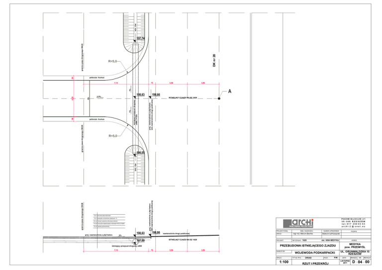 istn. rów DK nr 28 granica pasa drogowego DK28 197,74 R=5,0 50 pobocze -humus 75 3,50 3,50 198,63 2,5% proj. nawierzchnia z płyt beton. istn.nawierzchnia drogi publicznej R=5,0 198,05 proj. nawierzchnia z płyt beton. istn.nawierzchnia drogi publicznej granica pasa drogowego DK28 istn. rów granica pasa drogowego DK28 pobocze -humus istniejący przepust drogowy o600, l=12m 50 A 198,66 ISTNIEJĄCY ZJAZD NA DZ 1628 1% 0% 4,00 1% 7,15 8 cm ażurowe płyty betonowe 4 cm podsypka cementowo-piaskowa 1:4 22 cm tłuczeń kamienny klinowany klińcem 15 cm kruszywo stabilizowane cementem Rm=2,5 MPa 10 cm piasek gruboziarnisty 198,63 proj. nawierzchnia z płyt beton. 198,66 PRACOWNIA PROJEKTOWA PROJEKTOWAŁ nawierzchnia drogi publicznej DROGI 2% ISTNIEJĄCY ZJAZD NA DZ 1628 197,89 PROJEKT: IMIĘ I NAZWISKO mgr inż. Marcin Bechta NR DZIAŁKI: 1628 NUMER UPRAWNIEŃ 75 3,50 3,50 INWESTOR: SKALA: obr. 0004 MEDYKA 1:100 WOJEWODA PODKARPACKI TYTUŁ RYS. : DROGI PODPIS PDK/0113/POOD/06 PRZEBUDOWA ISTNIEJĄCEGO ZJAZDU istniejący przepust drogowy o600 7,15 PODWIS ŁOCZE 21 35-309 RZESZÓW t e l. 0 1 7 2 5 0 9 3 5 3 archi 2 @ onet.eu FAZA: RZUT I PRZEKRÓJ P.W. ADRES: MEDYKA pow. PRZEMYŚL UL. GRUNWALDZKA 15 RZESZÓW DATA LISTOPAD 2011 BRANŻA NR REWIZJA D 04 00