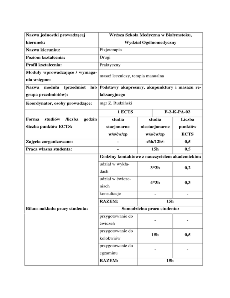 Nazwa jednostki prowadzącej Wyższa Szkoła Medyczna w Białymstoku, kierunek: Wydział Ogólnomedyczny Nazwa kierunku: Fizjoterapia Poziom kształcenia: Drugi Profil kształcenia: Praktyczny Moduły wprowadzające / wymagania wstępne: Nazwa modułu (przedmiot masaż leczniczy, terapia manualna lub Podstawy akupresury, akupunktury i masażu re- grupa przedmiotów): laksacyjnego Koordynator, osoby prowadzące: mgr Z. Rudziński 1 ECTS Forma studiów /liczba godzin F-2-K-PA-02 studia studia Liczba stacjonarne niestacjonarne punktów w/s/ćw/zp w/s/ćw/zp ECTS Zajęcia zorganizowane: - -/6h/12h/- 0,5 Praca własna studenta: - 15h 0,5 /liczba punktów ECTS: Godziny kontaktowe z nauczycielem akademickim: udział w wykładach udział w ćwiczeniach konsultacje 3*2h 0,2 4*3h 0,3 - - RAZEM: Bilans nakładu pracy studenta: 15h Samodzielna praca studenta: przygotowanie do - - 15h 0,5 - - ćwiczeń przygotowanie do kolokwiów przygotowanie do egzaminu RAZEM: 15h Cele modułu: Celem modułu jest zapoznanie się z poszczególnymi formami i technikami masażu relaksacyjnego, akupunktury i akupresury oraz ich działaniem na organizm człowieka. Student będzie umiał zastosować ww. formy terapii w wybranych jednostkach chorobowych. Efekty kształcenia: Odniesienie do Przedmiotowy Efekty kształcenia efekt kształcenia kierunkowych efektów kształcenia P_W01 Wylicza cele wykonania poszczególnych form masażu K2_W32 i akupunktury P_W02 Wyjaśnia metodyką wykonania poszczególnych form K2_W32 terapii i masażu i akupunktury oraz ich działanie na organizm człowieka P_W03 Rozpoznaje jednostki chorobowe, w których można K2_W32 wykonać zabiegi terapii przy użyciu akupunktury P_W04 Omawia techniki masażu relaksacyjnego i punkty aku- K2_W32 presury P_U01 Organizuje stanowisko pracy, wymienia sprzęt po- K2_U15 trzebny do wykonania zabiegu oraz dobiera formę terapii i poprawnie ją wykonuje w danej jednostce chorobowej P_U02 Omawia poznane na zajęciach techniki i poprawnie je K2_U15 wykonuje P_U03 K2_U30 Wykonuje techniki diagnostyczne poszczególnych czę- K2_U30 ści ciała P_U04 Wykonuje poszczególne metody akupunktury i masażu K2_U15 relaksacyjnego oraz dostosowuje do poszczególnych jednostek chorobowych i stanu psychicznego pacjenta P_K01 Przestrzega zasad kultury i etyki oraz tajemnicy zawo- K2_K 06 dowej P_K02 K2_K14 Jest kreatywny i konsekwentny w realizacji zadań oraz K2_K04 przewiduje skutki podejmowanych działań P_K03 Aktualizuje wiedzę i doskonali umiejętności zawodo- K2_K01 we P_K04 Potrafi ponosić odpowiedzialność za podejmowane K2_K05 działania P_K05 K2_K11 Współpracuje w zespole Wiedza – student: • Wylicza cele wykonania poszczególnych form masażu i akupunktury • Wyjaśnia metodyką wykonania poszczególnych form terapii i masażu i akupunktury oraz ich działanie na organizm człowieka • Rozpoznaje jednostki chorobowe, w których można wykonać zabiegi terapii przy użyciu akupunktury • Omawia techniki masażu relaksacyjnego i punkty akupresury. Umiejętności – student: • Organizuje stanowisko pracy, wymienia sprzęt potrzebny do wykonania zabiegu oraz dobiera formę terapii i poprawnie ją wykonuje w danej jednostce chorobowej • Omawia poznane na zajęciach techniki i poprawnie je wykonuje • Wykonuje techniki diagnostyczne poszczególnych części ciała • Wykonuje poszczególne metody akupunktury i masażu relaksacyjnego oraz dostosowuje do poszczególnych jednostek chorobowych i stanu psychicznego pacjenta. Kompetencje społeczne – student: • Przestrzega zasad kultury i etyki oraz tajemnicy zawodowej • Jest kreatywny i konsekwentny w realizacji zadań oraz przewiduje skutki podejmowanych działań • Aktualizuje wiedzę i doskonali umiejętności zawodowe • Potrafi ponosić odpowiedzialność za podejmowane działania • Współpracuje w zespole. Forma zajęć/metody dydaktyczne: Seminaria, pokaz multimedialny, ćwiczenia praktyczne, zajęcia ćwiczeniowe, omawianie przypadków, studium przypadku Forma i warunki zaliczenia przedmiotu w odniesieniu do efektów kształcenia. Nr efektu Metody weryfikacji efektu kształcenia kształcenia Formujące: Podsumowujące: P_W01 Ocena przygotowania do zajęć Zaliczenie pisemne – student generuje / P_W02 Wejściówki na ćwiczeniach rozpoznaje odpowiedź (esej, raport; P_W03 Sprawdzanie wiedzy w trakcie ćwiczeń krótkie strukturyzowane pytania /SSQ/; P_W04 Kolokwium pisemne test wielokrotnego wyboru /MCQ/; test wielokrotnej odpowiedzi /MRQ/; test dopasowania; test T/N; test uzupełniania odpowiedzi) P_U01 Obserwacja pracy studenta Obiektywny Strukturyzowany Egza- P_U02 Zaliczenie poszczególnych czynności min Kliniczny /OSCE/ - egzamin zor- P_U03 Opis przypadku ganizowany w postaci stacji z określo- P_U04 Ocena aktywności studenta w czasie nym zadaniem do wykonania zajęć Mini-CEX (mini – clinical Dyskusja w czasie ćwiczeń examination) Zaliczenia cząstkowe Kolokwium praktyczne ocena w sys- Realizacja zleconego zadania temie punktowym Ocena przygotowania do zajęć Próba pracy P_K01 Obserwacja pracy studenta Przedłużona obserwacja przez opieku- P_K02 Obserwacja pracy na ćwiczeniach na / nauczyciela prowadzącego P_K03 Bieżąca informacja zwrotna Ocena 360° (opinie nauczycieli, kole- P_K04 Dyskusja w czasie ćwiczeń gów/koleżanek, P_K05 Ocena wyciąganych wniosków z eks- współpracowników) perymentów Treści programowe: Seminaria – 6 godzin 1. podstawy teoretyczne akupunktury 1h 2. metodyka wykonania akupunktury i akupresury 1h 3. zastosowanie w jednostkach chorobowych 2h 4. rodzaje i metodyka wykonania masaży relaksacyjnego 2h Ćwiczenia – 12 godzin pacjentów, innych 1. metodyka wykonania akupunktury, akupresury, elektropunktury i moksy 2h 2. diagnostyka stosowana w akupunkturze 2h 3. dobór punktów do jednostek chorobowych 2h 4. wykonanie zabiegów akupresury w jednostkach chorobowych 2h 5. wykonanie różnych form masażu relaksacyjnego 4h Literatura podstaw