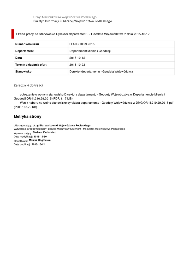 Urząd Marszałkowski Województwa Podlaskiego Biuletyn Informacji Publicznej Województwa Podlas kieg o Oferta pracy na stanowisko Dyrektor departamentu - Geodeta Województwa z dnia 2015-10-12 Numer konkursu OR-III.210.29.2015 Departament Departament Mienia i Geodezji Data 2015-10-12 Termin składania ofert 2015-10-22 Stanowisko Dyrektor departamentu - Geodeta Województwa Załączniki do treści ogłoszenie o wolnym stanowisku Dyrektora departamentu - Geodety Województwa w Departamencie Mienia i Geodezji OR-III.210.29.2015 (PDF, 1.17 MB) Wynik naboru na wolne stanowisko dyrektora departamentu - Geodety Województwa w DMG OR-III.210.29.2015.pdf (PDF, 165.79 KB) Metryka strony Udostępniający: Urząd Marszałkowski Województwa Podlaskiego Wytwarzający/odpowiadający: Baszko Mieczysław Kazimierz - Marszałek Województwa Podlaskiego Wprowadzający: Barbara Zachowicz Data modyfikacji: 2015-12-30 Opublikował: Monika Rogowska Data publikacji: 2015-10-12