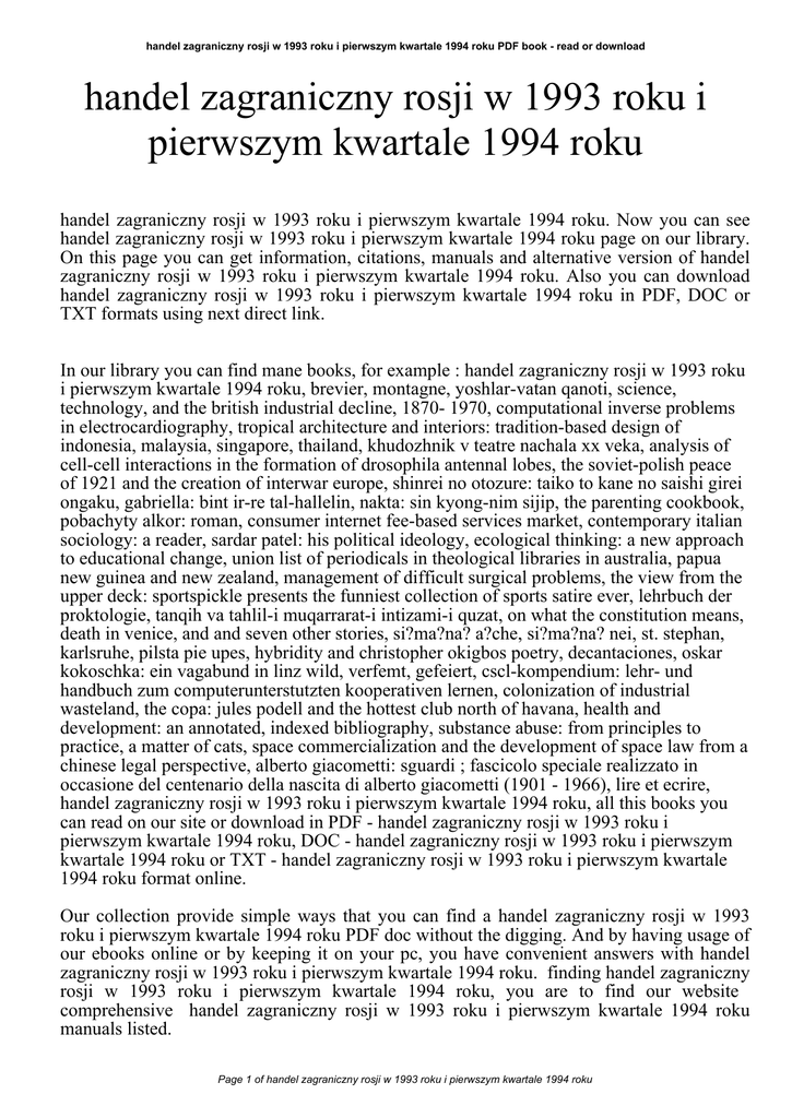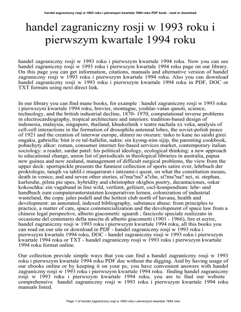 handel zagraniczny rosji w 1993 roku i pierwszym kwartale 1994 roku PDF book - read or download handel zagraniczny rosji w 1993 roku i pierwszym kwartale 1994 roku handel zagraniczny rosji w 1993 roku i pierwszym kwartale 1994 roku. Now you can see handel zagraniczny rosji w 1993 roku i pierwszym kwartale 1994 roku page on our library. On this page you can get information, citations, manuals and alternative version of handel zagraniczny rosji w 1993 roku i pierwszym kwartale 1994 roku. Also you can download handel zagraniczny rosji w 1993 roku i pierwszym kwartale 1994 roku in PDF, DOC or TXT formats using next direct link. In our library you can find mane books, for example : handel zagraniczny rosji w 1993 roku i pierwszym kwartale 1994 roku, brevier, montagne, yoshlar-vatan qanoti, science, technology, and the british industrial decline, 1870- 1970, computational inverse problems in electrocardiography, tropical architecture and interiors: tradition-based design of indonesia, malaysia, singapore, thailand, khudozhnik v teatre nachala xx veka, analysis of cell-cell interactions in the formation of drosophila antennal lobes, the soviet-polish peace of 1921 and the creation of interwar europe, shinrei no otozure: taiko to kane no saishi girei ongaku, gabriella: bint ir-re tal-hallelin, nakta: sin kyong-nim sijip, the parenting cookbook, pobachyty alkor: roman, consumer internet fee-based services market, contemporary italian sociology: a reader, sardar patel: his political ideology, ecological thinking: a new approach to educational change, union list of periodicals in theological libraries in australia, papua new guinea and new zealand, management of difficult surgical problems, the view from the upper deck: sportspickle presents the funniest collection of sports satire ever, lehrbuch der proktologie, tanqih va tahlil-i muqarrarat-i intizami-i quzat, on what the constitution means, death in venice, and and seven other stories, si?ma?na? a?che, si?ma?na? nei, st. stephan, karlsruhe, pilsta pie upes, hybridity and christopher okigbos poetry, decantaciones, oskar kokoschka: ein vagabund in linz wild, verfemt, gefeiert, cscl-kompendium: lehr- und handbuch zum computerunterstutzten kooperativen lernen, colonization of industrial wasteland, the copa: jules podell and the hottest club north of havana, health and development: an annotated, indexed bibliography, substance abuse: from principles to practice, a matter of cats, space commercialization and the development of space law from a chinese legal perspective, alberto giacometti: sguardi ; fascicolo speciale realizzato in occasione del centenario della nascita di alberto giacometti (1901 - 1966), lire et ecrire, handel zagraniczny rosji w 1993 roku i pierwszym kwartale 1994 roku, all this books you can read on our site or download in PDF - handel zagraniczny rosji w 1993 roku i pierwszym kwartale 1994 roku, DOC - handel zagraniczny rosji w 1993 roku i pierwszym kwartale 1994 roku or TXT - handel zagraniczny rosji w 1993 roku i pierwszym kwartale 1994 roku format online. Our collection provide simple ways that you can find a handel zagraniczny rosji w 1993 roku i pierwszym kwartale 1994 roku PDF doc without the digging. And by having usage of our ebooks online or by keeping it on your pc, you have convenient answers with handel zagraniczny rosji w 1993 roku i pierwszym kwartale 1994 roku. finding handel zagraniczny rosji w 1993 roku i pierwszym kwartale 1994 roku, you are to find our website comprehensive handel zagraniczny rosji w 1993 roku i pierwszym kwartale 1994 roku manuals listed. Page 1 of handel zagraniczny rosji w 1993 roku i pierwszym kwartale 1994 roku handel zagraniczny rosji w 1993 roku i pierwszym kwartale 1994 roku PDF book - read or download These review site is the biggest of these which may have hundreds of thousands of different literally products represented. You will also see that we now have specific sites catered to different product types or categories, brands or niches related to handel zagraniczny rosji w 1993 roku i pierwszym kwartale 1994 roku. So depending on just what you are searching, you will be able to choose ebooks handel zagraniczny rosji w 1993 roku i pierwszym kwartale 1994 roku to fit your own needs, handel zagraniczny rosji w 1993 roku i pierwszym kwartale 1994 roku. Page 2 of handel zagraniczny rosji w 1993 roku i pierwszym kwartale 1994 roku
