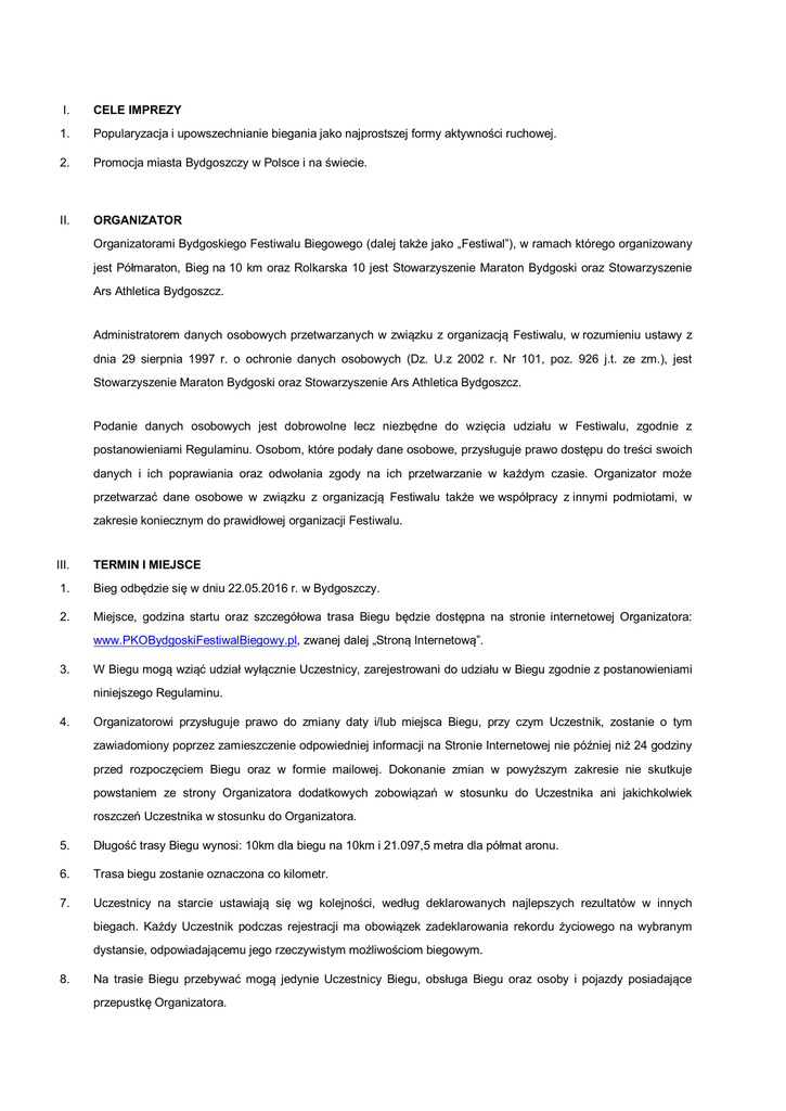 I. CELE IMPREZY 1. Popularyzacja i upowszechnianie biegania jako najprostszej formy aktywności ruchowej. 2. Promocja miasta Bydgoszczy w Polsce i na świecie. II. ORGANIZATOR Organizatorami Bydgoskiego Festiwalu Biegowego (dalej także jako „Festiwal”), w ramach którego organizowany jest Półmaraton, Bieg na 10 km oraz Rolkarska 10 jest Stowarzyszenie Maraton Bydgoski oraz Stowarzyszenie Ars Athletica Bydgoszcz. Administratorem danych osobowych przetwarzanych w związku z organizacją Festiwalu, w rozumieniu ustawy z dnia 29 sierpnia 1997 r. o ochronie danych osobowych (Dz. U.z 2002 r. Nr 101, poz. 926 j.t. ze zm.), jest Stowarzyszenie Maraton Bydgoski oraz Stowarzyszenie Ars Athletica Bydgoszcz. Podanie danych osobowych jest dobrowolne lecz niezbędne do wzięcia udziału w Festiwalu, zgodnie z postanowieniami Regulaminu. Osobom, które podały dane osobowe, przysługuje prawo dostępu do treści swoich danych i ich poprawiania oraz odwołania zgody na ich przetwarzanie w każdym czasie. Organizator może przetwarzać dane osobowe w związku z organizacją Festiwalu także we współpracy z innymi podmiotami, w zakresie koniecznym do prawidłowej organizacji Festiwalu. III. TERMIN I MIEJSCE 1. Bieg odbędzie się w dniu 22.05.2016 r. w Bydgoszczy. 2. Miejsce, godzina startu oraz szczegółowa trasa Biegu będzie dostępna na stronie internetowej Organizatora: www.PKOBydgoskiFestiwalBiegowy.pl, zwanej dalej „Stroną Internetową”. 3. W Biegu mogą wziąć udział wyłącznie Uczestnicy, zarejestrowani do udziału w Biegu zgodnie z postanowieniami niniejszego Regulaminu. 4. Organizatorowi przysługuje prawo do zmiany daty i/lub miejsca Biegu, przy czym Uczestnik, zostanie o tym zawiadomiony poprzez zamieszczenie odpowiedniej informacji na Stronie Internetowej nie później niż 24 godziny przed rozpoczęciem Biegu oraz w formie mailowej. Dokonanie zmian w powyższym zakresie nie skutkuje powstaniem ze strony Organizatora dodatkowych zobowiązań w stosunku do Uczestnika ani jakichkolwiek roszczeń Uczestnika w stosunku do Organizatora. 5. Długość trasy Biegu wynosi: 10km dla biegu na 10km i 21.097,5 metra dla półmat aronu. 6. Trasa biegu zostanie oznaczona co kilometr. 7. Uczestnicy na starcie ustawiają się wg kolejności, według deklarowanych najlepszych rezultatów w innych biegach. Każdy Uczestnik podczas rejestracji ma obowiązek zadeklarowania rekordu życiowego na wybranym dystansie, odpowiadającemu jego rzeczywistym możliwościom biegowym. 8. Na trasie Biegu przebywać mogą jedynie Uczestnicy Biegu, obsługa Biegu oraz osoby i pojazdy posiadające przepustkę Organizatora. 9. IV. 1. 2. Automatyczny pomiar czasu wykonany będzie przy wykorzystaniu chipa dostarczonemu każdemu Uczestnikowi. LIMIT CZASU I KONTROLE Uczestników obowiązuje limit czasu wynoszący a. 10 KM: 01h:40min:00s, liczony od strzału startera (czas brutto). b. Półmaraton: 03h:30min:00s, liczony od strzału startera (czas brutto). Uczestnicy, którzy nie dobiegną do mety w limicie czasu, zobowiązani są do przerwania Biegu i zejścia z trasy. Uczestnicy ci nie będą klasyfikowani. 3. Uczestnicy, którzy po upływie regulaminowego czasu pozostaną na trasie czynią to na własną odpowiedzialność, stosowną do obowiązujących przepisów ruchu drogowego oraz Kodeksu cywilnego. W przypadku, o którym mowa w zdaniu poprzednim, Organizator nie ponosi odpowiedzialności z tytułu uszkodzenia ciała lub uszczerbku na zdrowiu tych Uczestników. V. PUNKTY NAWADNIANIA I MEDYCZNE 1. Punkt nawadniania będzie zlokalizowany co najmniej dwa razy na każdej 10-kilometrowej pętli, ok. na 4 i 7,5 kilometra pętli Biegu. 2. Punkty medyczne będą znajdowały się na ok. 4-tym km pętli Biegu oraz na mecie i będą obsługiwane przez ratowników medycznych. VI. 1. UCZESTNICTWO Impreza ma charakter otwarty. Prawo startu mają osoby, które najpóźniej w dniu 22.05.2016 r. ukończą 18 lat oraz spełnią warunki, o których mowa poniżej. 2. Prawo startu w Biegu na 10km mają również osoby, które najpóźniej w dniu 22.05.2016 r. ukończą 16 lat, pod warunkiem zarejestrowania takiej osoby przez opiekuna prawnego za pośrednictwem Strony Internetowej oraz wypełnienia zgody na uczestnictwo w Biegu podpisanej przez opiekuna prawnego Uczestnika, która to zgoda będzie dostępna w Biurze Zawodów. 3. Osoby opisane w ust. VI pkt. 2 powyżej nie mogą samodzielnie rejestrować się do systemu zgłoszeniowego. 4. Rodzice lub prawni opiekunowie rejestrujący osobę niepełnoletnią, przyjmują na siebie odpowiedzialność za start nieletniego i w tym zakresie zwalniają z odpowiedzialności Organizatora. 5. Warunkiem udziału w Biegu jest: a. Wypełnienie formularza zgłoszeniowego. b. Wyrażenie zgody na przestrzeganie niniejszego Regulaminu oraz przepisów IAAF (International Association of Athletics Federations), dostępnych na stronie internetowej www.iaaf.org oraz PZLA (Polski Związek Lekkiej Atletyki), dostępnych na stronie internetowej www.pzla.pl. c. Akceptacja udziału w Biegu i imprezach towarzyszących na własną odpowiedzialność, mając na uwadze niebezpieczeństwa i ryzyka wynikające z charakteru i długości Biegu, które mogą polegać m.in. na ryzyku utraty (pogorszenia) zdrowia lub życia. W Biegu powinny uczestniczyć wyłącznie osoby posiadające dobry stan zdrowia, nieposiadające przeciwwskazań medycznych do uczestnictwa w Biegu. d. Wyrażenie odrębnej zgody na przetwarzanie danych osobowych Uczestnika podanych w formularzu zgłoszeniowym, o którym mowa powyżej, w tym w oświadczeniu Uczestnika o stanie zdrowia pozwalającym mu na udział w Festiwalu, a także zgody na zamieszczanie danych osobowych w postaci imienia, nazwiska, płci, roku urodzenia, narodowości, adresu e-mail oraz wizerunku w przekazach telewizyjnych, radiowych, internetowych i w formie drukowanej oraz na przesyłanie przez Organizatora na wskazany adres mailowy Uczestników informacji dotyczących promoc