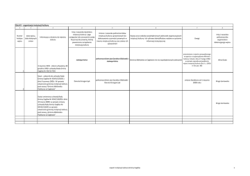 Dział II - organizacja instytucji kultury 1 2 Numer kolejny wpisu data wpisu, data kolejnych zmian 3 4 5 6 Informacja o złożeniu do rejestru statutu Imię i nazwisko dyrektora instytucji kultury i jego zastępców lub oznaczenie osoby fizycznej lub prawnej, której powierzono zarządzanie instytucją kultury Imiona i nazwiska pełnomocników instytucji kultury uprawnionych do dokonywania czynności prawnych w imeniu instytucji kultury oraz zakres ich upoważnień Nazwa oraz siedziba wyodrębnionych jednostek organizacyjnych instytucji kultury i ich cyfrowe identyfikatory nadane w systemie informacji statystycznej Jadwiga Kalisz 1 3 stycznia 1993 - statut uchwalony 30 grudnia 1992r uchwałą Rady Gminy Cegłów Nr XIX/117/92 2 Staut - załacznik do uchwały Rady Gminy Cegłów Nr XXVIII/159/05 z dnia 9 czerwca 2005r. W sprawie utworzenia gminnej instytucji kultury pod nazwą "Gminna Biblioteka Publiczna w Cegłowie" Danuta Grzegorczyk 7 8 Uwagi Imię i nazwisko pełnomocnika organizatora dokonującego wpisu przeniesiono z rejestru prowadzonego w oparciu o rozporządzenie Ministra pełnomocnikiem jest Dyrektor Biblioteki Kultury i Sztuki z dnia 17 lutego 1992r Gminna Biblioteka w Cegłowie nie ma wyodrębnionych jednostek w sprawie sposobu prowadzenia Jadwiga Kalisz rejstru instytucji kultury (Dz.U. z 1992r nr 20, poz. 80) pełnomocnikiem jest Dyrektor Biblioteki Danuta Grzegorczyk Statut zmieniony uchwałą Rady Gminy Cegłów Nr XXVI/130/09 z dnia 19 marca 2009r w sprawie zmiany uchwały Rady Gminy Cegłów Nr XXVIII/159/05 w sprawie utworzenia gminnej instytucji kultury pod nazwą „Gminna Biblioteka Publiczna w Cegłowie” zmiana Dyrektora od 1 stycznia 2008 roku Alina Duda Kinga Łoniewska Kinga Łoniewska rejestr instytucji kultury Gminy Cegłów 1